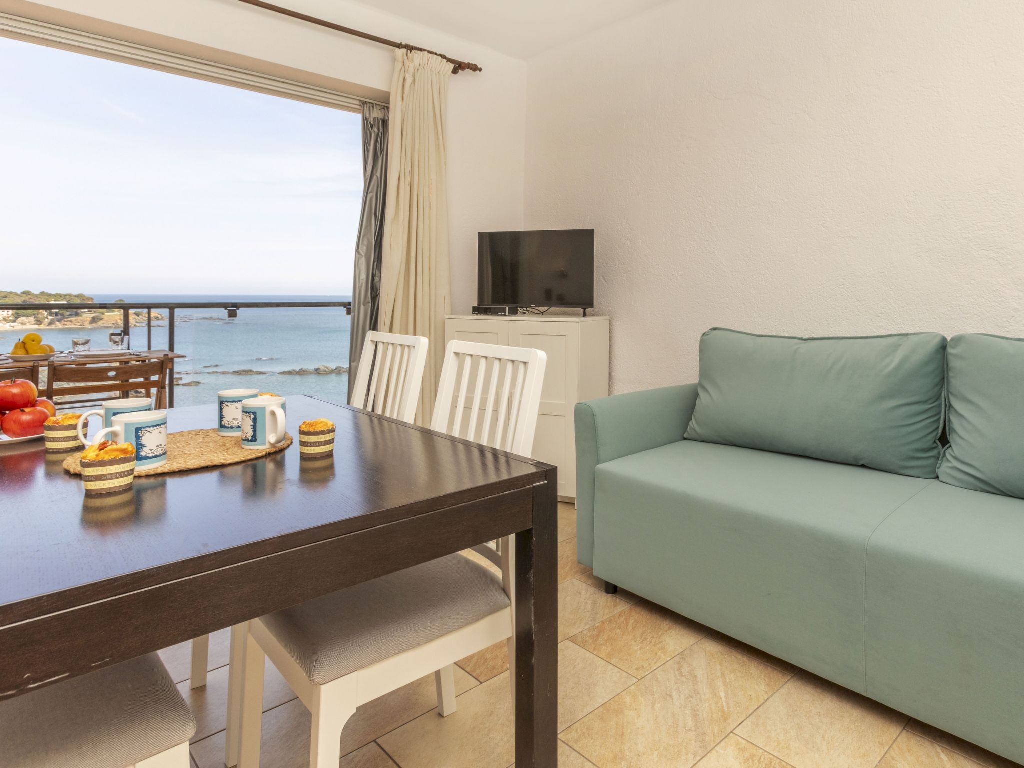 "Mar i Muntanya III", 2-room apartment 40 m2 on 1st floor, north facing position. Simple furnishings: living/dining room with 2 sofabeds (120 cm, length 180 cm), dining table and satellite TV (flat screen), air conditioning. Exit to the terrace. 1 room with 1 french bed (1 x 135 cm, length 190 cm). Small kitchen (4 hot plates, microwave, electric coffee machine). Shower/WC. Small terrace. Terrace furniture. Beautiful view of the sea. Facilities: washing machine, hair dryer. Internet (WiFi). Parking space n 20 (1 car). Please note: non-smokers only. Maximum 1 pet/ dog allowed. TV only ES, FR. HUTG-005127 // Reg. Nr.: ESFCTU00001702000026698500000000000000000HUTG-0051272