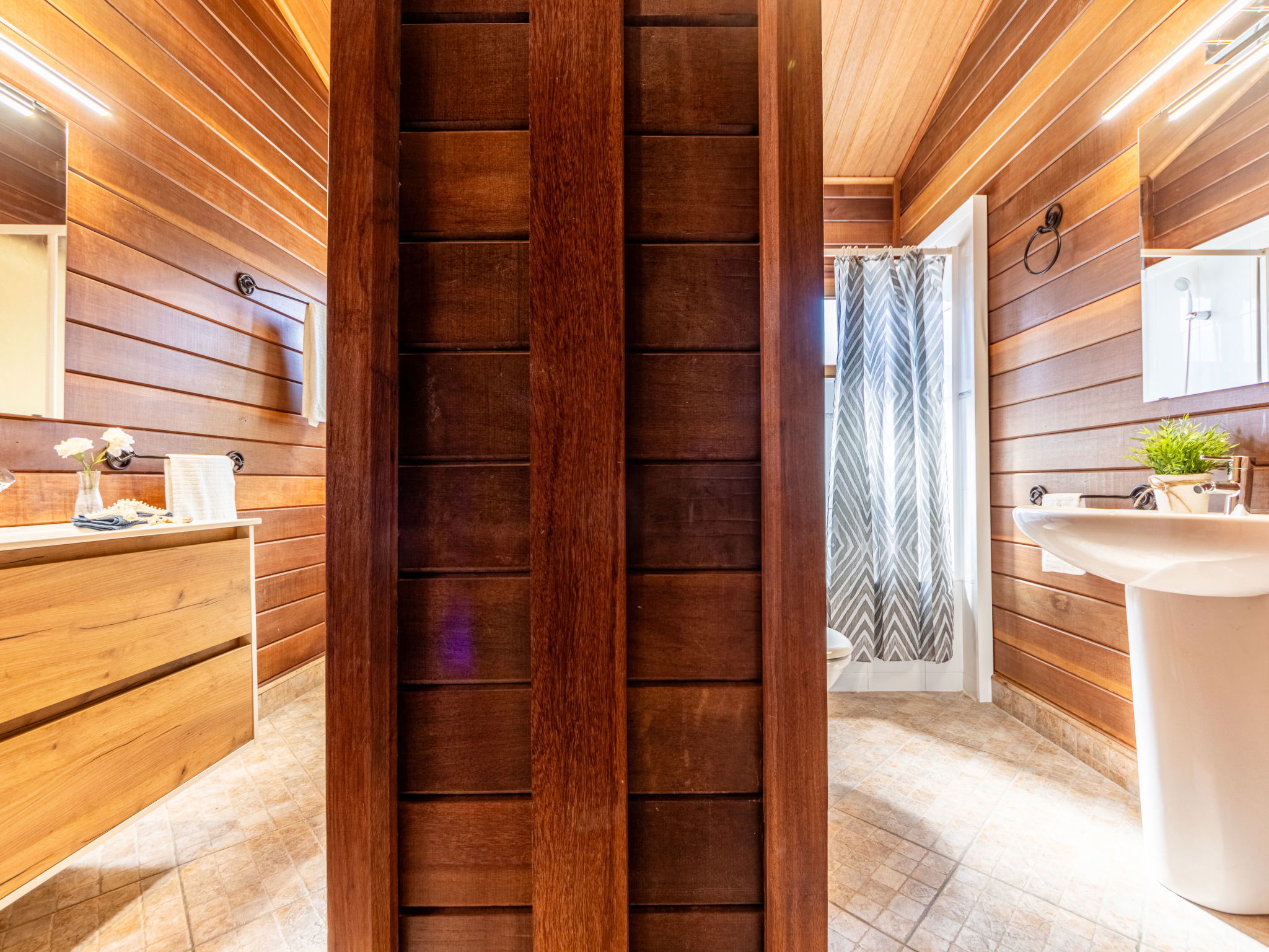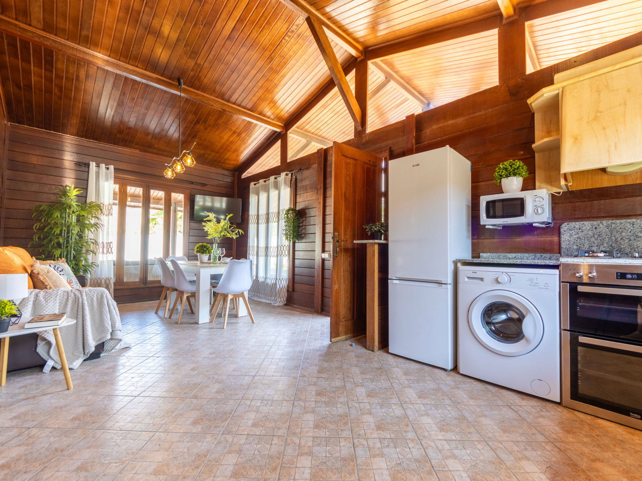 "Tropical 3", 4-room chalet 82 m2, on the ground floor. Bright, beautiful and cosy furnishings: living/dining room with dining table and digital TV. Exit to the garden, to the terrace, to the swimming pool. 2 double bedrooms, each room with 1 french bed (135 cm, length 190 cm). 1 double bedroom with 2 beds (90 cm, length 190 cm). Open kitchen in the entrance (4 hot plates, oven, toaster, microwave, freezer, electric coffee machine, pizza oven). Exit to the terrace, to the swimming pool. Shower/WC, hip bath/WC. Air-conditioning, forced-air heating. Terrace furniture, barbecue, deck chairs, covered balcony. Facilities: washing machine, iron, mosquito net, hair dryer. Internet (WiFi, free). Parking at the house. Suitable for families. Maximum 2 pets/ dogs allowed. HUTTE-038554 // Reg. Nr.: ESFCTU0000430190001019260000000000000000HUTTE-0000160