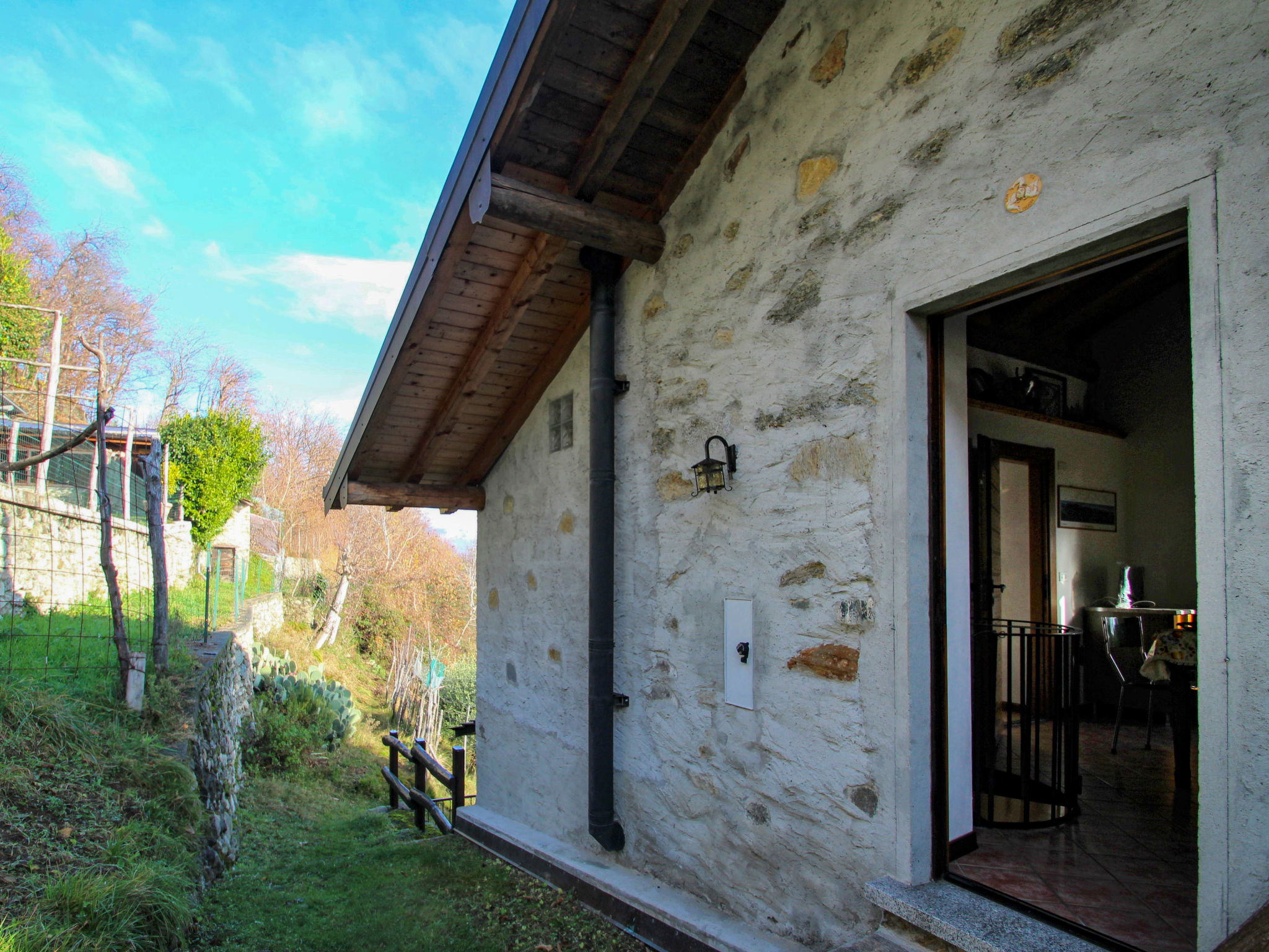 "rustico" cottage "Cascina Ulivi", surrounded by trees. Above Cremia, in the hamlet Costa, in a quiet, elevated position on a slope, 3 km from the lake, in the countryside. Private: property 1'000 m2, terraced garden with trees. 150 m long bumpy, steep, narrow motor access to the house (150 m via unmade road, ramp). Stepped path (3 steps) to the house. Parking at 150 m. Grocery 1.2 km, supermarket 5 km, restaurant 3 km, bar 1.3 km, bus stop 3 km, pebble beach "San Vito" 3.3 km. Marina 3.5 km. Nearby attractions: Museo della Barca Lariana, Chiesa di S.Martino, Menaggio, Bellagio, Varenna. Well-known lakes can easily be reached: Lago di Mezzola, Lago di Lugano. Hiking paths: Sasso di Musso- Chiesa Santa Eufemia, Chiesa San Domenico-Cremia, Rifugio La Canua. Please note: car recommended. Animals in the neighbourhood. Access via a steep concrete ramp (approx. 180m wide) plus a short gravel path, not suitable for low-suspension cars. Small cars can be parked 20m from the house while the others about 150m.