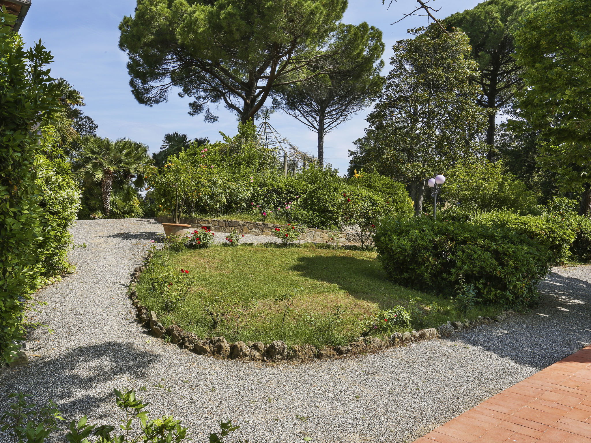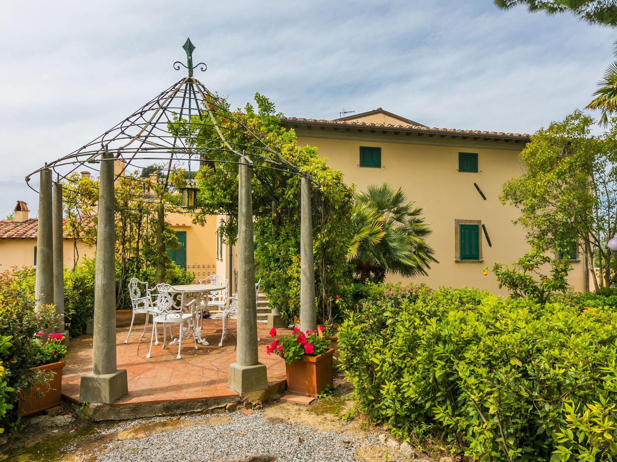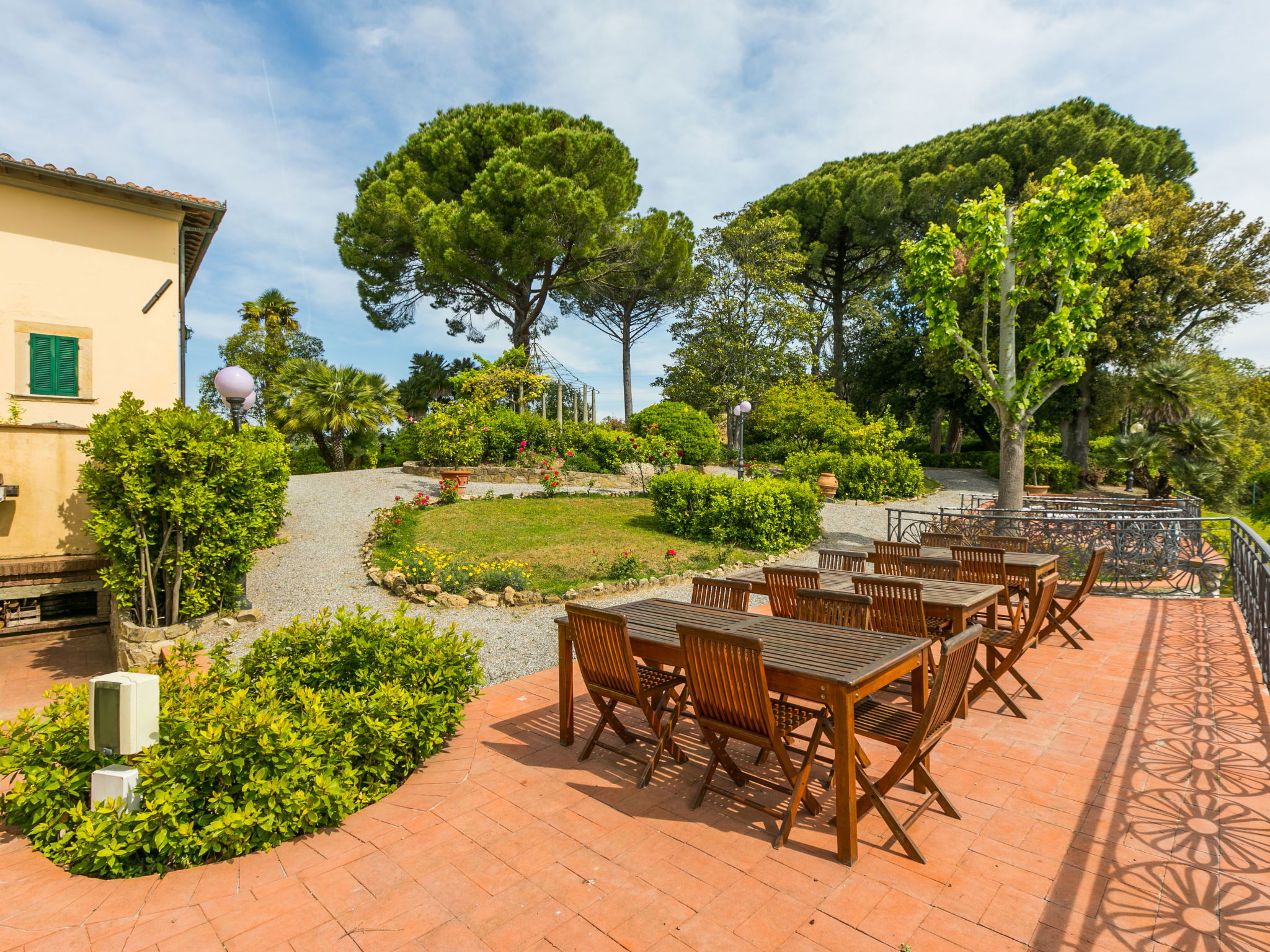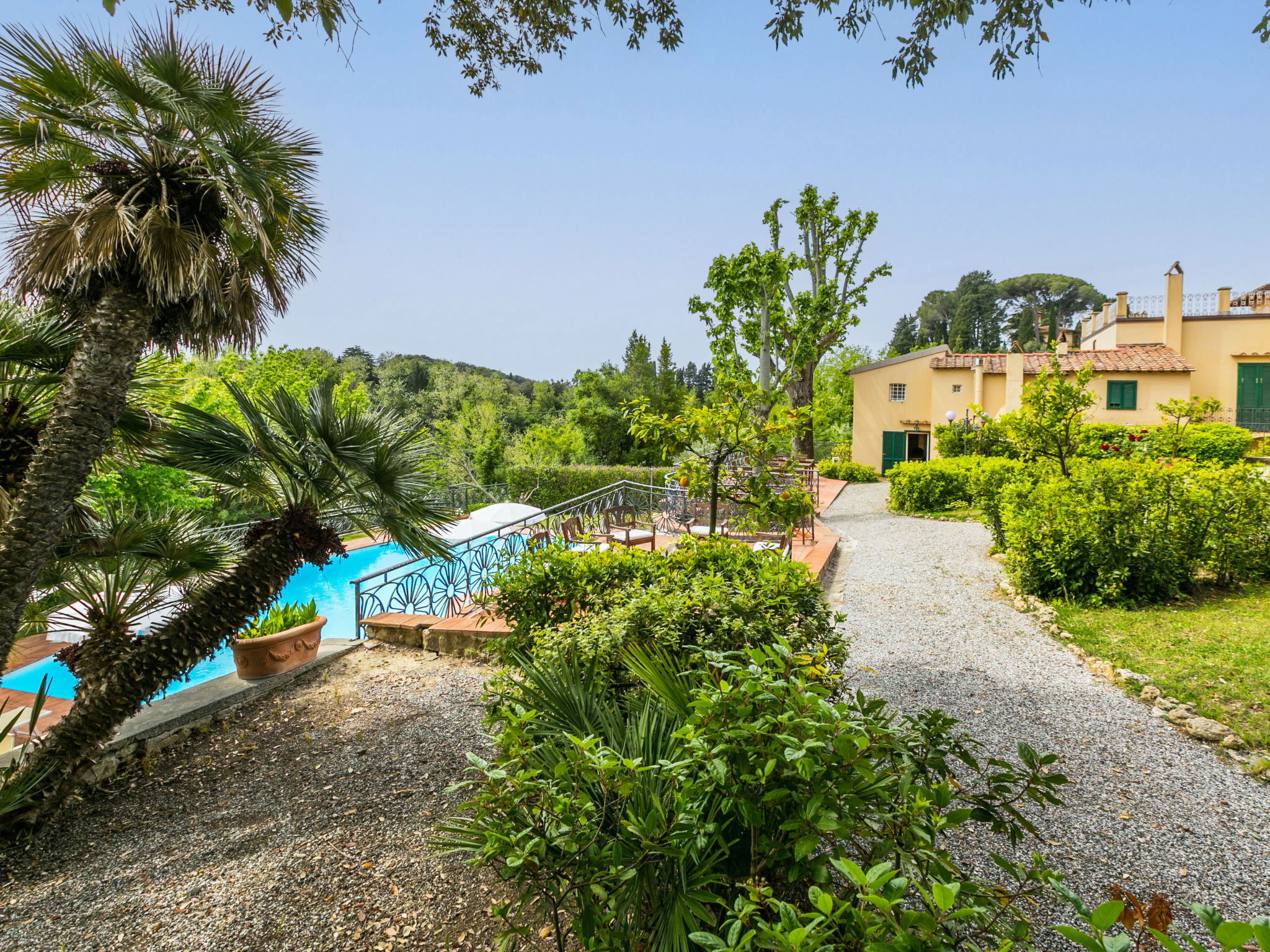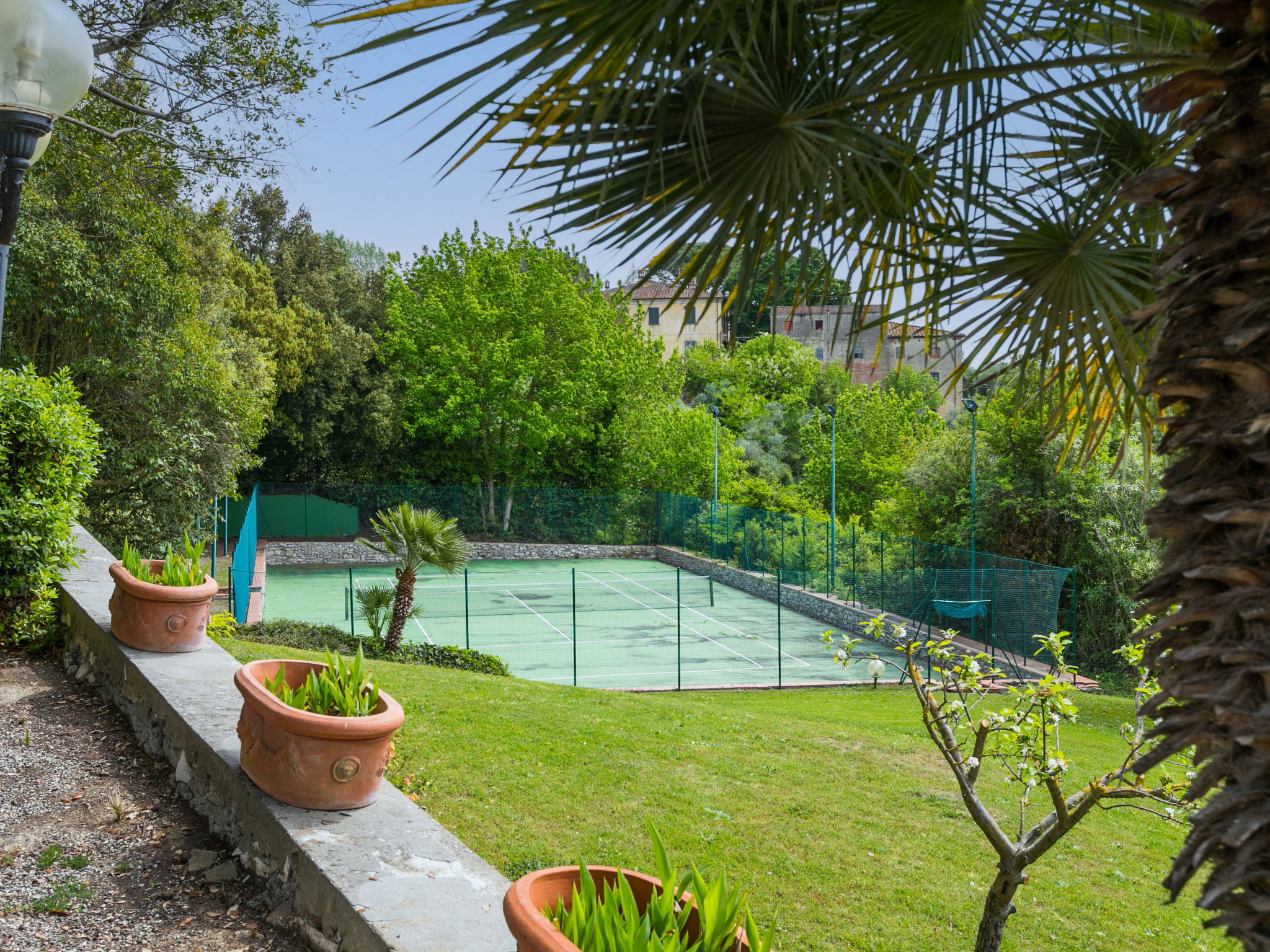 Exclusive and elegant 19th century property located in the heart of the Tuscan hills. Historical country house "Villa La Guardia Vecchia", detached, built in 1700, renovated, surrounded by meadows. 700 m from the centre of Crespina Lorenzana, 30 km from the centre of Pisa, 33 km from the centre of Livorno, in a secluded, quiet, sunny position on top of a hill, 30 km from the sea, in the countryside. Private: park (fenced), flowers and trees, beautiful garden to relax, swimming pool (15 x 7 m, depth 120 - 275 cm, seasonal availability: 01.May. - 01.Oct.). Shower/WC in the pool area, tennis (1 x hard court), table tennis, garden furniture, barbecue. In the house: billiard table, heating to be paid on the spot, heating available only from 01.Nov. - 15.Apr.. Parking on the premises. Restaurant 1 km, bus stop 500 m, sandy beach "Castiglioncello" 35 km, rocky beach "Calafuria" 38 km, thermal baths "Cascina Terme" 10 km. Golf course (9 hole) 30 km, riding stable 500 m. Nearby attractions: Villa Belvedere 500 m, Certosa di Calci 23 km, Lajatico 29 km, Volterra 46 km, San Gimignano 55 km, Lucca 63 km. Please note: car recommended. Suitable for families. Groups of teenagers on request only. Suitable for events. The villa is surrounded by a splendid park with an Italian garden, inside which there are benches, gazebos, fruit trees, a splendid swimming pool and a tennis court. This Villa, an ideal place to spend exclusive relaxing holidays, also offers the possibility of hosting events, weddings and meetings. Adjacent to the villa, with an independent entrance, is the caretaker's house.