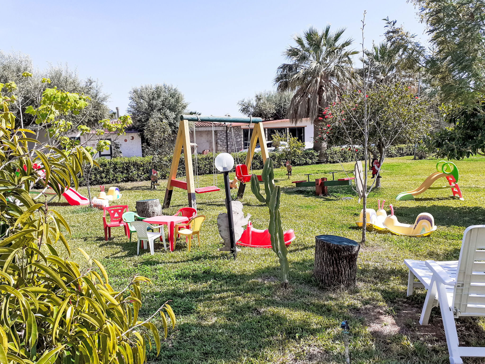 Santa Maria di Ricadi 8 km from Tropea: Small, child friendly, cosy holiday village "Heaven", surrounded by trees. In the district Santa Maria di Ricadi, in a sunny position, 550 m from the sea, 550 m from the beach. For shared use: well-kept garden plants and flowers, lawn for sunbathing, swimming pool (12 x 6 m, depth 90 - 150 cm, seasonal availability: 16.Apr. - 29.Oct. pool opening hours: 08:00-14:00 and 16:00-20:00). Outdoor shower, volleyball court, patio, garden furniture, barbecue, children's playground (slide, swing). In the complex: reception, restaurant, bar, WiFi, table football, sun terrace, washing machine (for shared use, extra). Linen change (suppl. charge extra). Towel change (suppl. charge extra). Breakfast and half board possible (extra). Airport transfer (extra). Parking on the premises. Shop, grocery, supermarket, restaurant, bar 500 m, 10 minute walk to the centre, bus stop 1 km, railway station "Ricadi" 5 km, sandy beach "Santa Maria di Ricadi" 550 m. Nearby attractions: Baia di Grotticelle 1 km, Tropea 8 km, Faro Capo Vaticano 3 km, Vibo Valentia 30 km, Reggio Calabria 90 km. Please note: suitable for families, baby equipment on request. Local sale of farm products. The photograph shows a typical example. Additional accommodations can be booked. The holiday properties may differ in situation, size and location. Included in the price: swimming pool, shuttle to/from the sea, parking, transfer to Ricadi station arrival/departure. The apartments are located on the ground or floor and have a veranda or patio.
