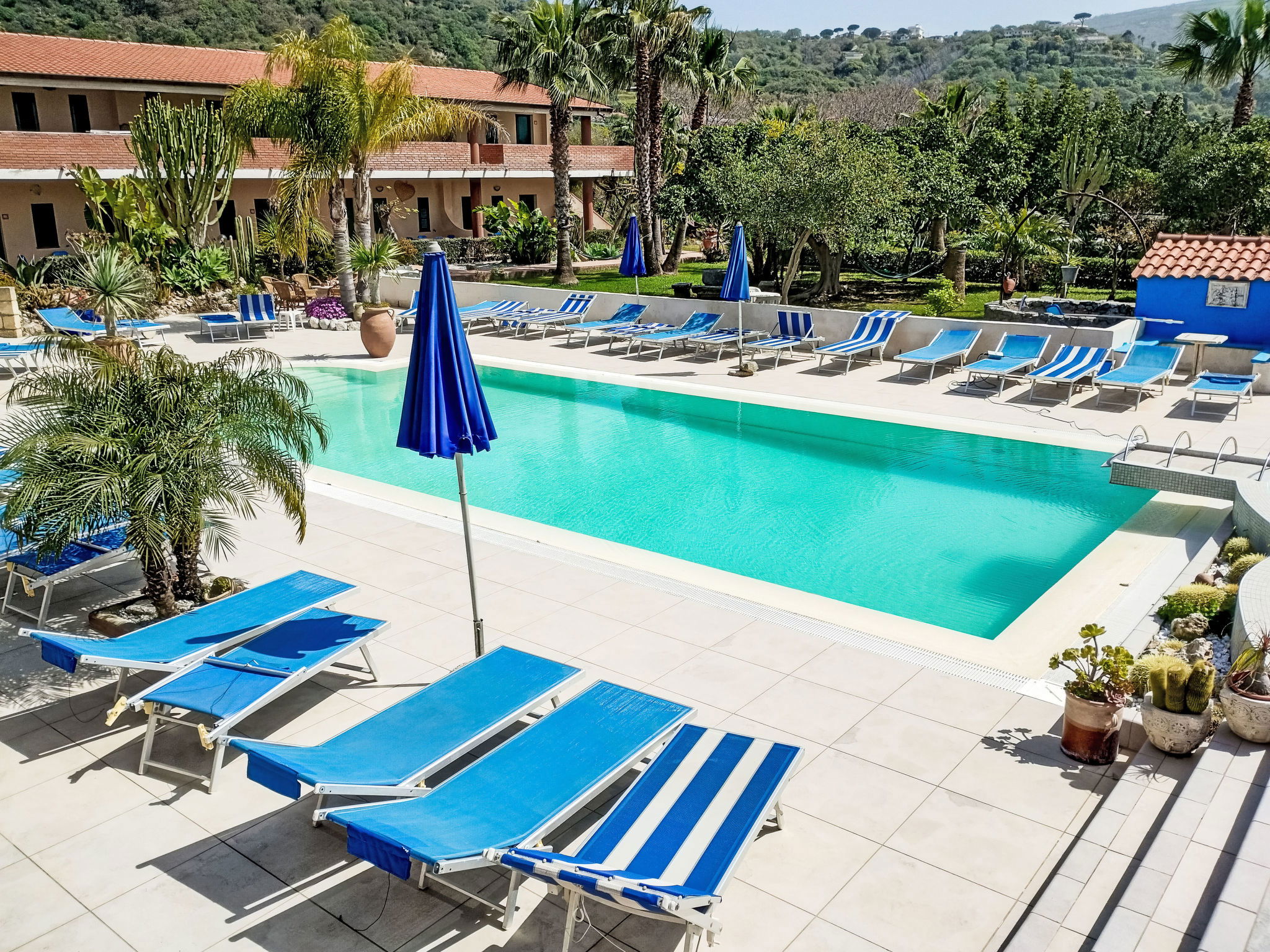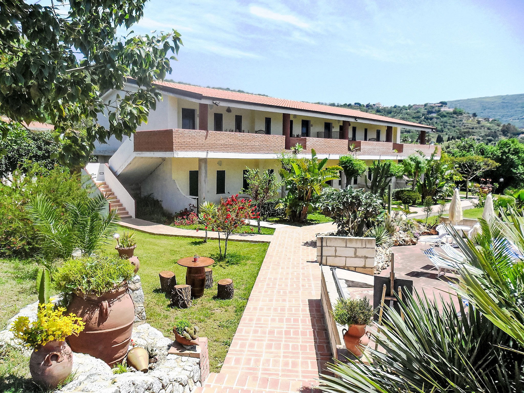 Santa Maria di Ricadi 8 km from Tropea: Small, child friendly, cosy holiday village "Heaven", surrounded by trees. In the district Santa Maria di Ricadi, in a sunny position, 550 m from the sea, 550 m from the beach. For shared use: well-kept garden plants and flowers, lawn for sunbathing, swimming pool (12 x 6 m, depth 90 - 150 cm, seasonal availability: 16.Apr. - 29.Oct. pool opening hours: 08:00-14:00 and 16:00-20:00). Outdoor shower, volleyball court, patio, garden furniture, barbecue, children's playground (slide, swing). In the complex: reception, restaurant, bar, WiFi, table football, sun terrace, washing machine (for shared use, extra). Linen change (suppl. charge extra). Towel change (suppl. charge extra). Breakfast and half board possible (extra). Airport transfer (extra). Parking on the premises. Shop, grocery, supermarket, restaurant, bar 500 m, 10 minute walk to the centre, bus stop 1 km, railway station "Ricadi" 5 km, sandy beach "Santa Maria di Ricadi" 550 m. Nearby attractions: Baia di Grotticelle 1 km, Tropea 8 km, Faro Capo Vaticano 3 km, Vibo Valentia 30 km, Reggio Calabria 90 km. Please note: suitable for families, baby equipment on request. Local sale of farm products. The photograph shows a typical example. Additional accommodations can be booked. The holiday properties may differ in situation, size and location. Included in the price: swimming pool, shuttle to/from the sea, parking, transfer to Ricadi station arrival/departure. The apartments are located on the ground or floor and have a veranda or patio.