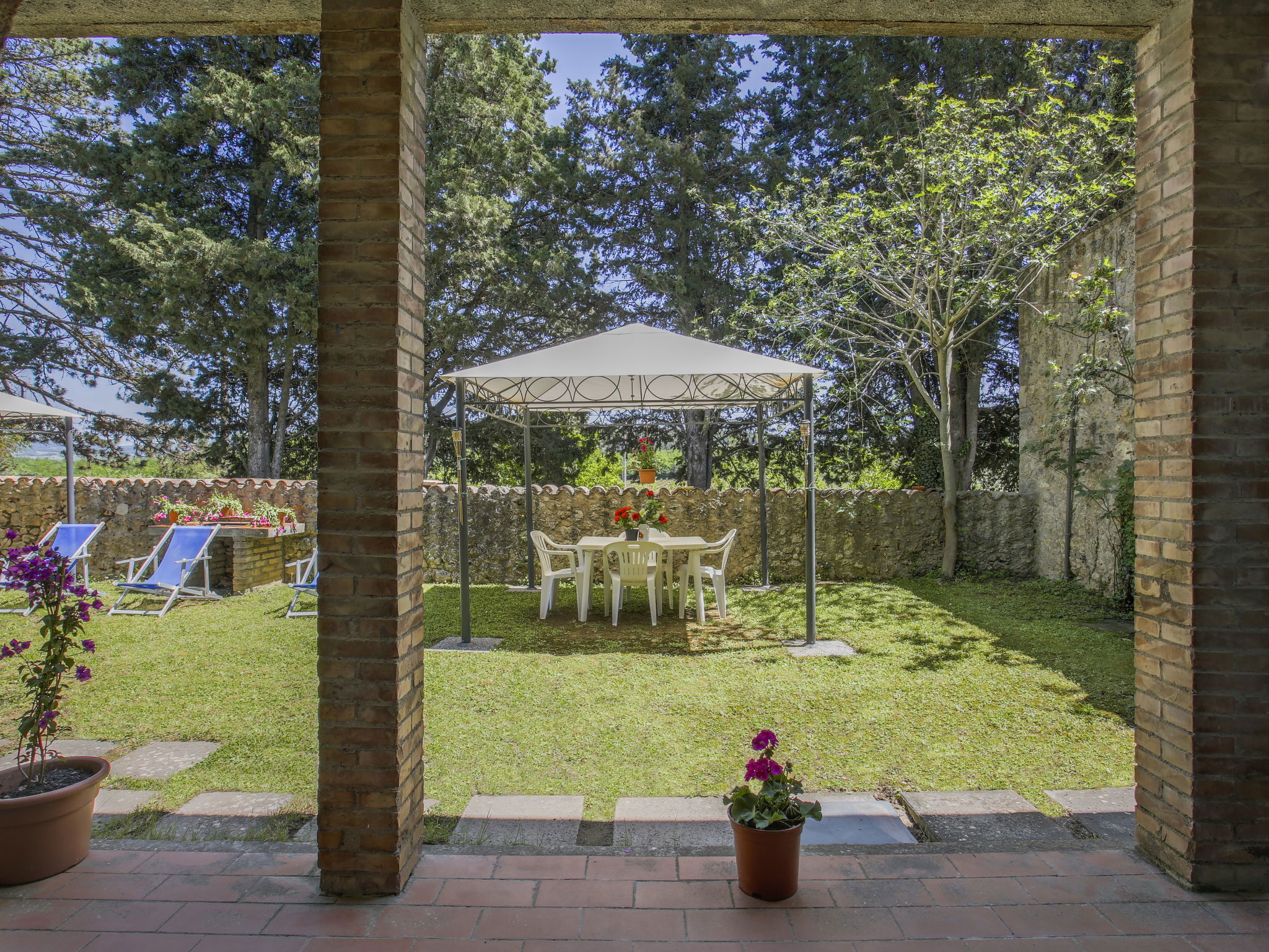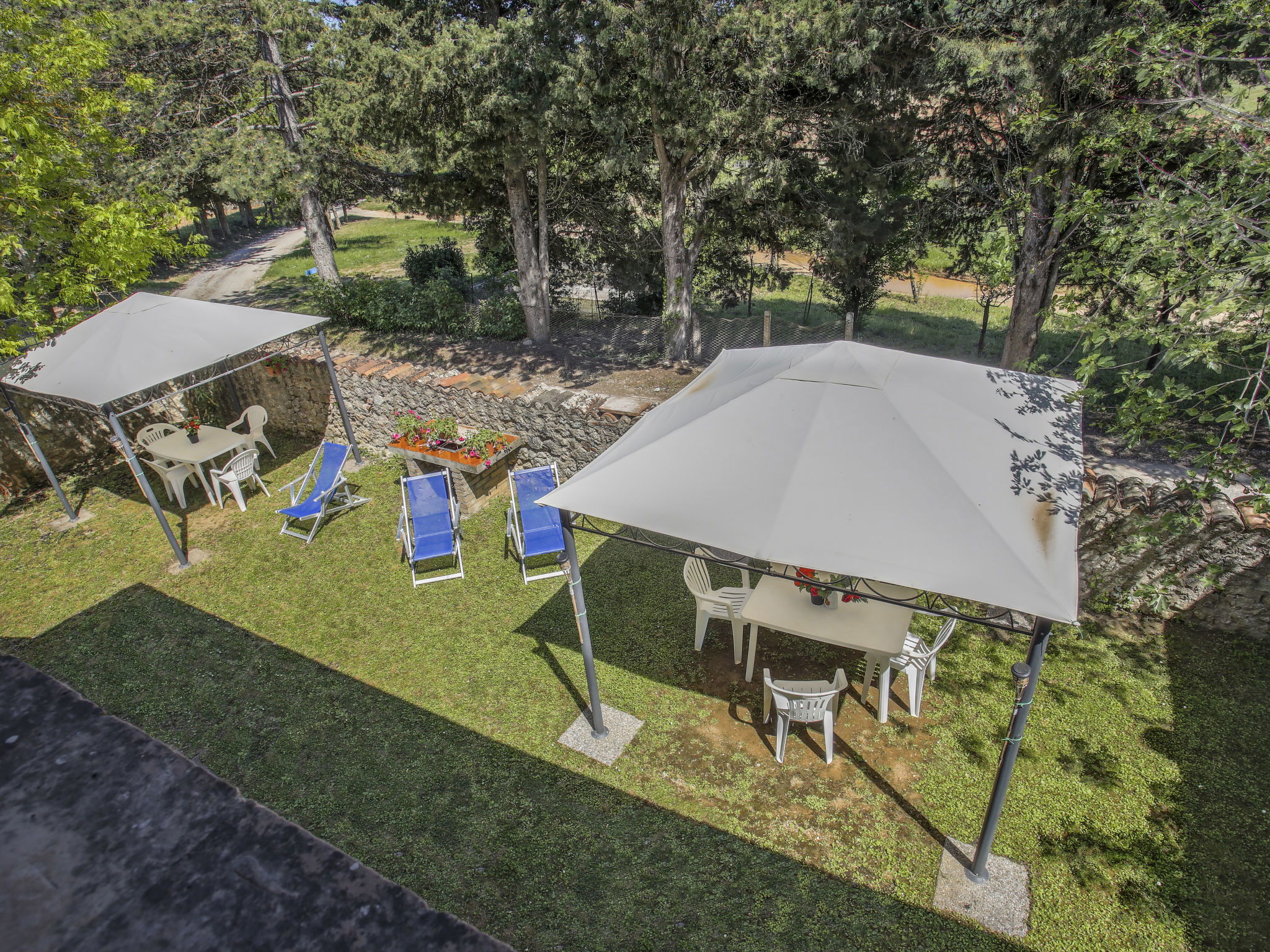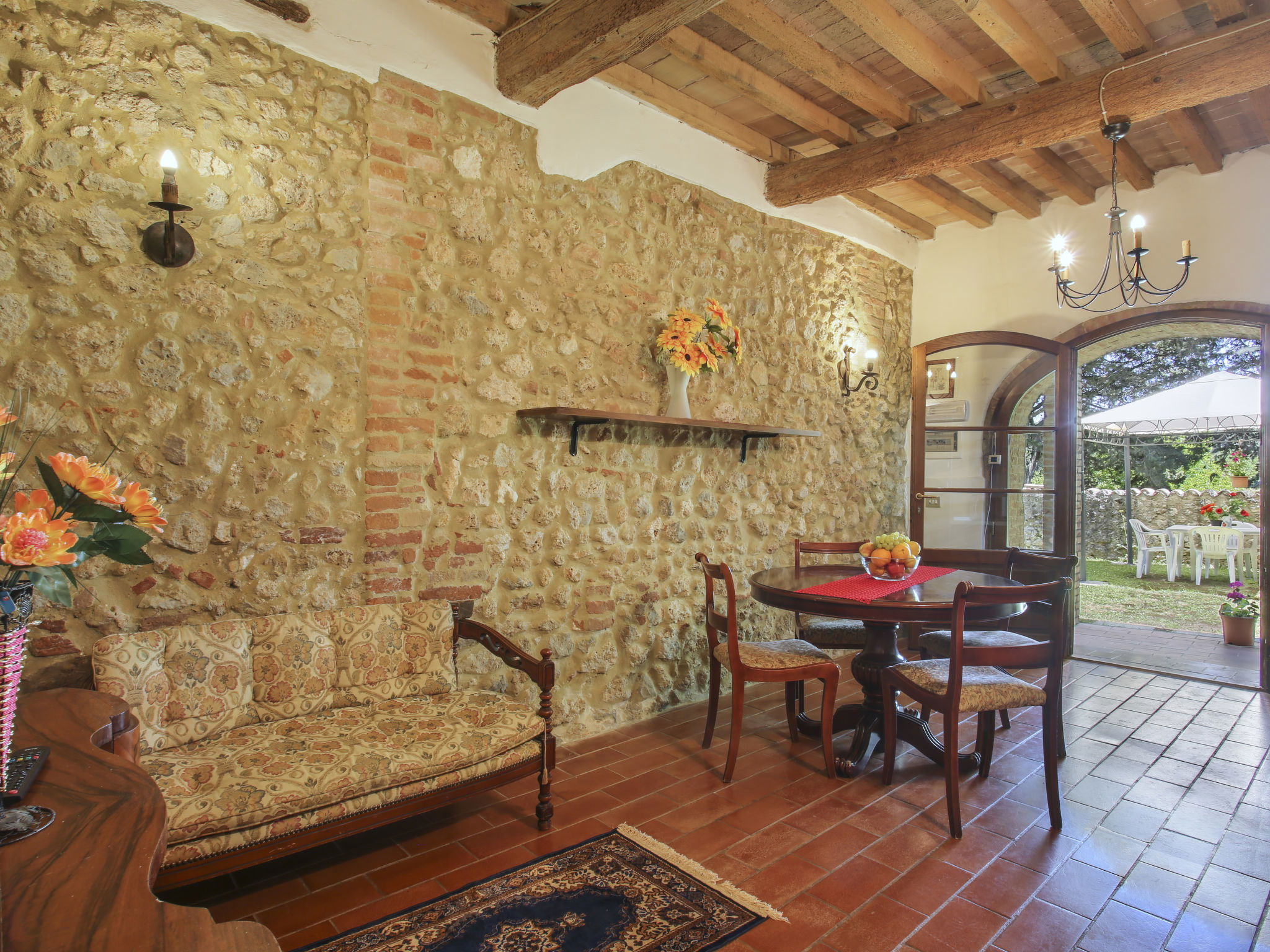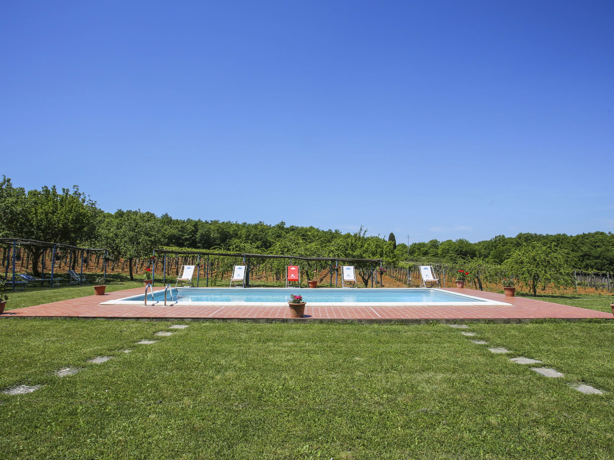 Monteriggioni: Rustic farmhouse "Fattoria Petraglia", detached from the 15th century, surrounded by trees, meadows and vineyards. 6 apartments in the property. 2.2 km from the centre of Monteriggioni, 12 km from the centre of Siena, 33 km from the centre of San Gimignano, in a quiet, sunny position, 90 km from the sea, in the countryside. For shared use: natural state property 50 ha with plants and trees, natural garden, meadow, swimming pool (10 x 5 m, seasonal availability: 01.May. - 10.Oct.). Outdoor shower, pergola, terrace, garden furniture, barbecue, pool maintenance by the owner/gardener. In the house: washing machine (for shared use, extra). 100 m long motor access (via unmade road). Parking on the premises. Grocery 2.2 km, supermarket 12 km, bus stop 2.2 km, railway station "Siena" 12 km. Nearby attractions: Castellina in Chianti 20 km, Radda in Chianti 24 km, Montalcino 45 km, Volterra 50 km, Firenze 70 km. Please note: baby equipment (included). All houses/apartments are individually designed/furnished.