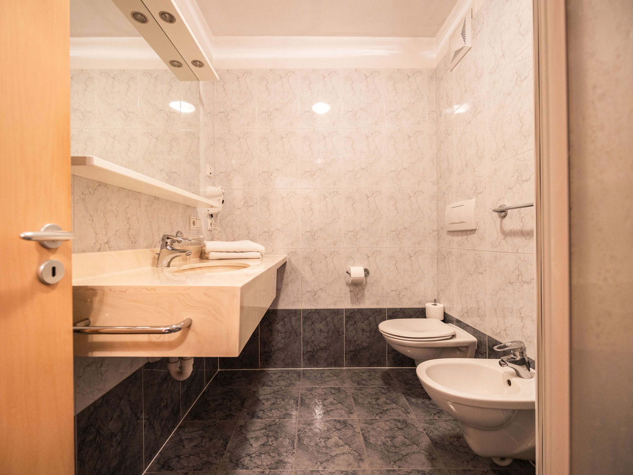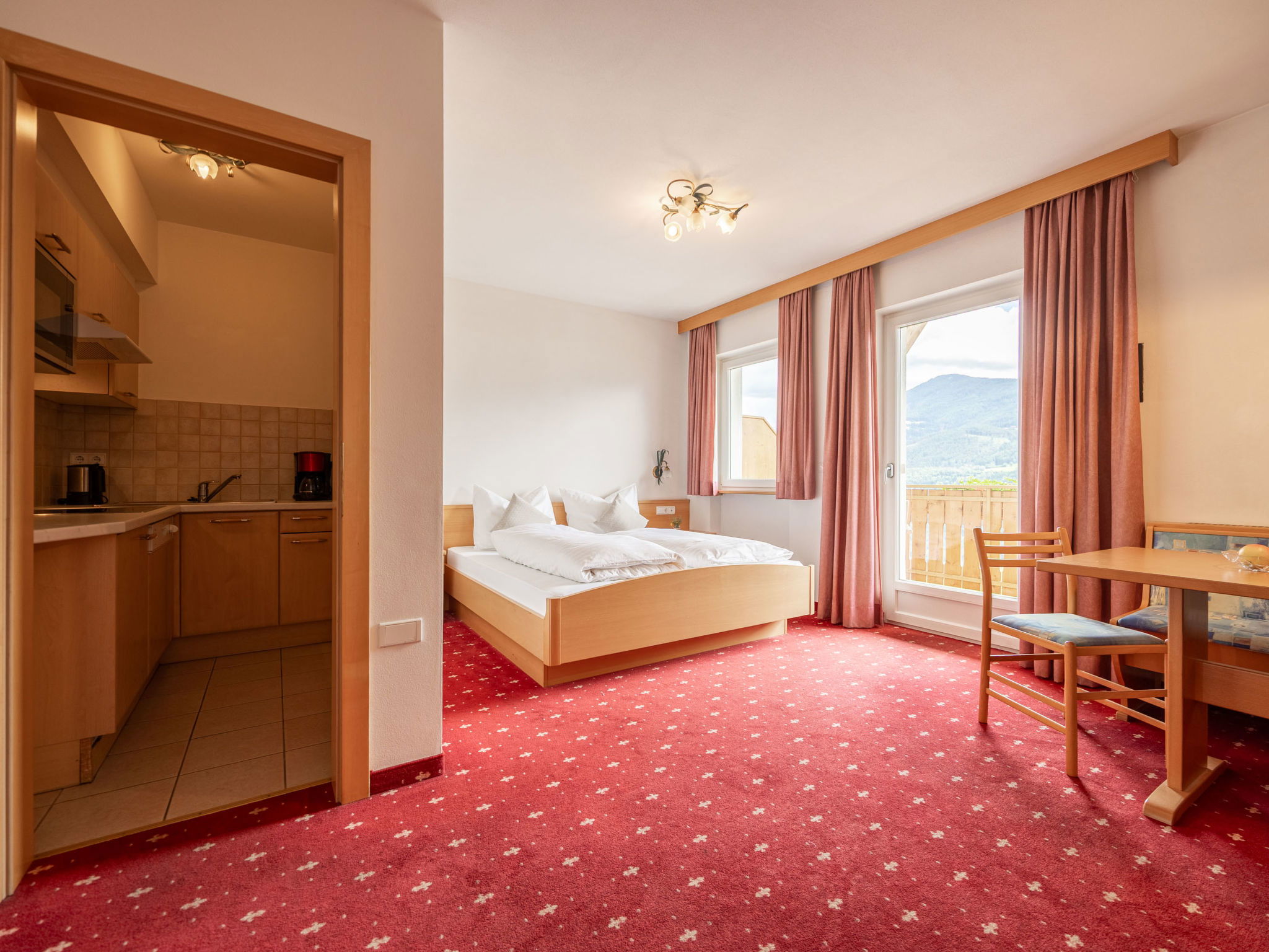 "Classic 303", 1-room apartment 32 m2 on 2nd floor. Bright, practical and cosy furnishings: living/sleeping room with 1 double bed, dining nook and satellite TV. Exit to the balcony. Small kitchen (dishwasher, 4 ceramic glass hob hotplates, toaster, kettle, microwave, electric coffee machine). Shower/WC. Heating. Carpet. Balcony. Balcony furniture. Marvellous panoramic view of the mountains and the valley. Facilities: safe, children's high chair, baby cot (extra). Internet (WiFi, free). Please note: non-smokers only. Maximum 1 pet/ dog allowed. No mandatory extra charges to be paid on-site except for local tax. Bedlinen, towels, final cleaning and all energy costs are included. IT021114B4YTADM49K