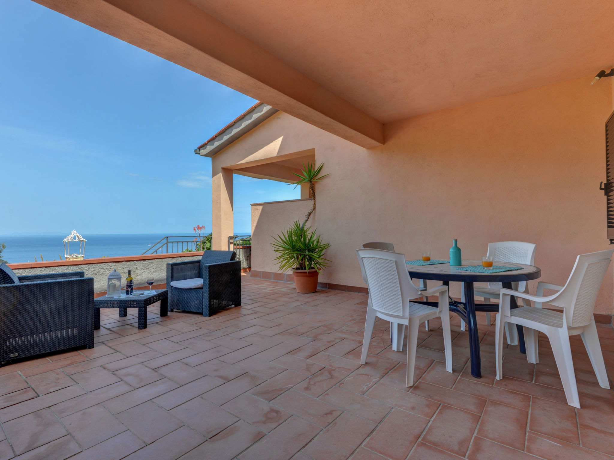 2-room apartment 31 m2, on the ground floor. Practical and beautiful furnishings: living/sleeping room with 1 double sofabed, dining table and satellite TV. Exit to the terrace. 1 room with 1 french bed (160 cm). Kitchenette (oven, 4 gas rings, freezer). Shower/bidet/WC. No heating option. Terrace 37 m2 partly roofed. Terrace furniture. Beautiful view of the forest and the ocean. Facilities: children's high chair, baby cot for up to 2 year olds. Internet (WiFi, free). Parking at the house. Please note: non-smokers only. Maximum 1 pet/ dog allowed. Private entrance. IT049021C25835TDE2