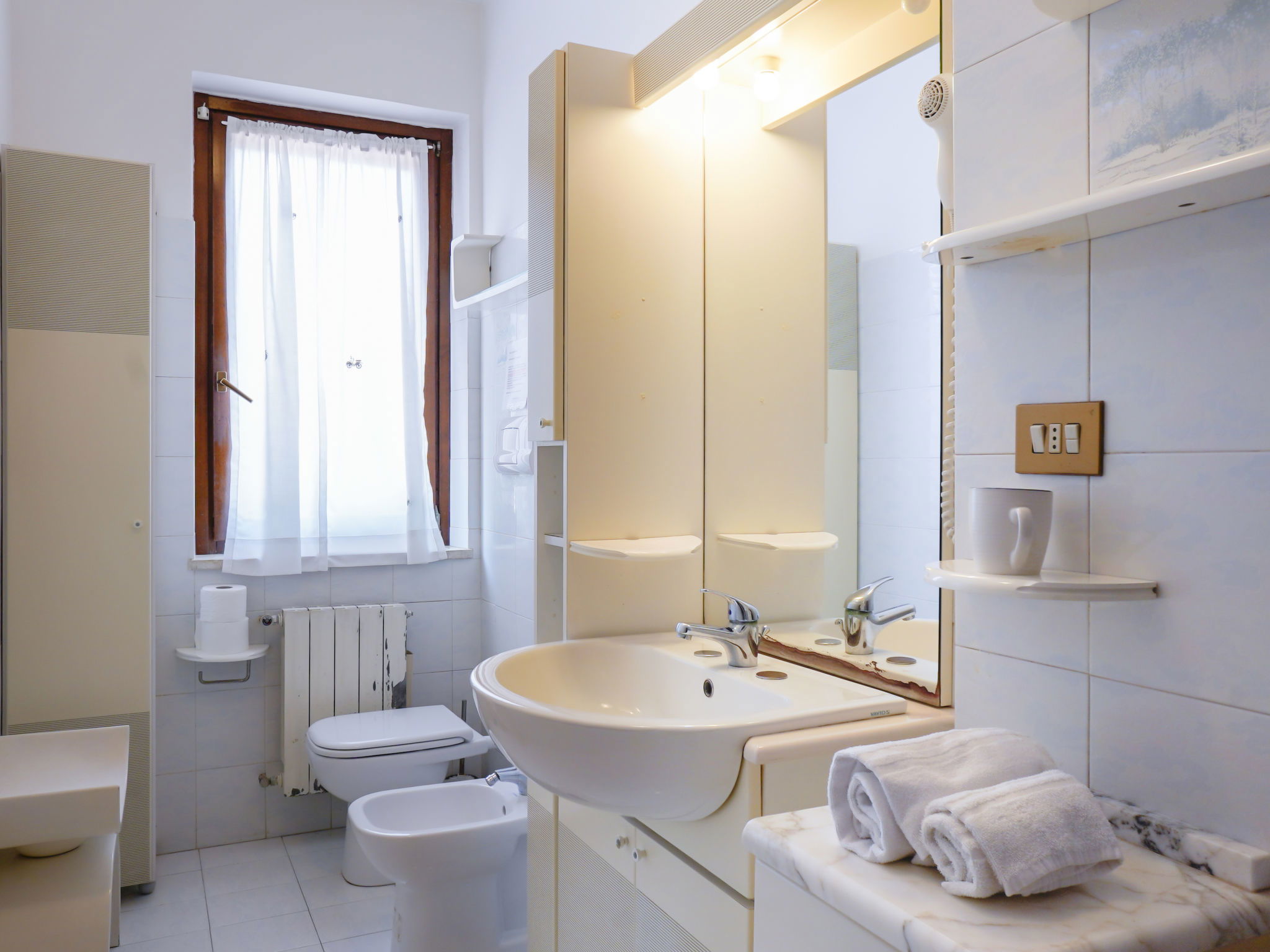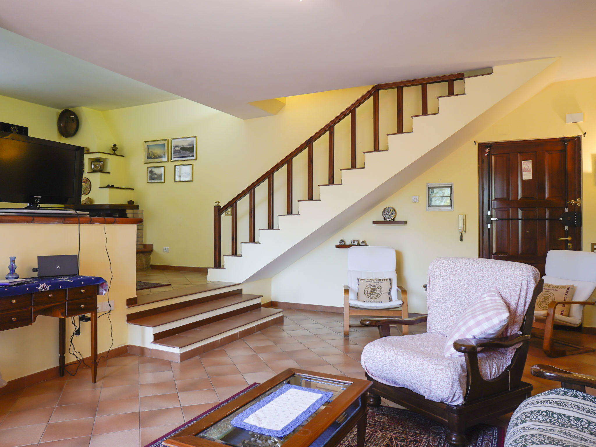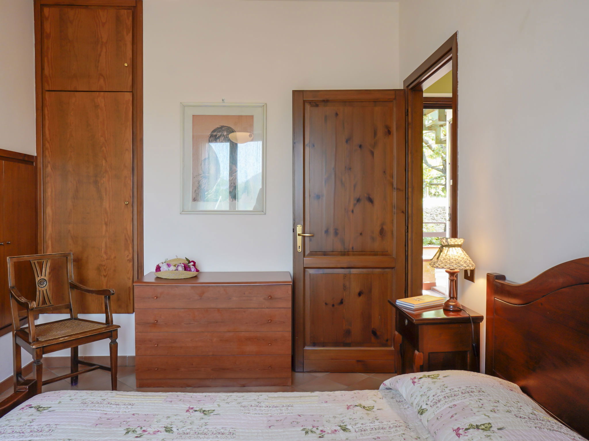 7-room villa 220 m2 on 2 levels. Large living/dining room with open-hearth fireplace and satellite TV. Exit to the garden. Large dining room with veranda. 2 double bedrooms. Large kitchen-/living room (4 hot plates, oven, dishwasher, microwave, freezer, electric coffee machine) with dining table, TV. Exit to the veranda. 2 showers/bidet/WC. Upper floor: 2 double bedrooms. Exit to the balcony. 1 room with 2 beds. Exit to the balcony. Shower/bidet/WC. Heating, air-conditioning. Balcony 15 m2, terrace 30 m2. Terrace furniture, deck chairs. Beautiful view of the garden. Facilities: washing machine, iron, hair dryer. Internet (WiFi, free). Parking (3 cars). Suitable for families. 1 small pet/ dog allowed. WiFi works well during the day, not so good in the evening/night when many devices connect to it. Check in after 20.00h extra 50 Euro. IT059010C2J8XMNNWT