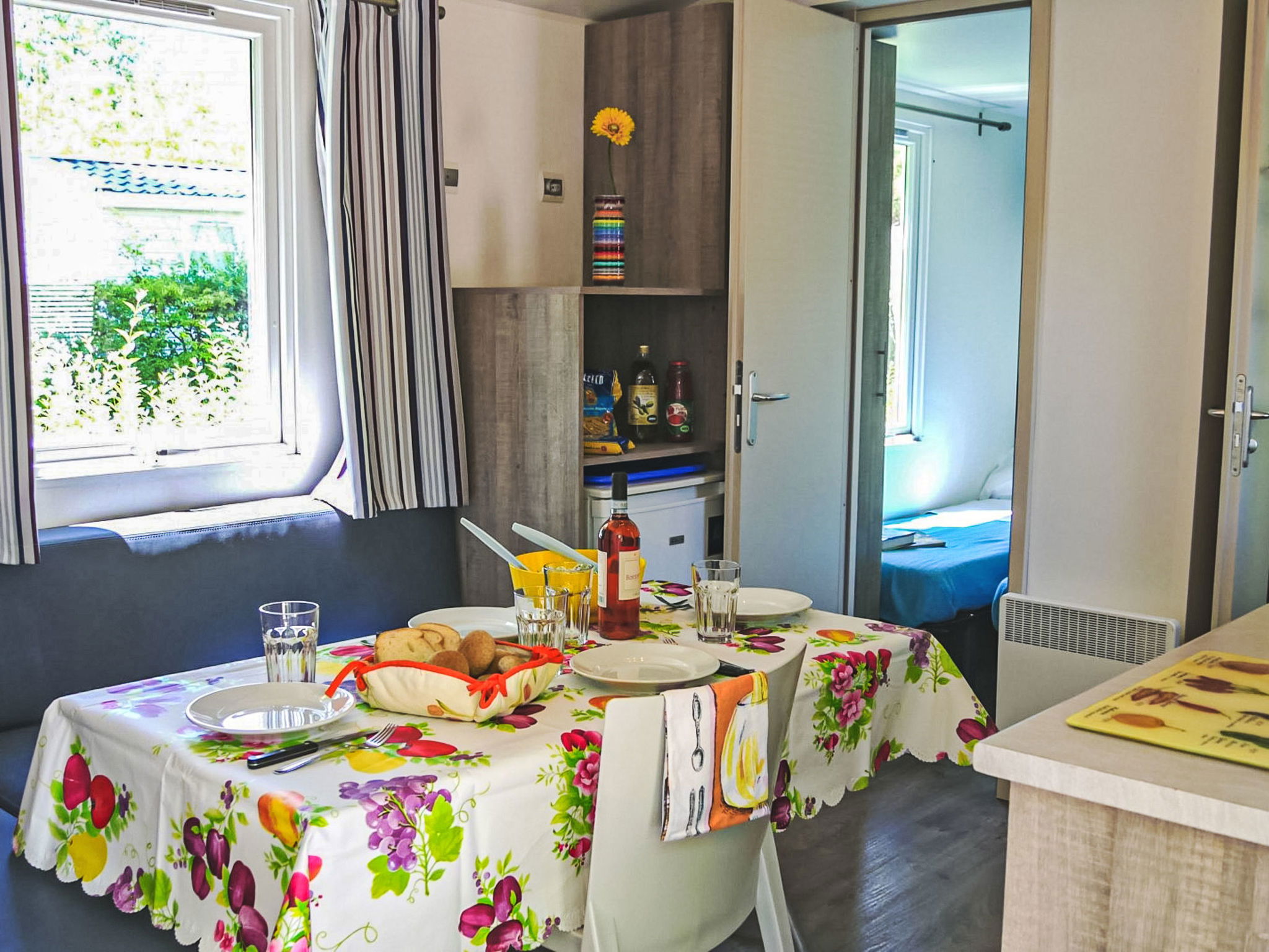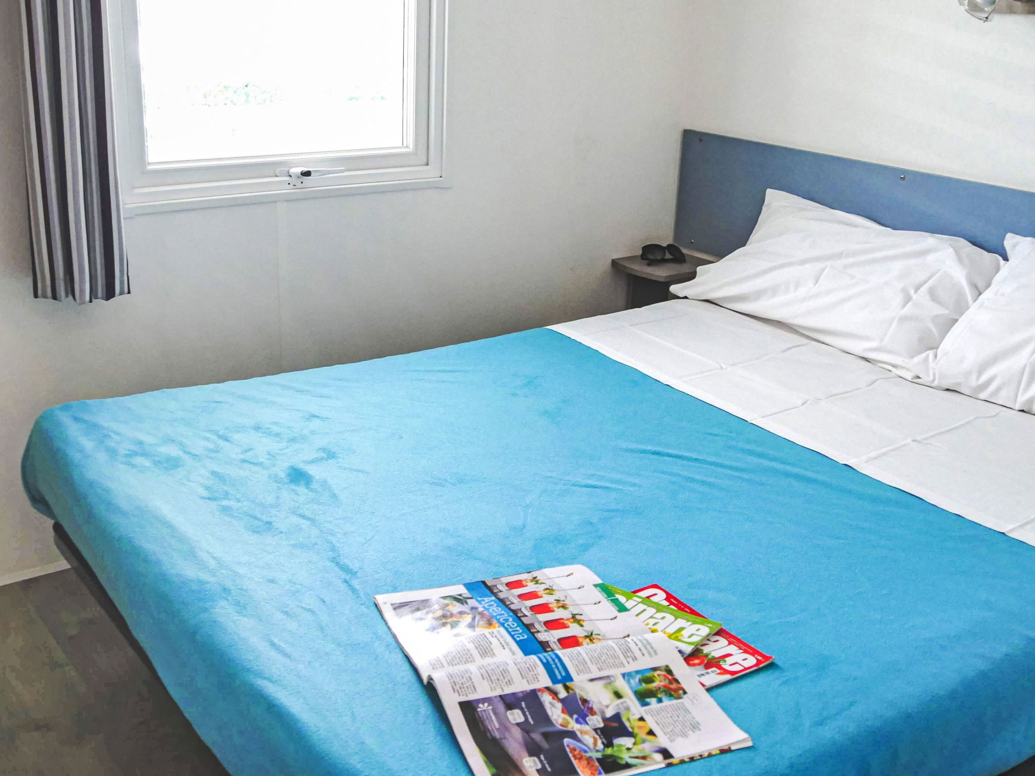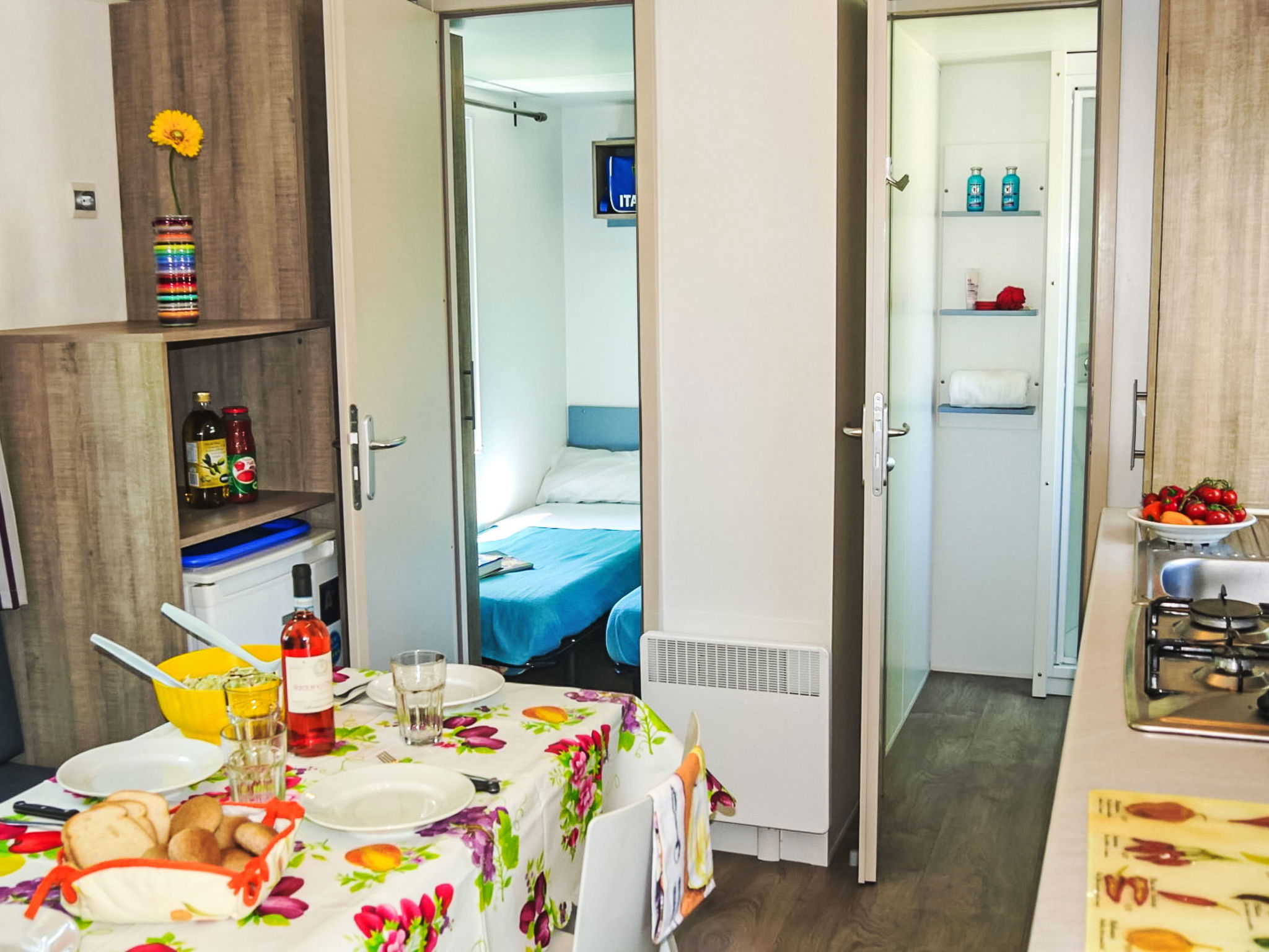 "Happy Comfort", 3-room mobile home 25 m2. Practical furnishings: living/sleeping room with 1 sleeping facility (120 cm, length 200 cm), dining table, electric heating and air conditioning. 1 room with 1 french bed (140 cm, length 190 cm). 1 room with 2 beds (70 cm, length 190 cm). Open kitchen (4 hot plates). Shower/WC. Air-conditioning (extra). Terrace partly roofed. Terrace furniture, electric barbecue (portable), deck chairs (2). Facilities: mosquito net. Parking (1 car). Please note: non-smokers only. Maximum 1 small pet/ dog allowed. IT075031B100021589