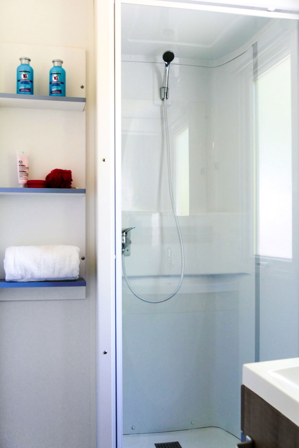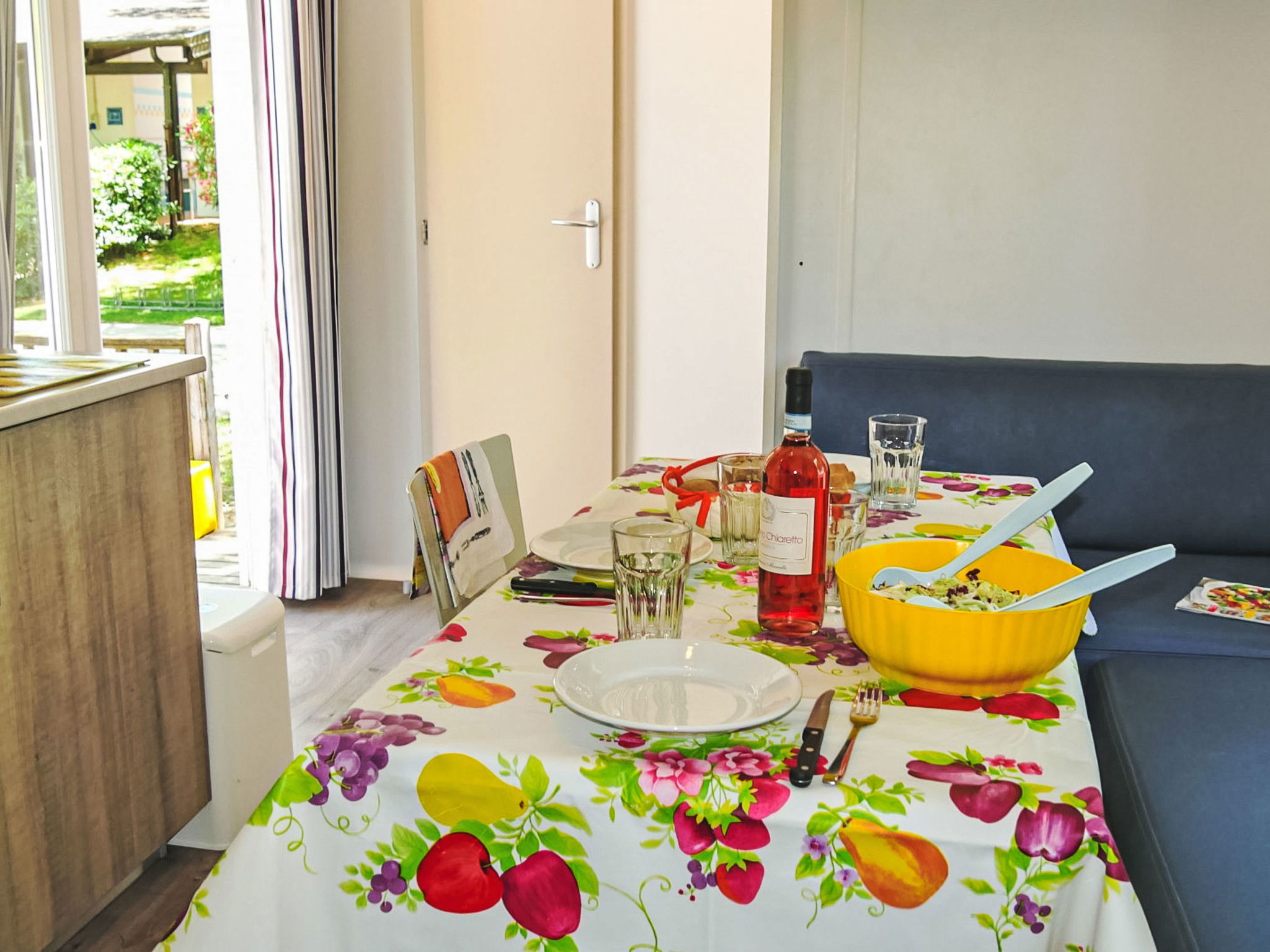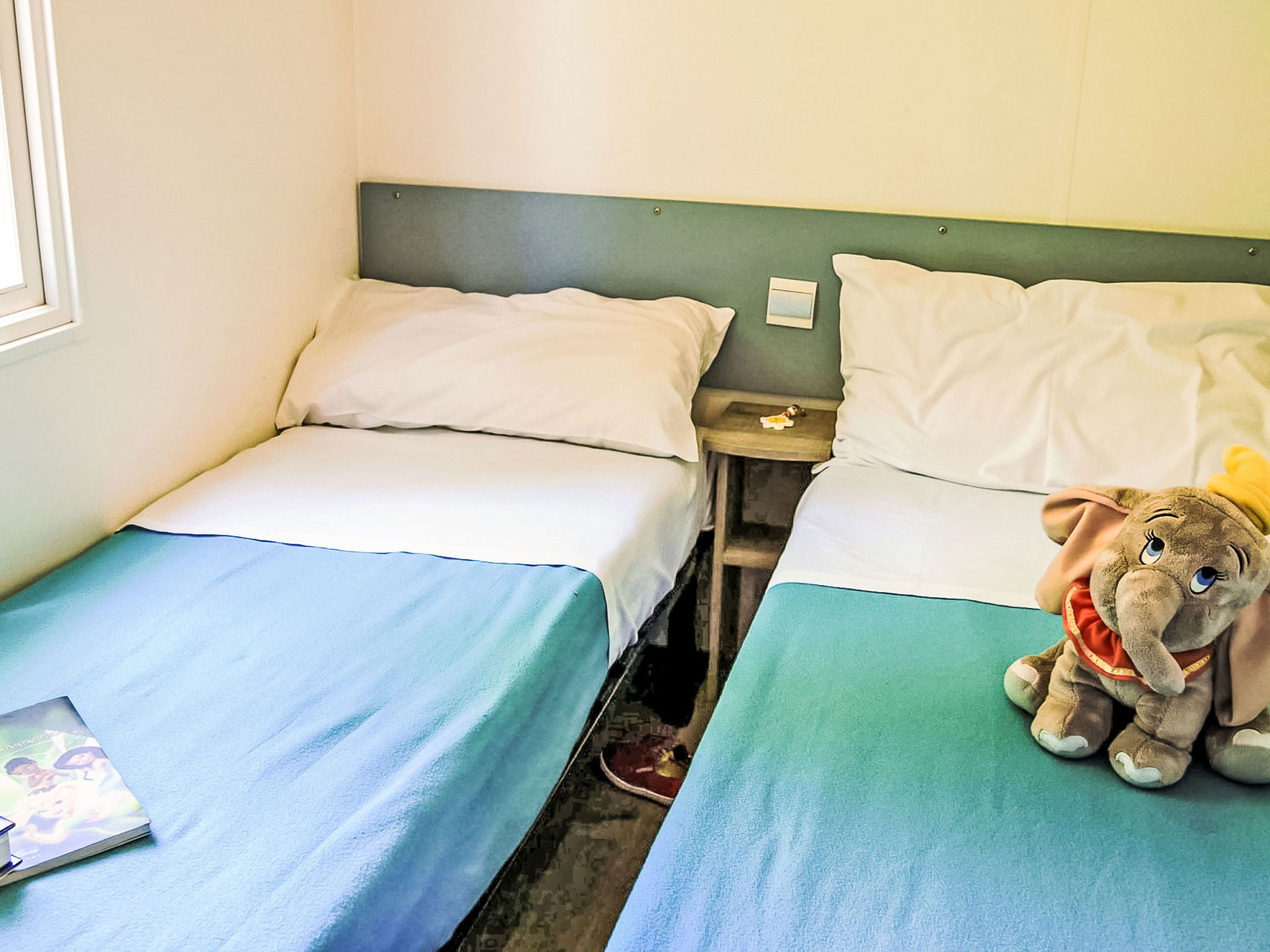 "Happy Comfort", 3-room mobile home 25 m2. Practical furnishings: living/sleeping room with 1 sleeping facility (120 cm, length 200 cm), dining table, electric heating and air conditioning. 1 room with 1 french bed (140 cm, length 190 cm). 1 room with 2 beds (70 cm, length 190 cm). Open kitchen (4 hot plates). Shower/WC. Air-conditioning (extra). Terrace partly roofed. Terrace furniture, electric barbecue (portable), deck chairs (2). Facilities: mosquito net. Parking (1 car). Please note: non-smokers only. Maximum 1 small pet/ dog allowed. IT075031B100021589