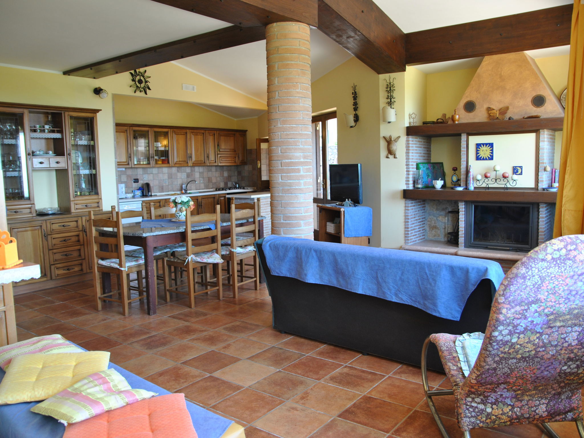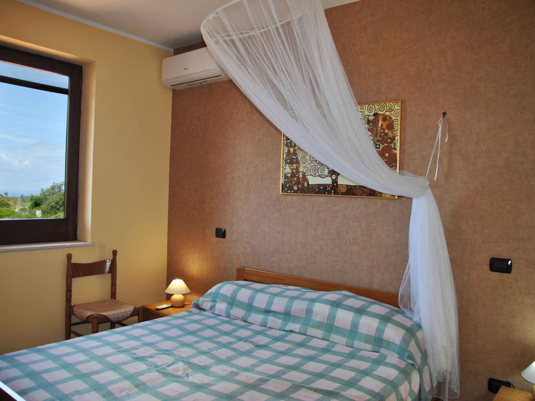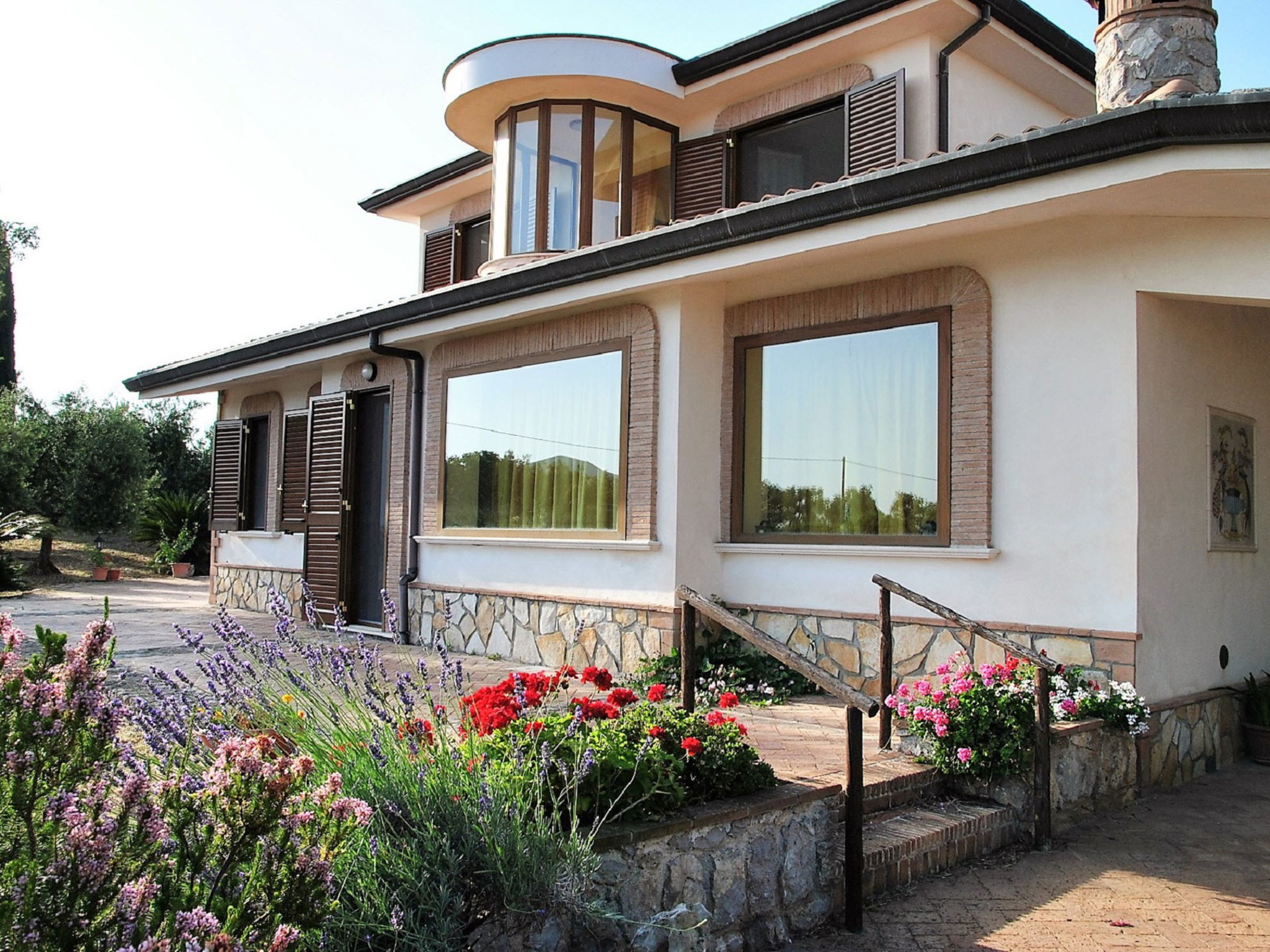 6-room villa 195 m2 on 2 levels. Comfortable and rustic furnishings: open large living/sleeping room with panoramic window with 1 sofabed and open-hearth fireplace (only for decoration), dining table and TV (flat screen). Exit to the garden. 1 double bedroom. Small living/sleeping room with 1 double sofabed, dining table, kitchen corner and TV (flat screen). Exit to the garden. 1 double bedroom. Exit to the garden. Open kitchen (4 hot plates, oven, dishwasher, kettle, microwave, freezer). 2 showers/bidet/WC. Upper floor: 1 double bedroom with air conditioning. 1 room with 2 beds and air conditioning. Shower/bidet/WC. Gas heating. Large terrace roofed. Terrace furniture, barbecue, deck chairs. Distant view of the sea. Facilities: washing machine, iron, hair dryer. Internet (WiFi, free). Parking at the house. 1 small pet/ dog allowed. No internal connecting door between the separated properties. IT059010C2UAZHW4UP