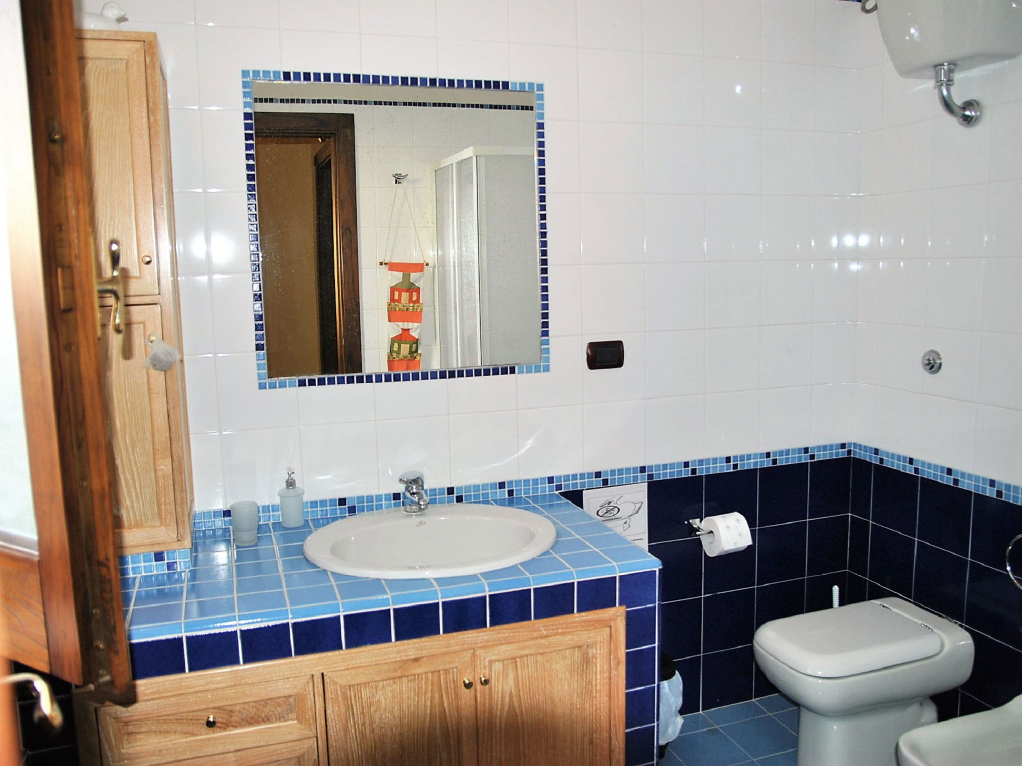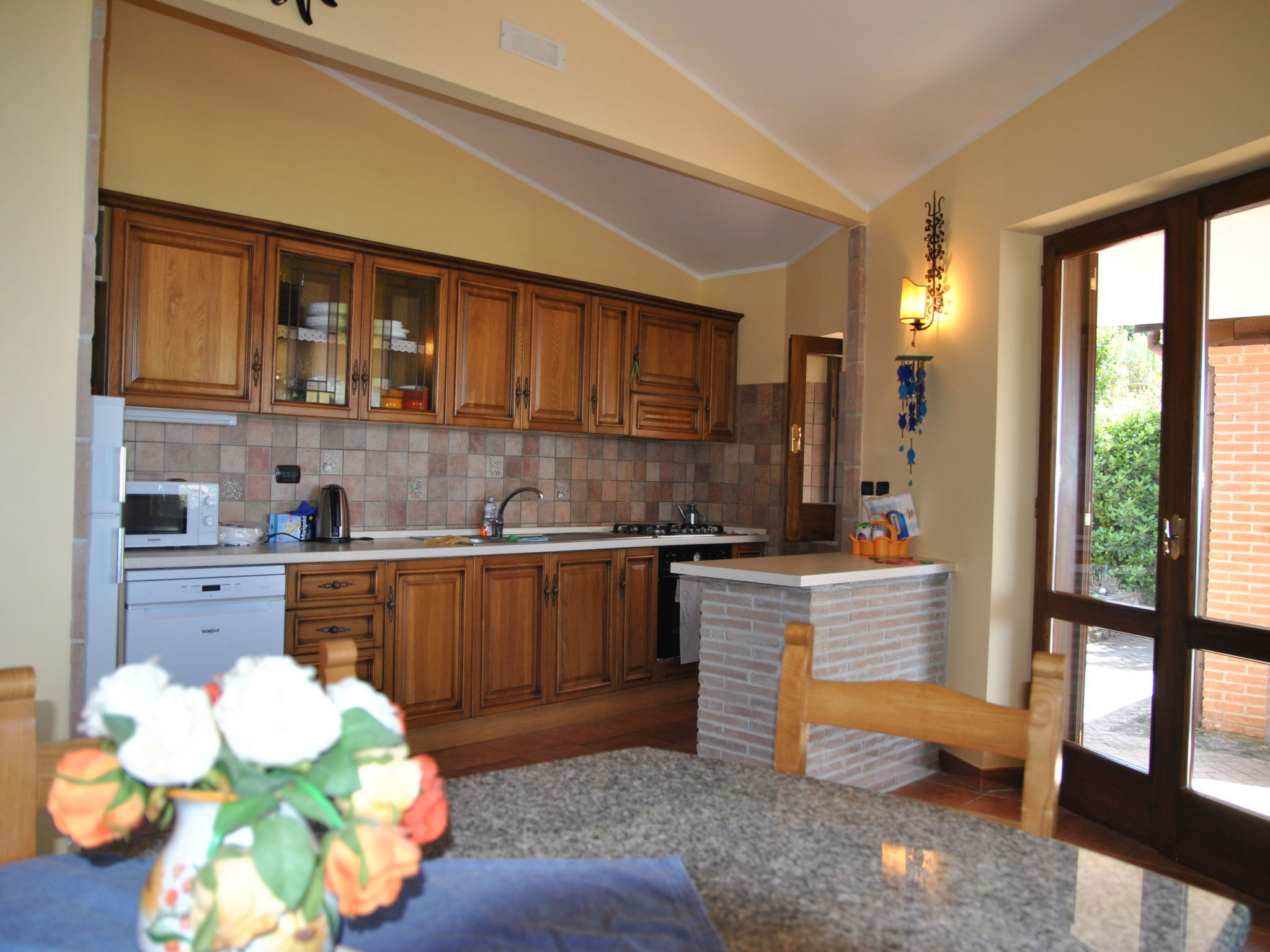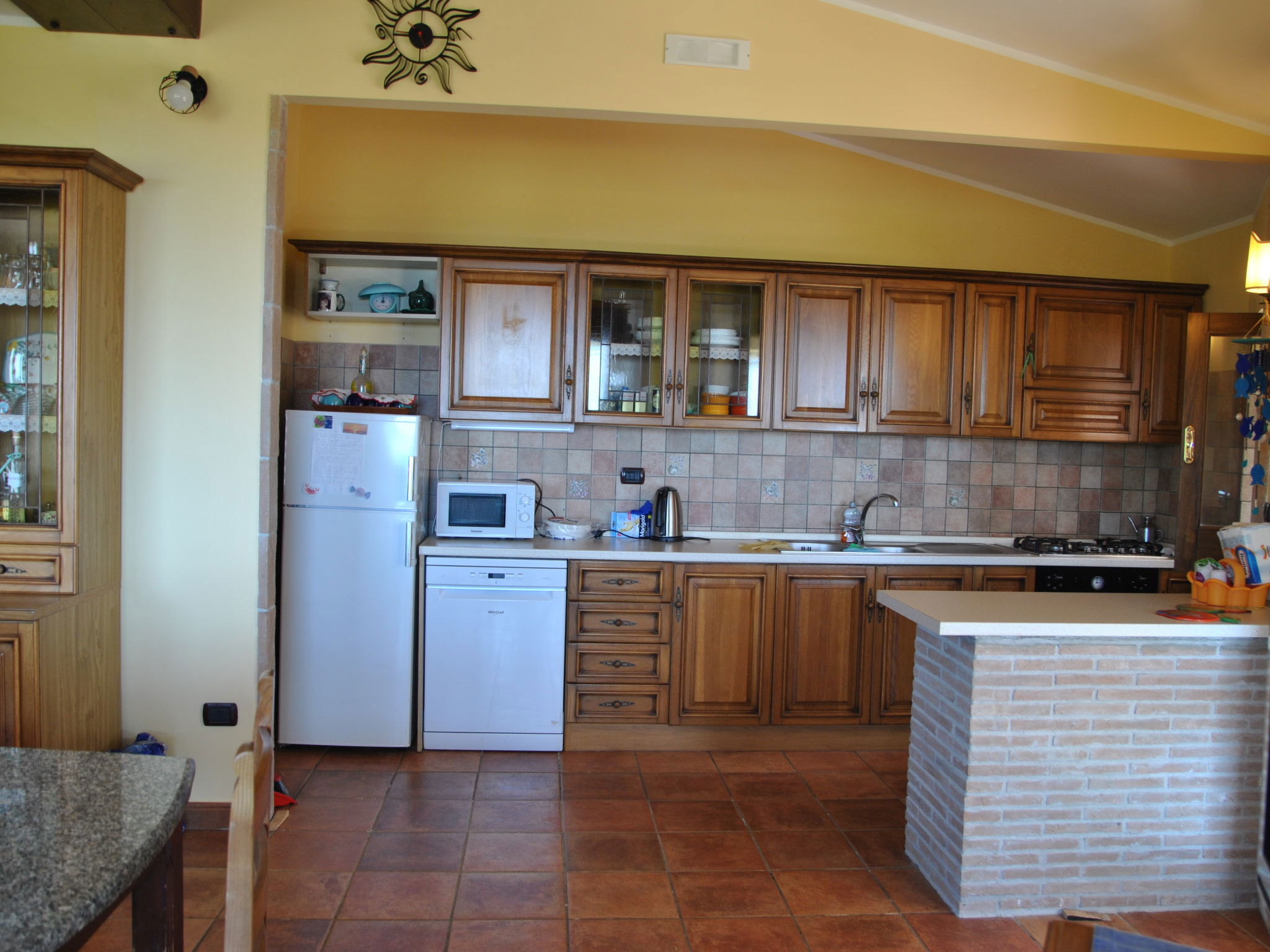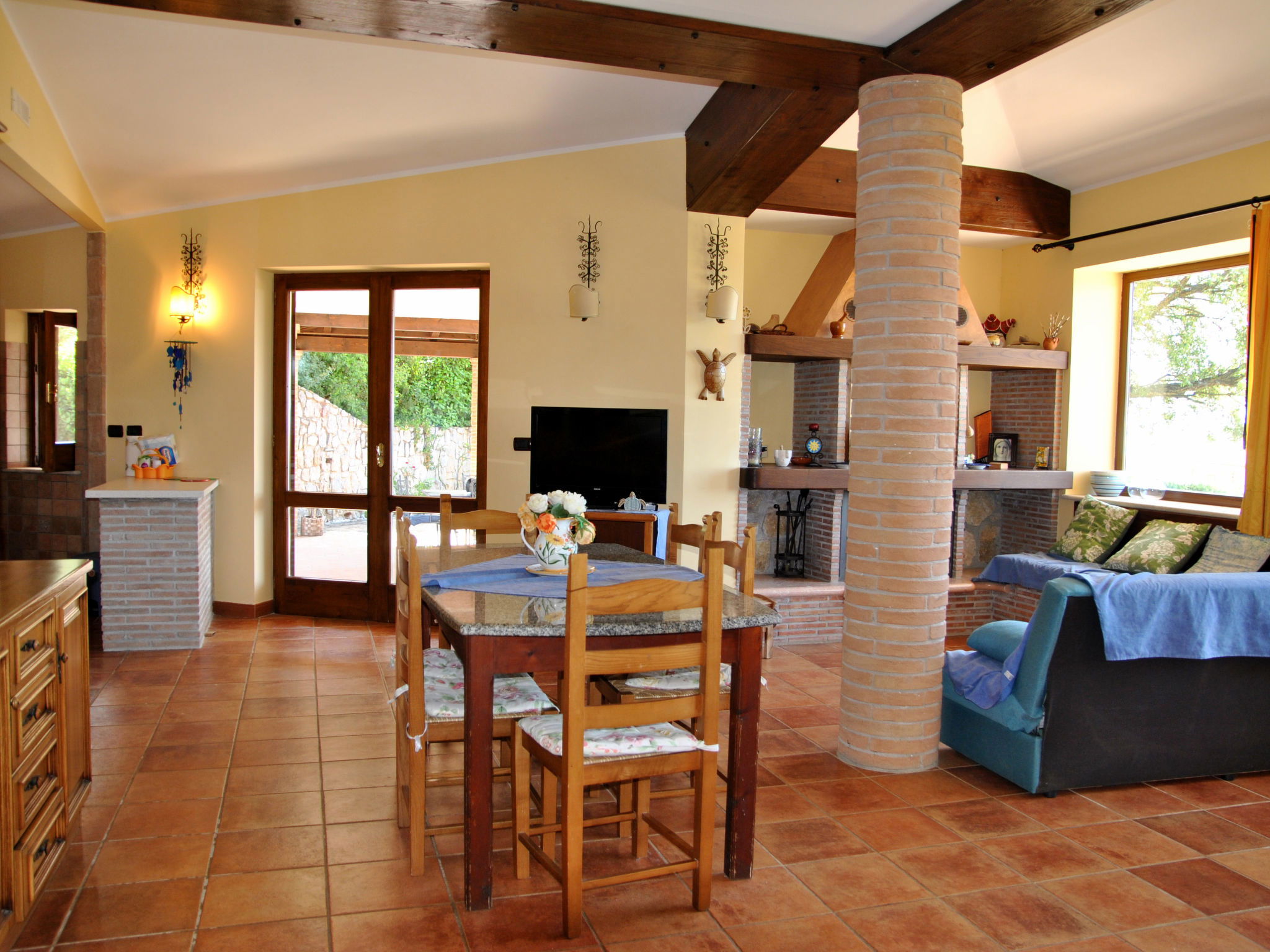 6-room villa 195 m2 on 2 levels. Comfortable and rustic furnishings: open large living/sleeping room with panoramic window with 1 sofabed and open-hearth fireplace (only for decoration), dining table and TV (flat screen). Exit to the garden. 1 double bedroom. Small living/sleeping room with 1 double sofabed, dining table, kitchen corner and TV (flat screen). Exit to the garden. 1 double bedroom. Exit to the garden. Open kitchen (4 hot plates, oven, dishwasher, kettle, microwave, freezer). 2 showers/bidet/WC. Upper floor: 1 double bedroom with air conditioning. 1 room with 2 beds and air conditioning. Shower/bidet/WC. Gas heating. Large terrace roofed. Terrace furniture, barbecue, deck chairs. Distant view of the sea. Facilities: washing machine, iron, hair dryer. Internet (WiFi, free). Parking at the house. 1 small pet/ dog allowed. No internal connecting door between the separated properties. IT059010C2UAZHW4UP