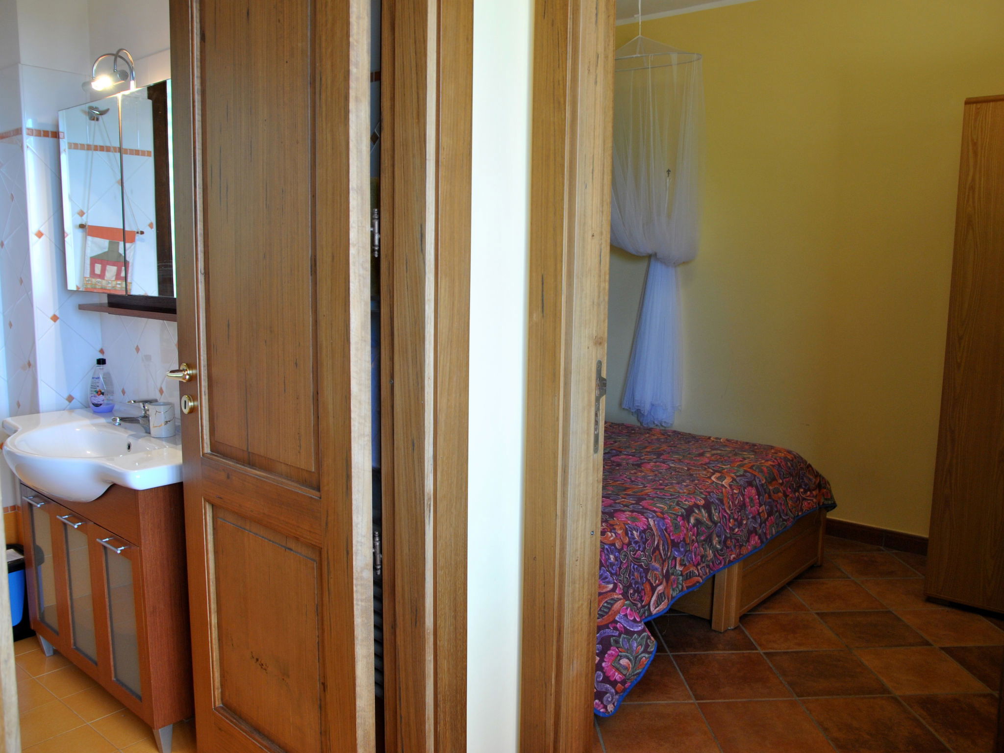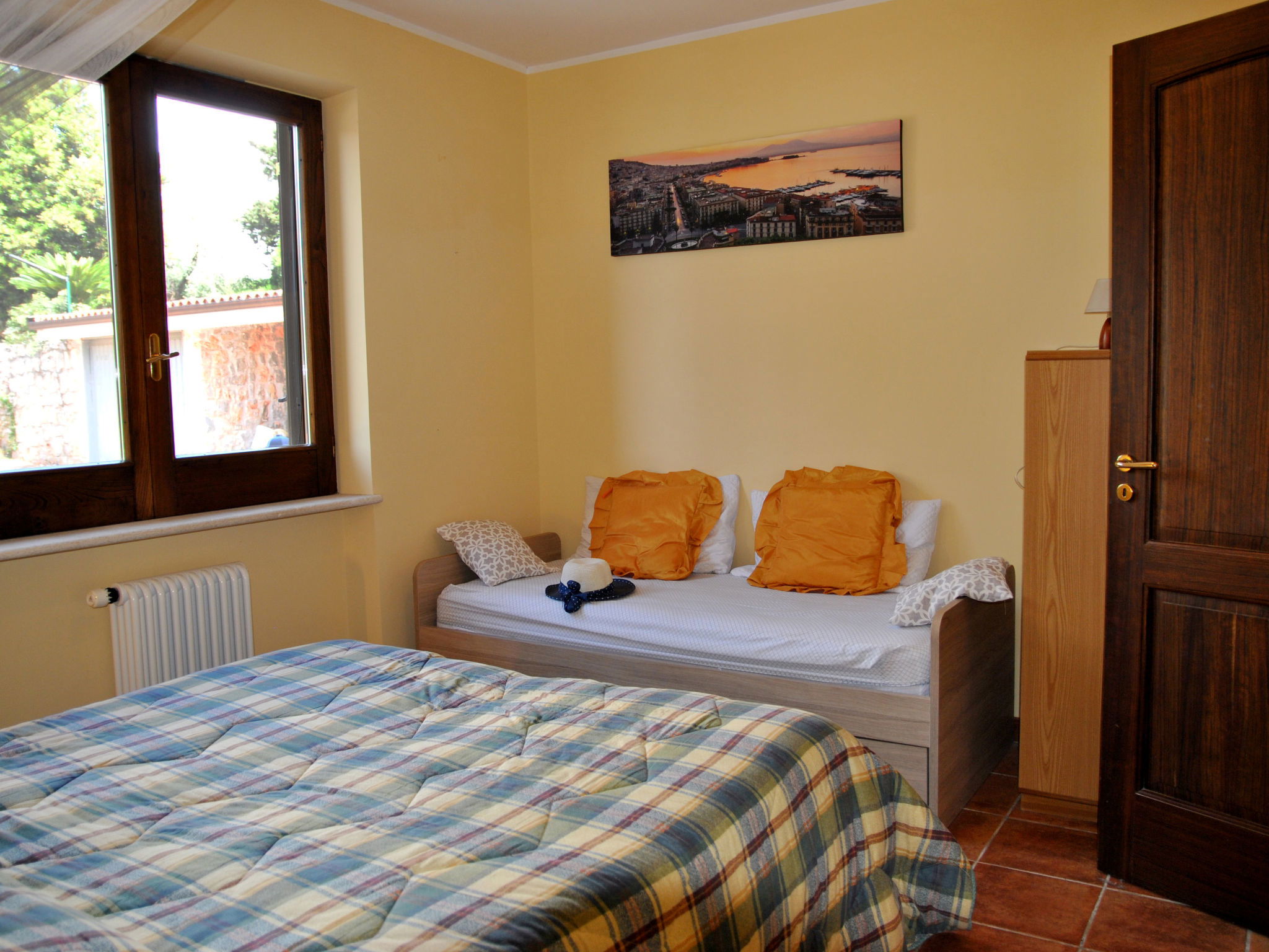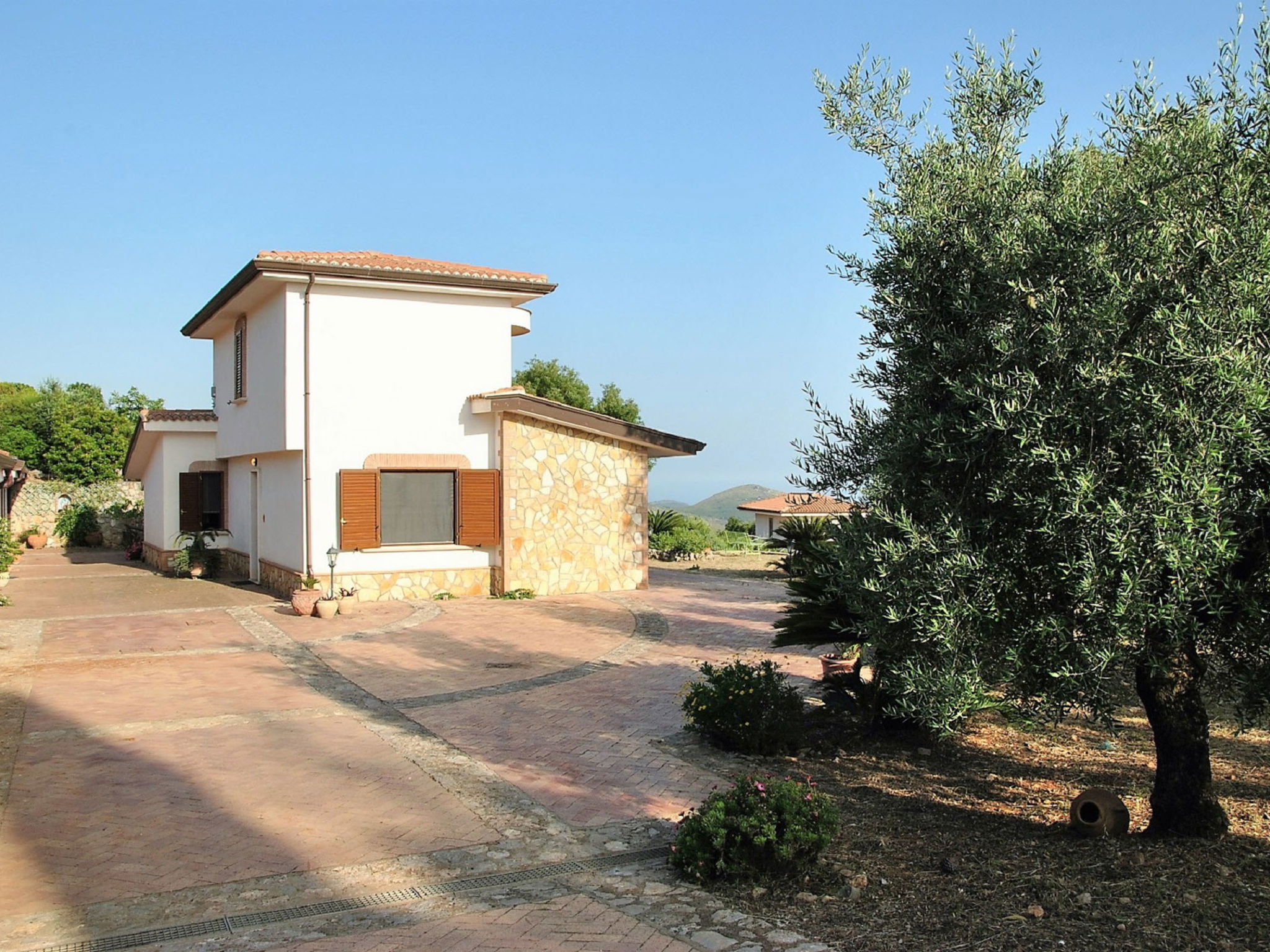 Villa "Collina delle Stelle", 300 m a.s.l., 2 storeys, detached, surrounded by fields and vineyards. Property composed of main house and outbuilding, outside the resort, 8 km from the centre of Itri, on top of a hill, 8 km from the sea, 8 km from the beach. For shared use: swimming pool kidney-shaped (10 x 5 m, depth 150 cm, seasonal availability: 01.Jun. - 30.Sep.). Outdoor shower. Private: garden 2'000 m2 (fenced). Patio, garden furniture, barbecue. Motor access (1 km mountain road). Parking on the premises. Grocery 8 km, supermarket 8 km, restaurant 8 km, bus stop 9 km, railway station "Formia (Roma-Napoli)" 17 km, ferry "Formia (Isole Pontine)" 17 km, sandy beach 17 km pebble beach "Spiaggia delle Bambole" 18 km, outdoor swimming pool 120 m. Nearby attractions: Sperlonga 8 km, Villa Tiberio 9 km, Gaeta 21 km, Terracina 25 km. Please note: car recommended. The living room with kitchenette and sofa bed, a double bedroom and a bathroom with shower are located in the dependance a few metres from the villa. The swimming pool is 300m from the house inside another property.