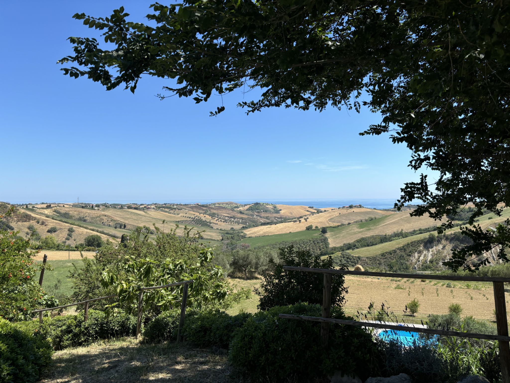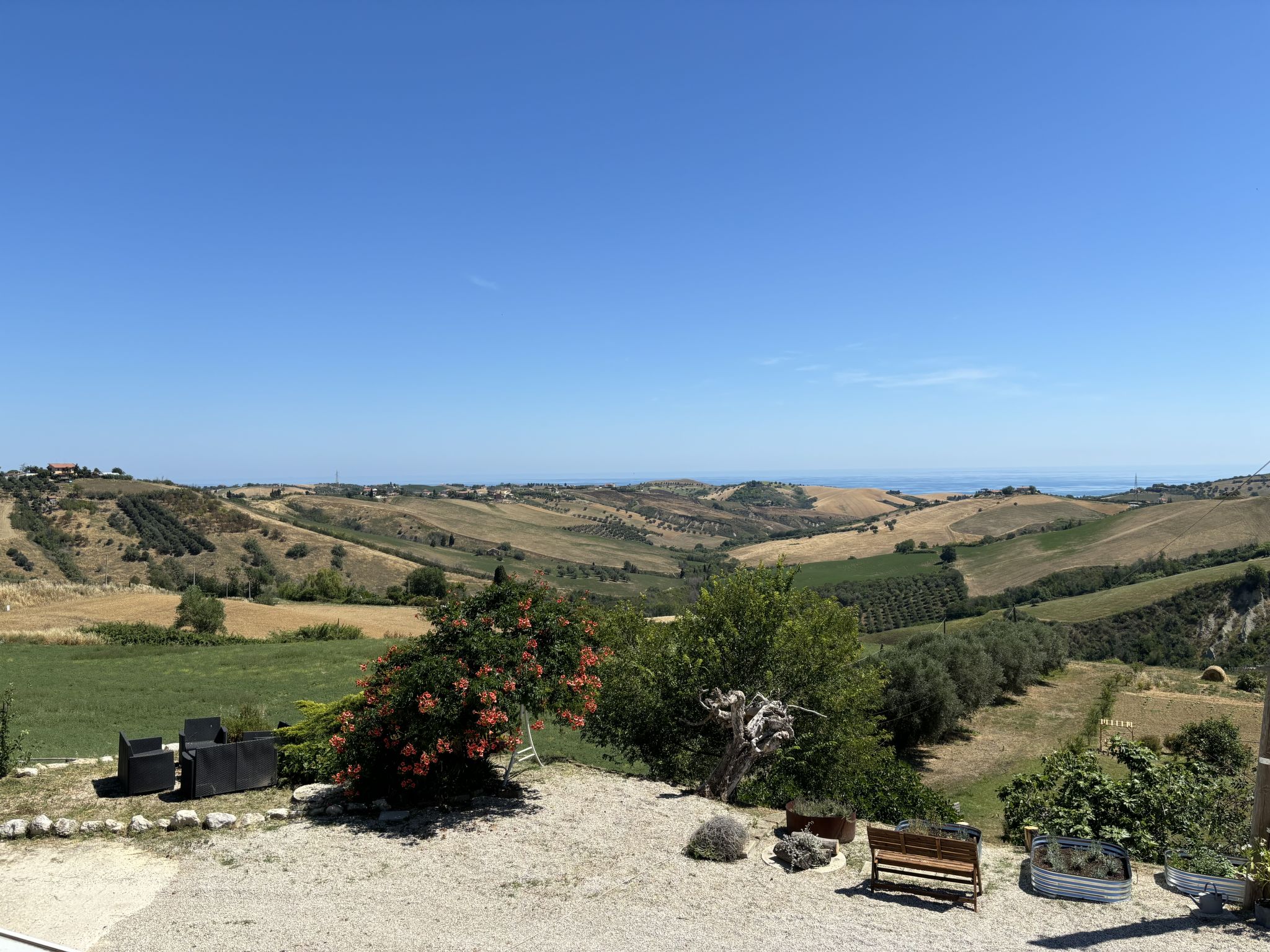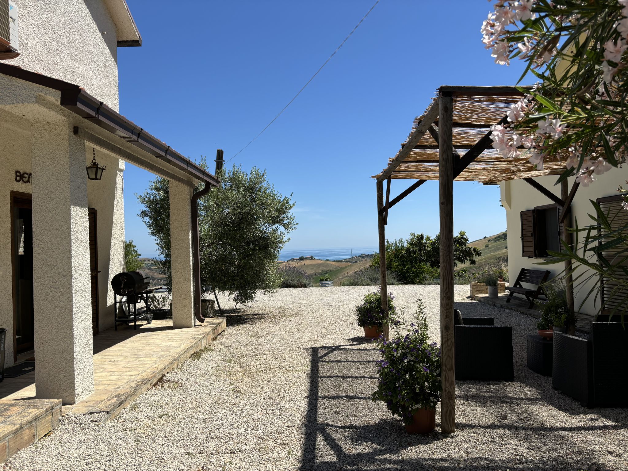 Very beautiful, rustic, comfortable country house "Serrani", renovated in 2018, surrounded by meadows and fields. 2 houses in the residence. 4 apartments in the residence. 8 km from the centre of Roseto degli Abruzzi, 13 km from the centre of Giulianova, 17 km from the centre of Pineto, in a secluded, sunny position on a slope, 6 km from the sea, in the countryside. For shared use: natural state property 5 ha, beautiful terraced garden, 5'000 m2 (not fenced) with plants and trees, orchard, lawn for sunbathing, swimming pool (above ground) (10 x 5 m, depth 130 cm, seasonal availability: 01.Jun. - 28.Sep.). Patio, arbour, pergola, garden furniture, barbecue. In the complex: hot tub (extra). Washing machine (for shared use). 100 m long bumpy motor access to the house. Stepped path to the house. Parking on the premises. Shop 1 km, supermarket 8 km, bus stop 500 m, railway station "Roseto degli Abruzzi" 8 km, sandy beach 6 km. Local sale of farm products. Please note: Additional accommodations can be booked.