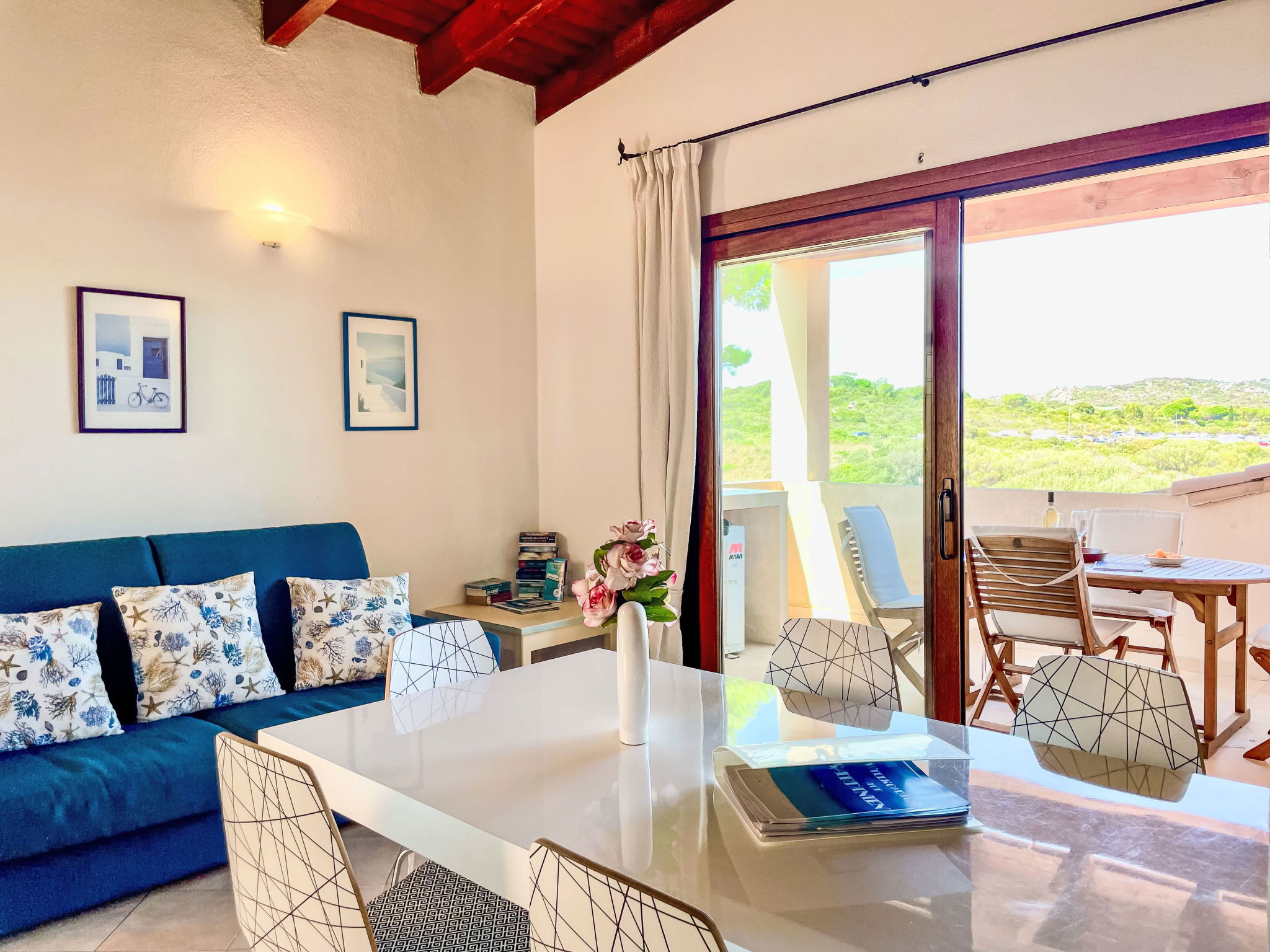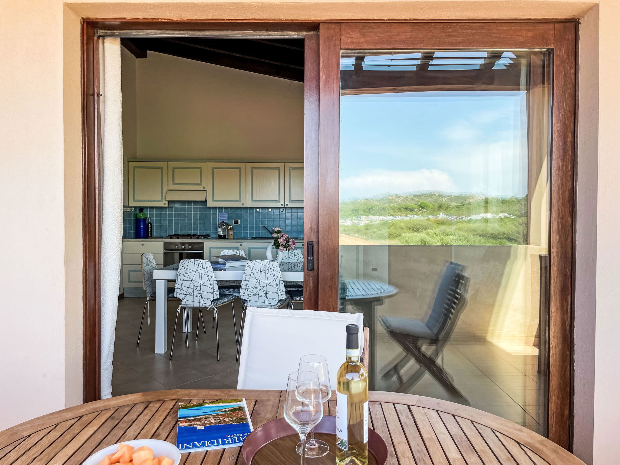 "I Mirti di Porto Pozzo ", 3-room apartment 80 m2 on 1st floor. Comfortable furnishings: large living/sleeping room with 1 double sofabed, dining table and satellite TV. Exit to the terrace. 1 room with 1 double bed and shower/bidet/WC. 1 room with 2 beds. Open kitchen (oven, dishwasher, 4 gas rings, toaster, electric coffee machine, Capsules for coffee machine (Caffitaly) extra). Shower/bidet/WC. Air-conditioning. Balcony 10 m2. Balcony furniture. Partial view of the sea and the countryside. Facilities: washing machine, children's high chair, baby cot for up to 2 year olds, hair dryer. Internet (WiFi, free). Garage (extra) (1 car). Please note: non-smokers only. Maximum 1 pet/ dog allowed. No lift.