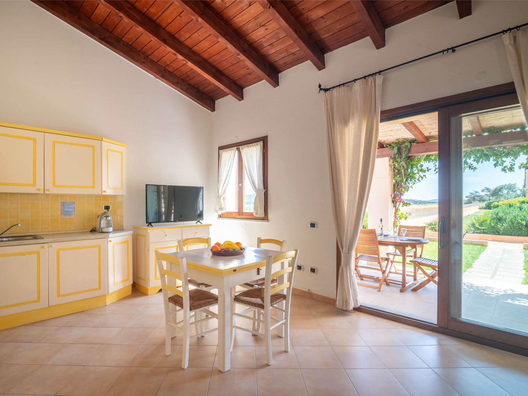 "I Mirti di Porto Pozzo ", 2-room terraced house 45 m2, on the ground floor. Comfortable and beautiful furnishings: living/sleeping room with 1 double sofabed, dining table and satellite TV. Exit to the garden. 1 room with 1 double bed. Open kitchen (oven, 4 gas rings, toaster, electric coffee machine). Shower/WC. Electric heating, air-conditioning. Terrace 15 m2. Terrace furniture. View of the sea. Facilities: washing machine, children's high chair, baby cot for up to 2 year olds, hair dryer. Internet (WiFi, free). Garage (extra). Please note: non-smokers only. Maximum 1 pet/ dog allowed.
