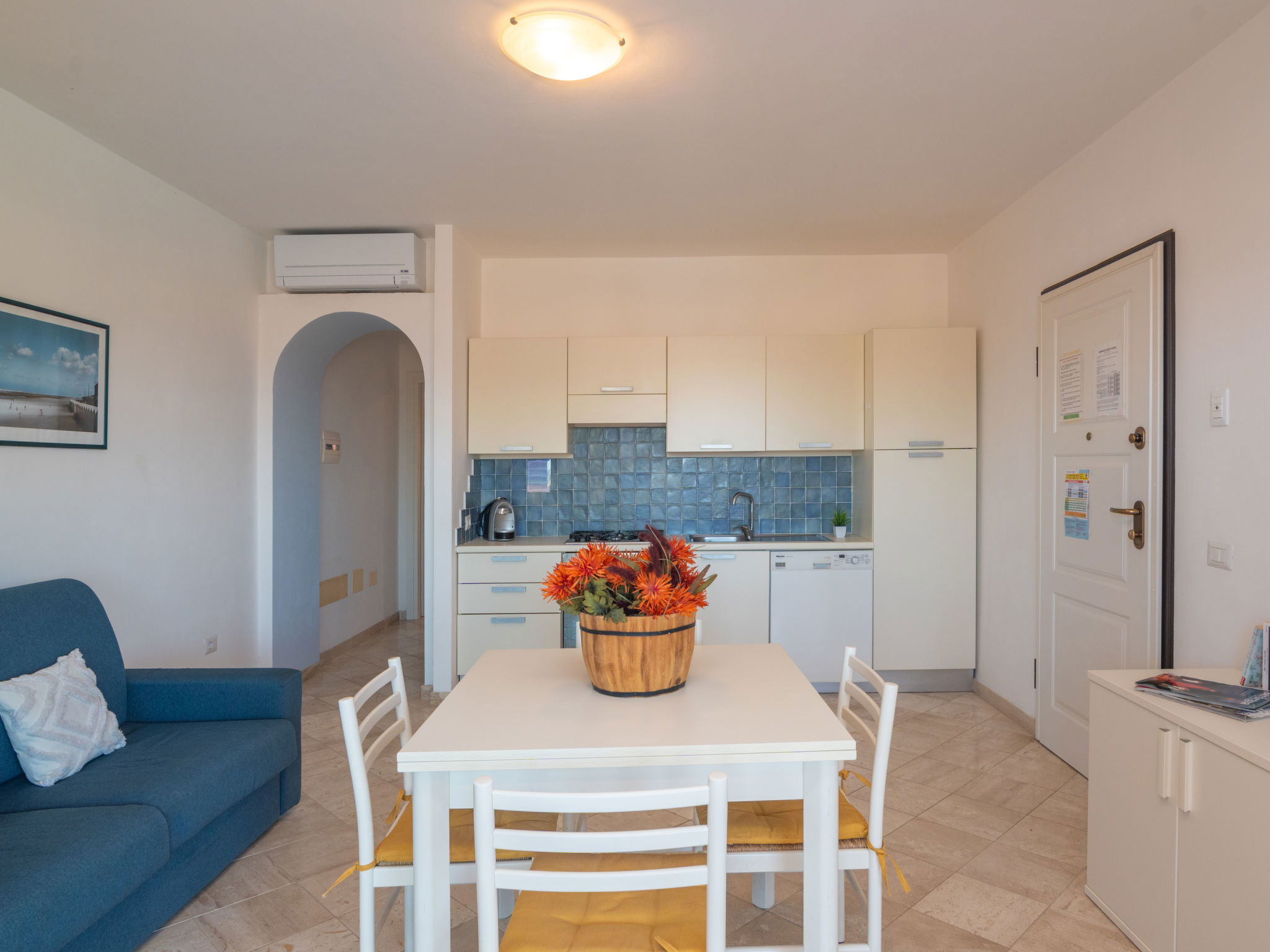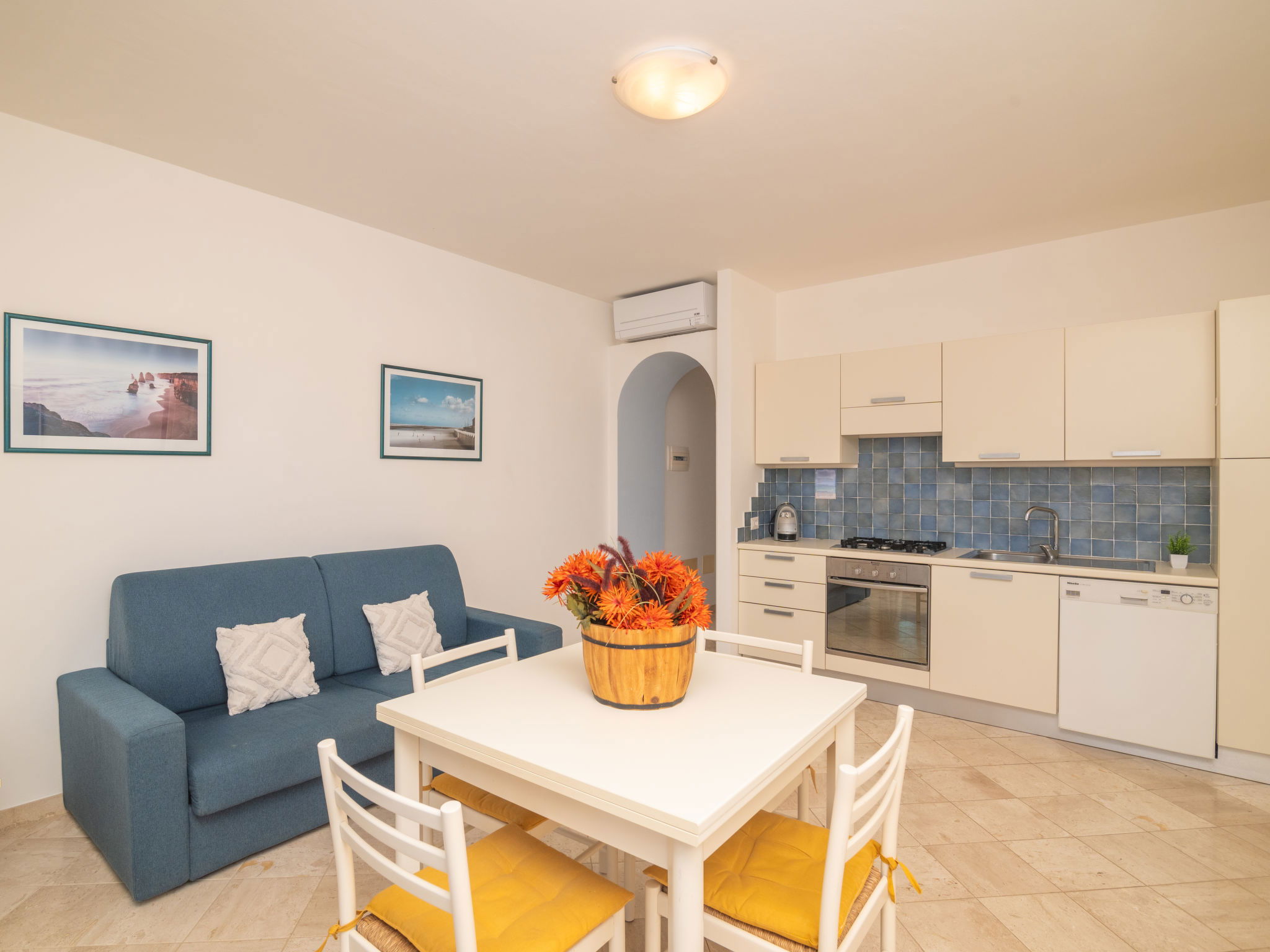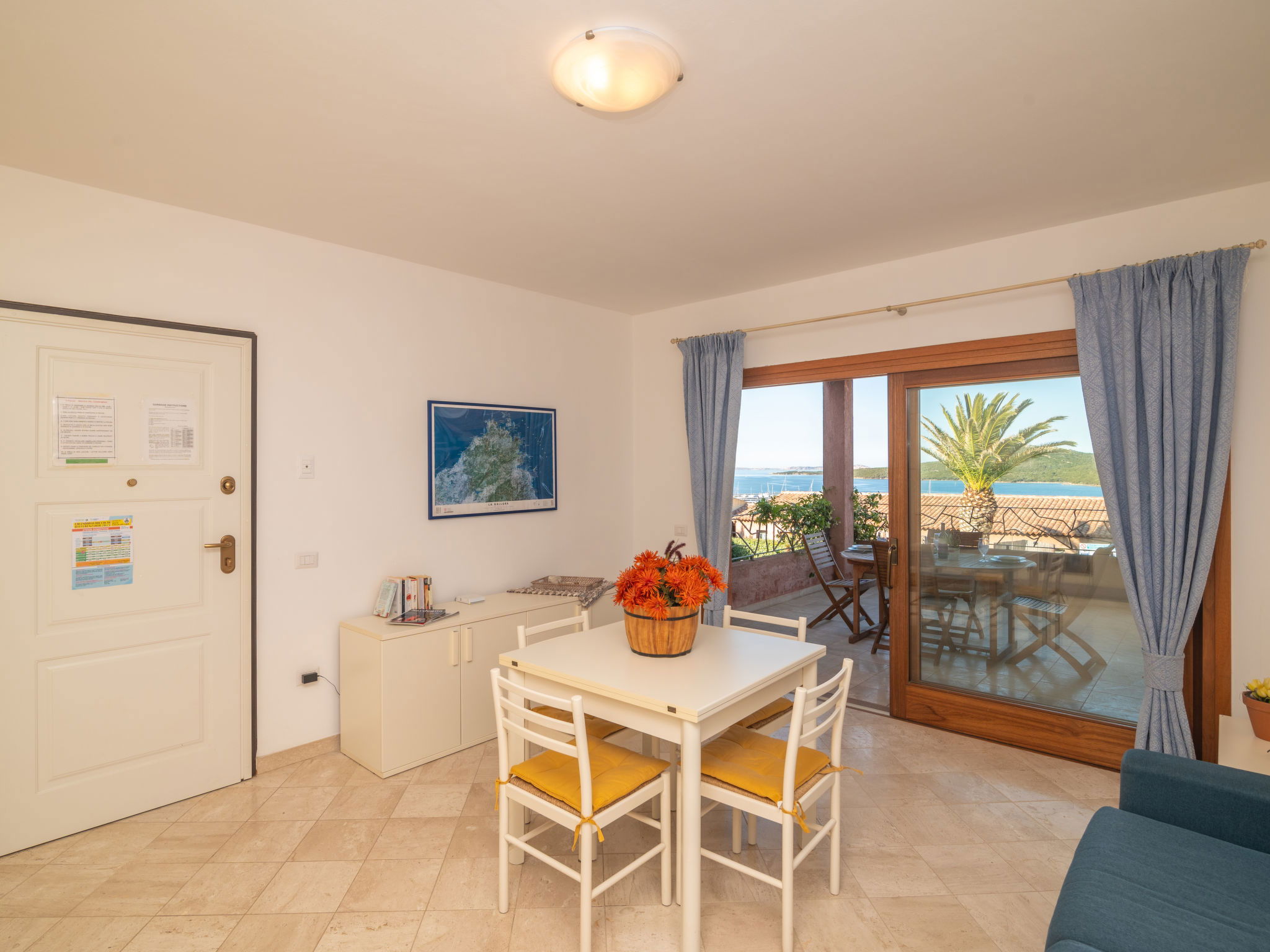 "Il Fjordo bilo ", 2-room apartment 45 m2, on the upper ground floor. Bright, modern furnishings: living/sleeping room with 1 double sofabed and dining table. Exit to the terrace. 1 room with 1 french bed (160 cm). Open kitchen (oven, dishwasher, 4 gas rings, toaster, electric coffee machine). Shower/WC. Electric heating, air-conditioning. Balcony 10 m2. Balcony furniture, deck chairs (2). Marvellous view of the sea and the swimming pool. Facilities: washing machine, children's high chair, baby cot. Internet (WiFi, free). Maximum 1 pet/ dog allowed.