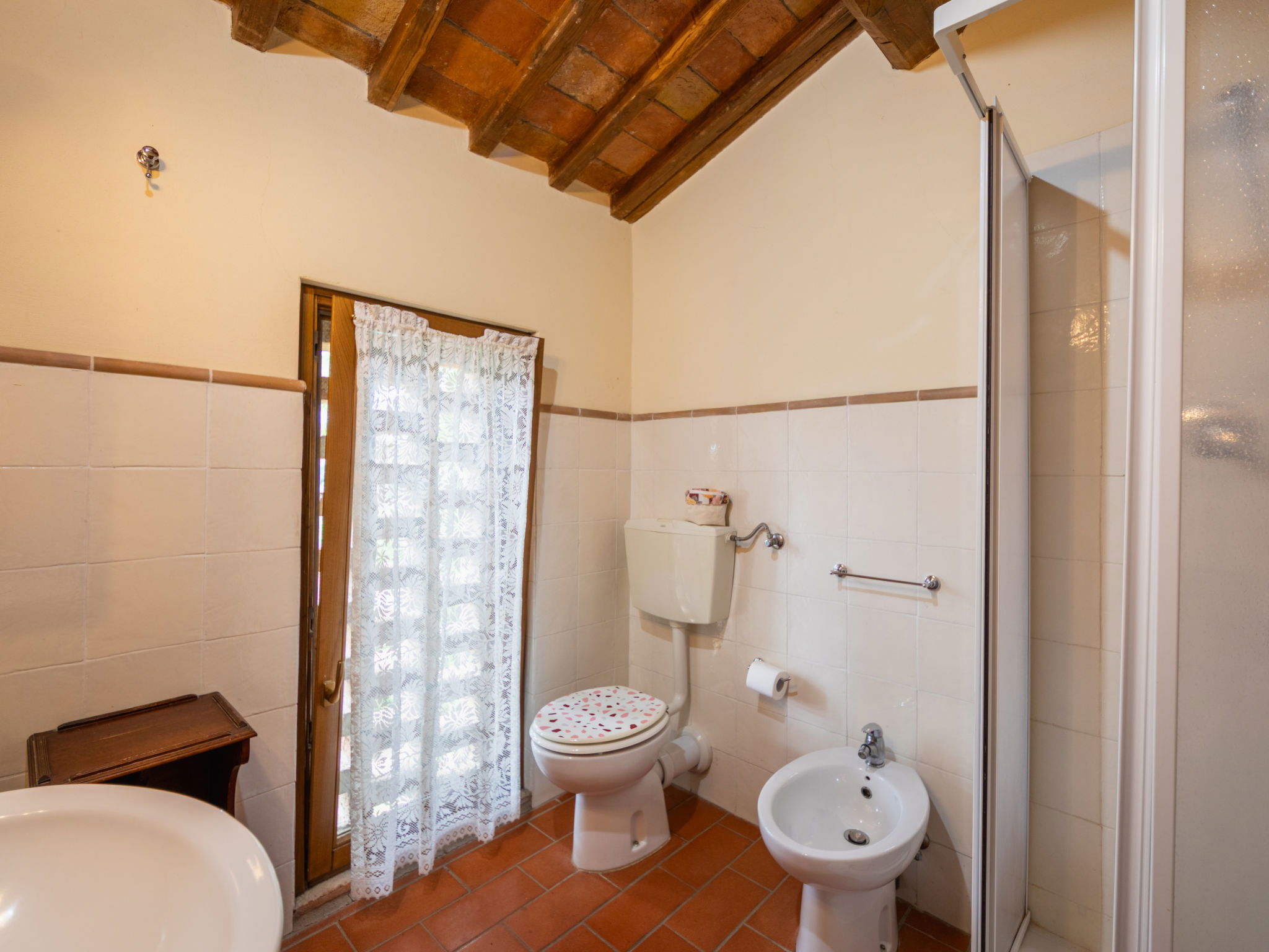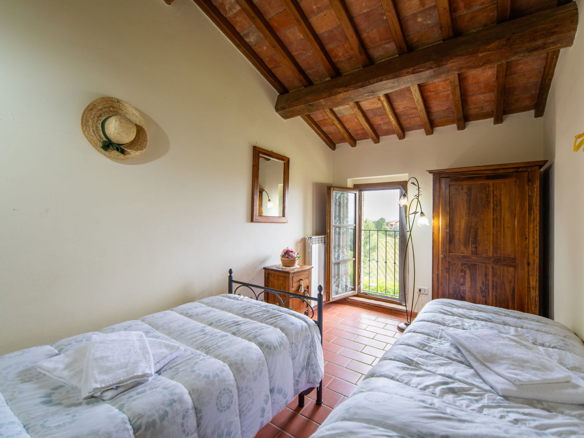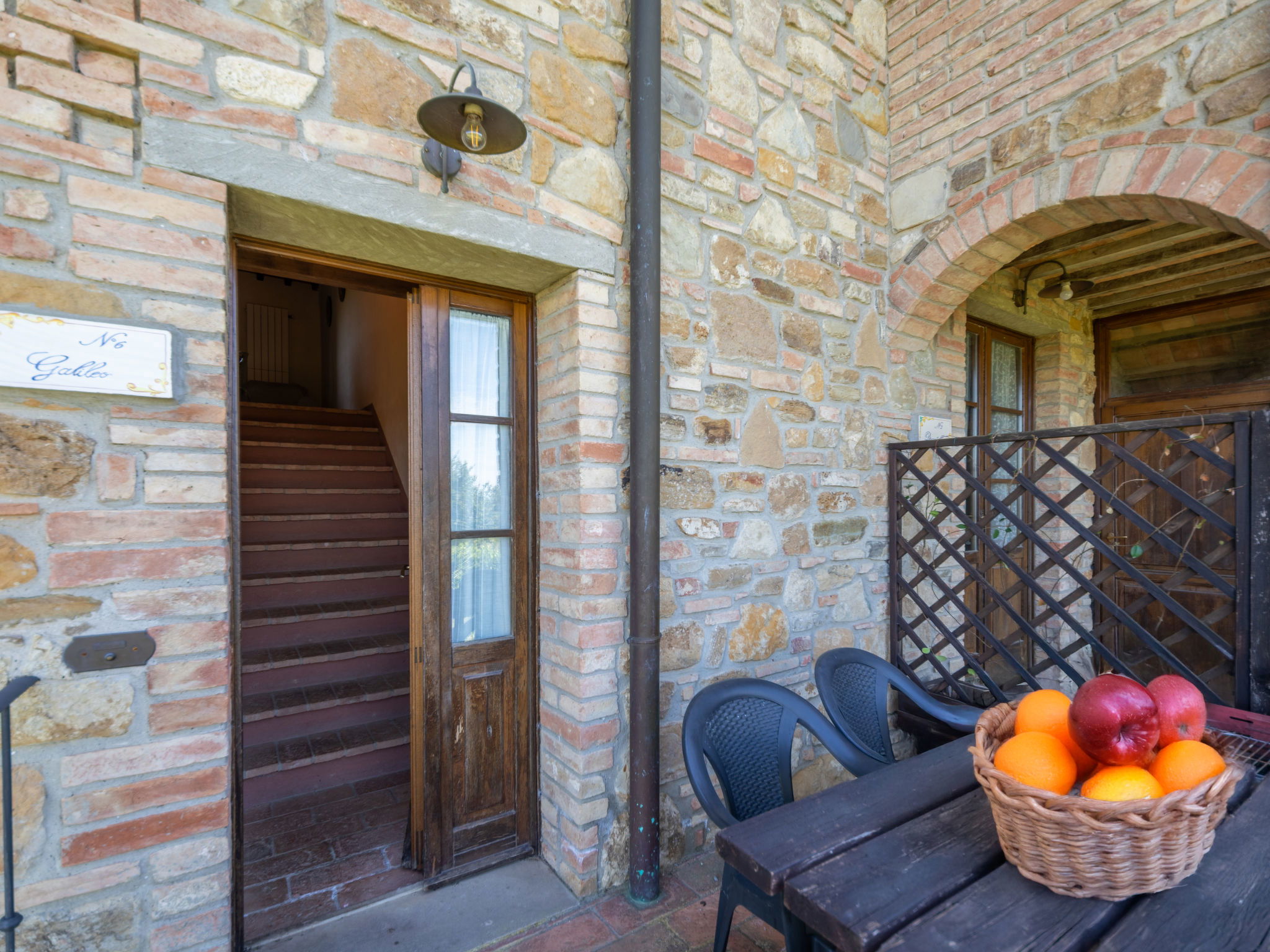Montaione 19 km from San Gimignano: Agriturismo Casa Bacceli is divided into 7 apartments, one of which is occupied by the owner. The agroturismo is situated on a hill approx. 2 km from the centre of Montaione, in an oasis of peace and tranquility. An ideal place for relaxing holiday walking in the open air and in the Tuscan countryside - a perfect base for visiting the art cities in the region such as Volterra approx. 20 km, Siena and Lucca approx. 50 km, the Etruscan beaches approx. 60 km. Large working farm "Baccelli". 7 apartments in the property. 2 km from the centre of Montaione, 15 km from the centre of San Gimignano, 50 km from the centre of Firenze, in a secluded, quiet, sunny position on top of a hill. For shared use: garden (fenced), swimming pool (15 x 9 m, depth 120 - 200 cm, seasonal availability: 27.Apr. - 28.Sep.). Garden furniture, barbecue. In the complex: WiFi, central heating system, heating to be paid on the spot, heating available only from 01.Nov. - 07.Apr.. Motor access to the house (800 m via unmade road). Parking at the house. Shop 2 km, grocery 2 km, supermarket 2 km, bus stop 2 km, railway station "Castelfiornetino" 12 km. Golf course (18 hole) 17 km, tennis 5 km. Nearby attractions: Certaldo 19 km, San Miniato 30 km, San Casciano in Val di Pesa 40 km, Colle Val d'Elsa 40 km. WI-FI in the pool area and garden.