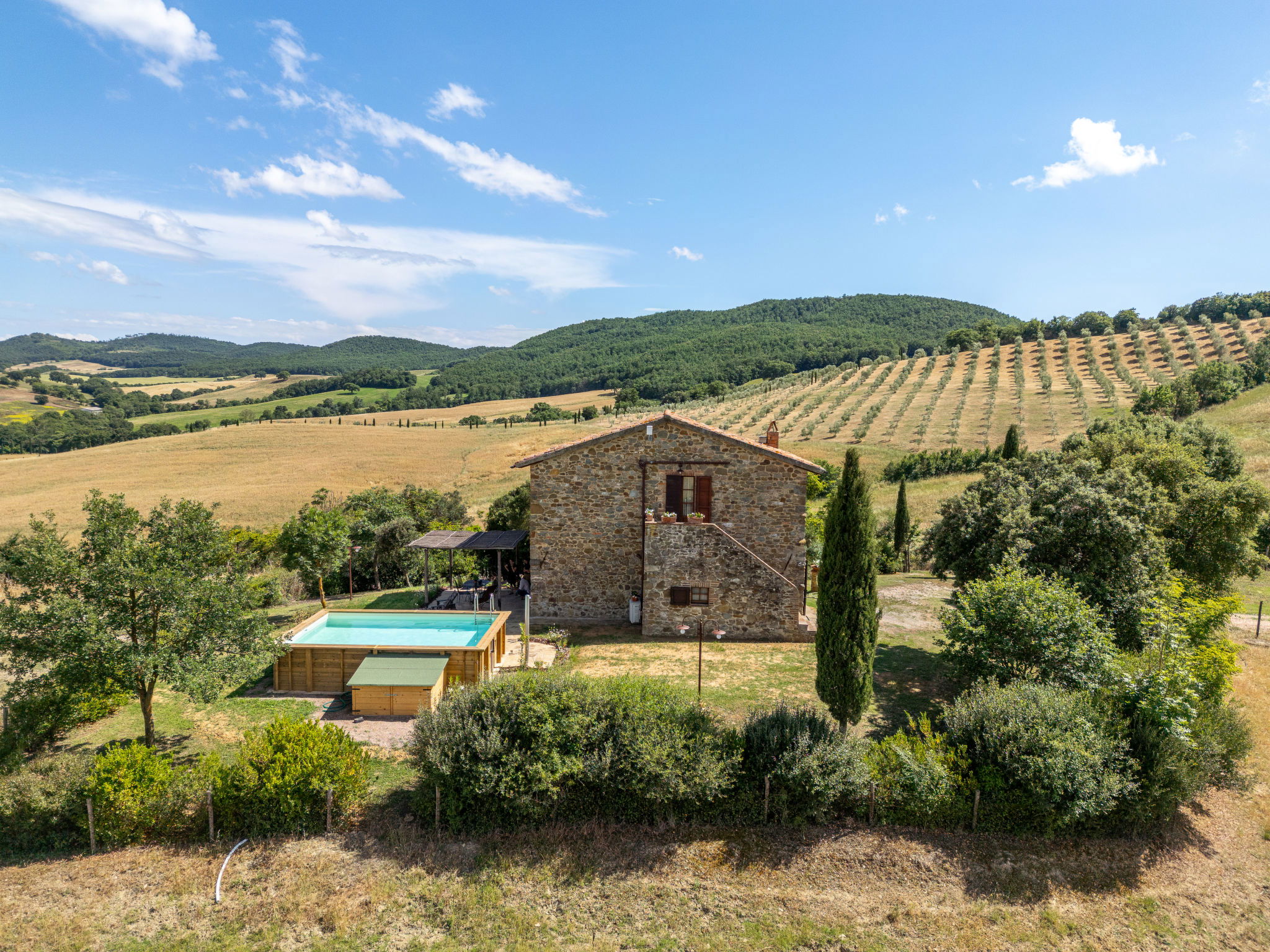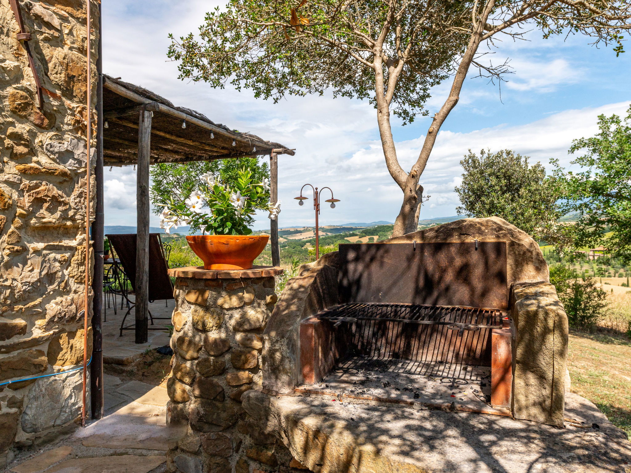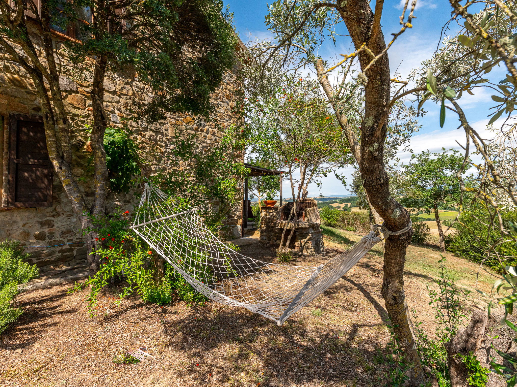 Cosy, rustic house "Le Calle", 2 storeys, detached, surrounded by meadows and vineyards. 13 km from the centre of Cinigiano, in a secluded, quiet, sunny position, 50 km from the sea, in the countryside. For shared use: swimming pool (6 x 12 m, depth 120 - 170 cm, seasonal availability: 01.May. - 30.Oct.). Shower/WC in the pool area, volleyball, barbecue, children's playground, pool maintenance by the owner/gardener. Private: garden (fenced) with lawn and wildlife garden, swimming pool (above ground) (3 x 4 m, seasonal availability: 01.Jun. - 30.Sep.). In the complex: reception. 2.5 km long steep motor access (via unmade road). Parking at the house. Grocery 3.5 km, supermarket 13 km, restaurant 6 km. Riding stable 13 km, walking paths from the house 20 m. Nearby attractions: Montalcino 35 km, Val d´Orcia, Monte Amiata, Castiglione della Pescaia 50 km. Hiking paths: Parco dell´Uccellina 50 km. Please note: car recommended. Local sale of farm products. The big common swimming pool is 2500m from the house, reached by a gravel road. From the 2024 season, a private above-ground pool will be available at the house.