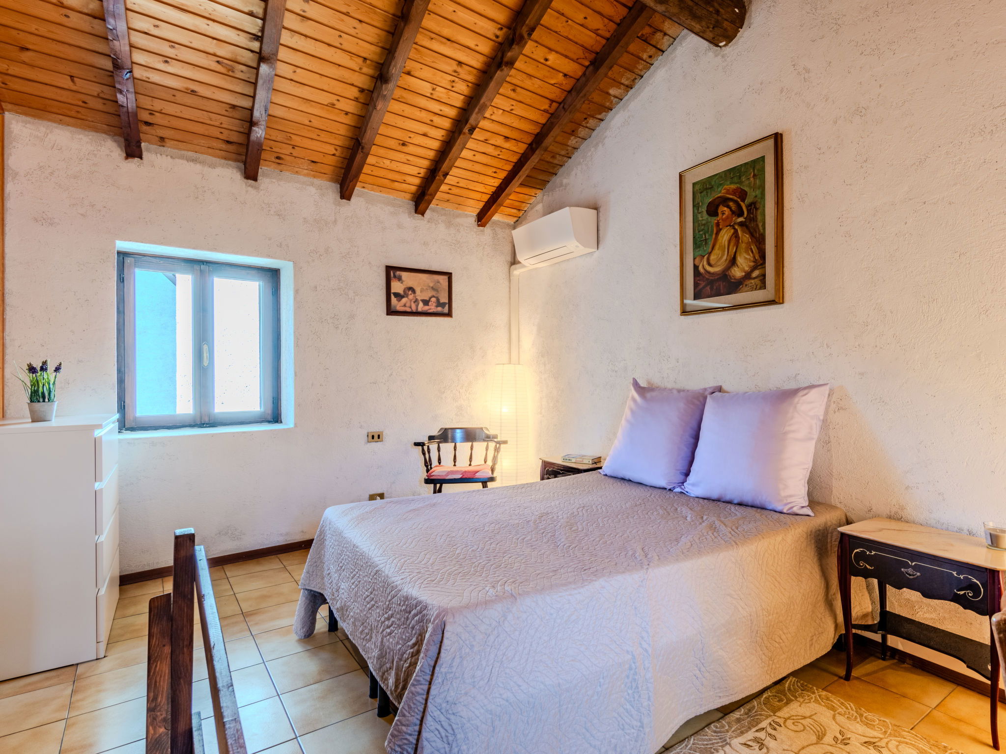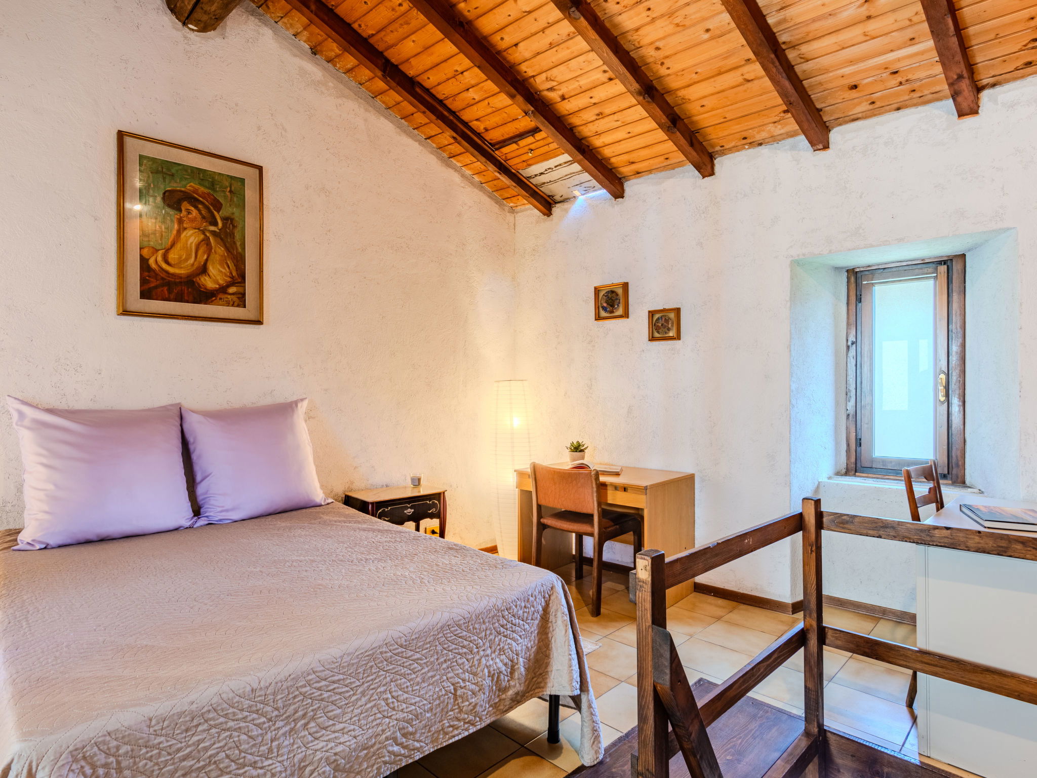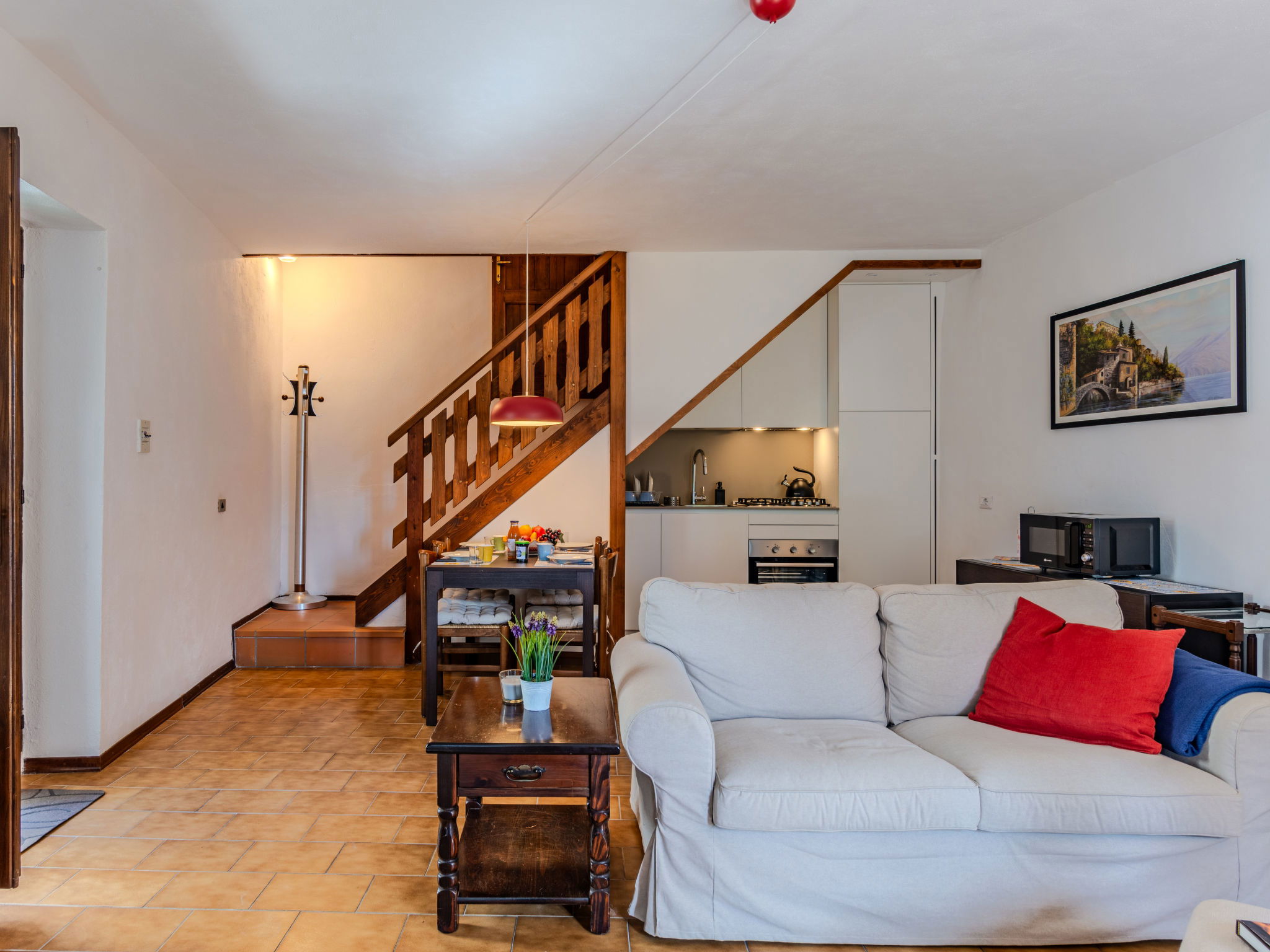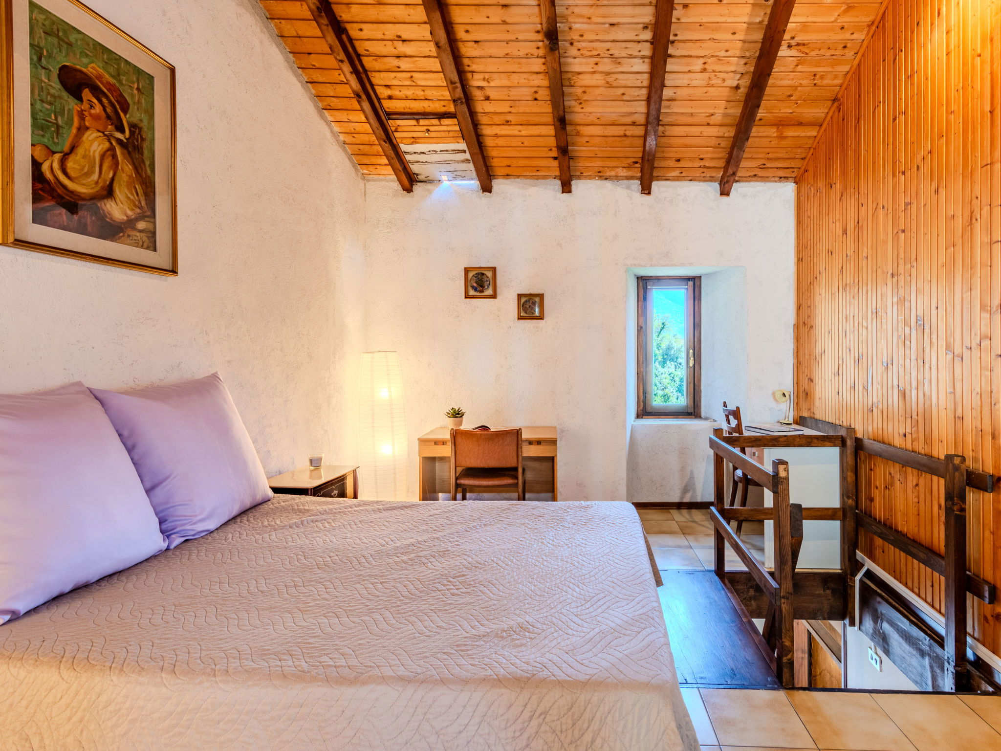 4-room house 80 m2 on 3 levels. Practical and rustic furnishings: open living/dining room with open-hearth fireplace and dining table. Exit to the garden, to the terrace. Kitchenette (oven, dishwasher, Gas stove, 4 gas rings, toaster, microwave, freezer). Upper floor: 1 double bedroom. Bath/bidet/WC. Air-conditioning, forced-air heating. Heating not available in all rooms. 2nd upper floor: (steep stair), 1 open double bedroom with air conditioning. Interconnecting room with 1 double bed. Natural stone floors. Large terrace, small garden. Terrace furniture, barbecue. Very beautiful view of the lake, the mountains and the resort. Facilities: washing machine. Internet (WiFi, free). Please note: non-smoking house, no parking. Maximum 1 pet/ dog allowed. IT013248C2RUTT4ITH