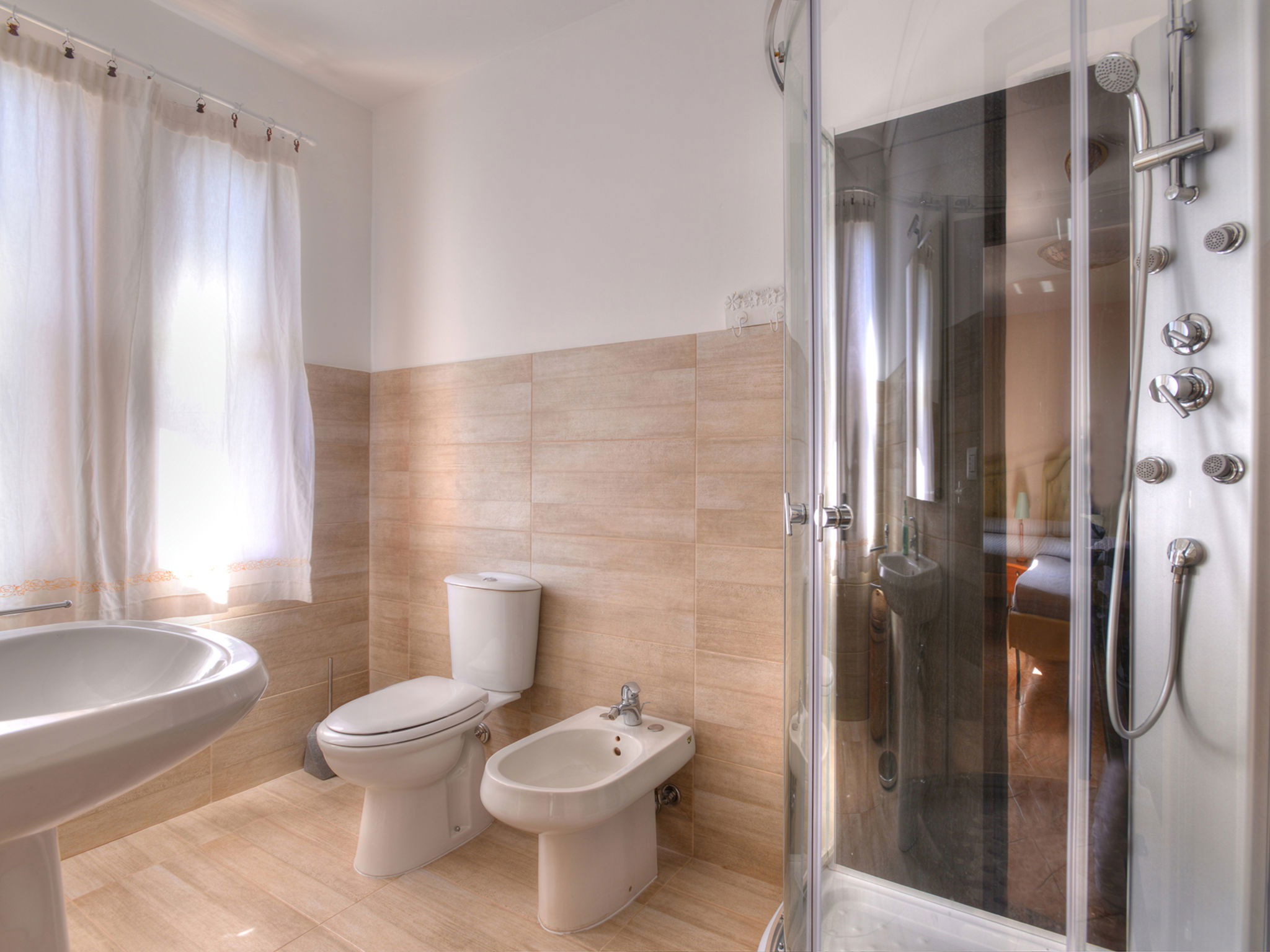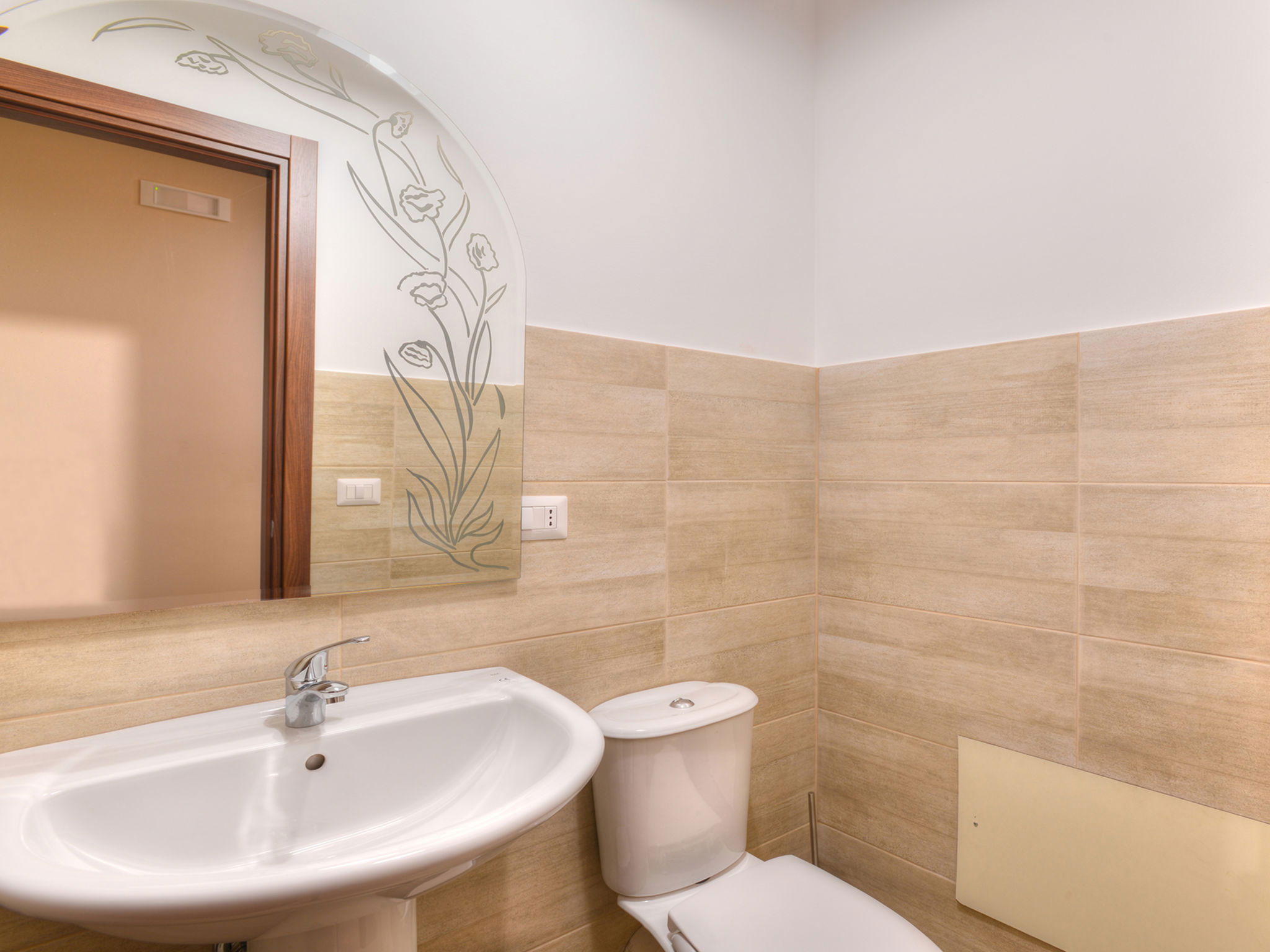 4-room villa 145 m2 on 1st floor. Comfortable and tasteful furnishings: upper floor: living/dining room with panoramic window with open-hearth fireplace and satellite TV. Exit to the terrace. 2 double bedrooms, each room with shower/bidet/WC and air conditioning. 1 double bedroom with 1 bed, shower/bidet/WC and air conditioning. Kitchenette (4 hot plates, oven, dishwasher, toaster, electric coffee machine). Sep. WC. Heating, forced-air heating. Heating available only from 01.12. to 31.03. Terrace 16 m2, terrace 35 m2, roofed. Terrace furniture, barbecue, deck chairs (7). View of the swimming pool and the resort. Facilities: washing machine, iron, children's high chair, baby cot for up to 2 year olds, hair dryer. Internet (WiFi, free). Parking (3 cars). Please note: smoke alarm, fire extinguisher. IT089017C2ZTKT3ID9