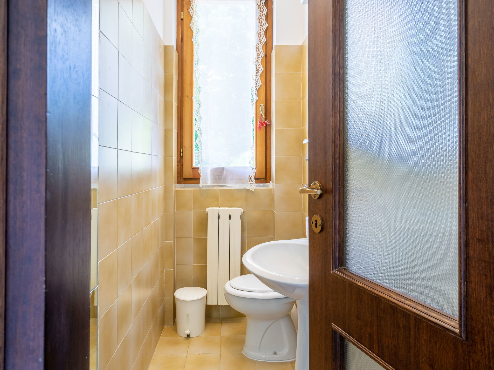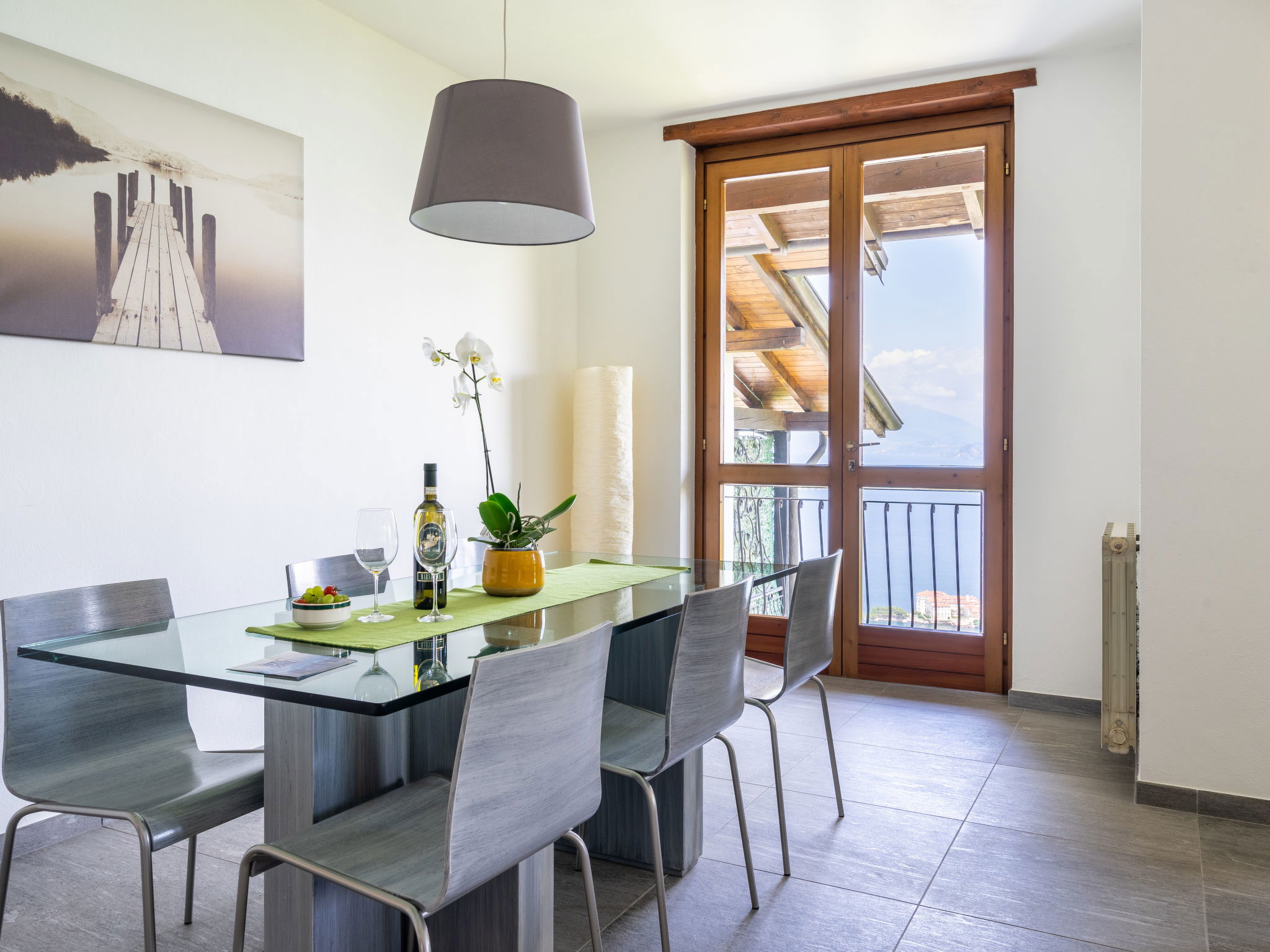 5-room house 135 m2 on 3 levels. Bright, practical and modern furnishings: living/dining room with dining table and satellite TV. Exit to the garden. 1 room, window onto the living room with 2 beds and 1 french bed (160 cm). Open kitchen (4 hot plates, oven, freezer). Shower/WC. Upper floor: (exterior staircase) large living/sleeping room with 1 sofabed (140 cm), open-hearth fireplace, dining table and satellite TV. Exit to the balcony. Open kitchen (oven, 4 gas rings, freezer). Sep. WC. 2nd upper floor: 1 room with 1 french bed (180 cm). 1 room with 2 beds and 1 pull-out bed. Open kitchen (oven, 4 gas rings, toaster). Bath/WC. Gas heating. Wooden floors. Balcony, patio. Terrace furniture, balcony furniture. Panoramic view of the lake. Facilities: washing machine, children's high chair, baby cot for up to 2 year olds. Internet (WiFi, free). Please note: non-smoking house. Maximum 1 pet/ dog allowed. No internal connecting door between the separated properties. Bed layout is flexible. There are more sleeping options available than the maximum number of people allowed which may, however, not be exceeded. IT103064C2XCVAppartement76E,IT103064C28BOCZE3R