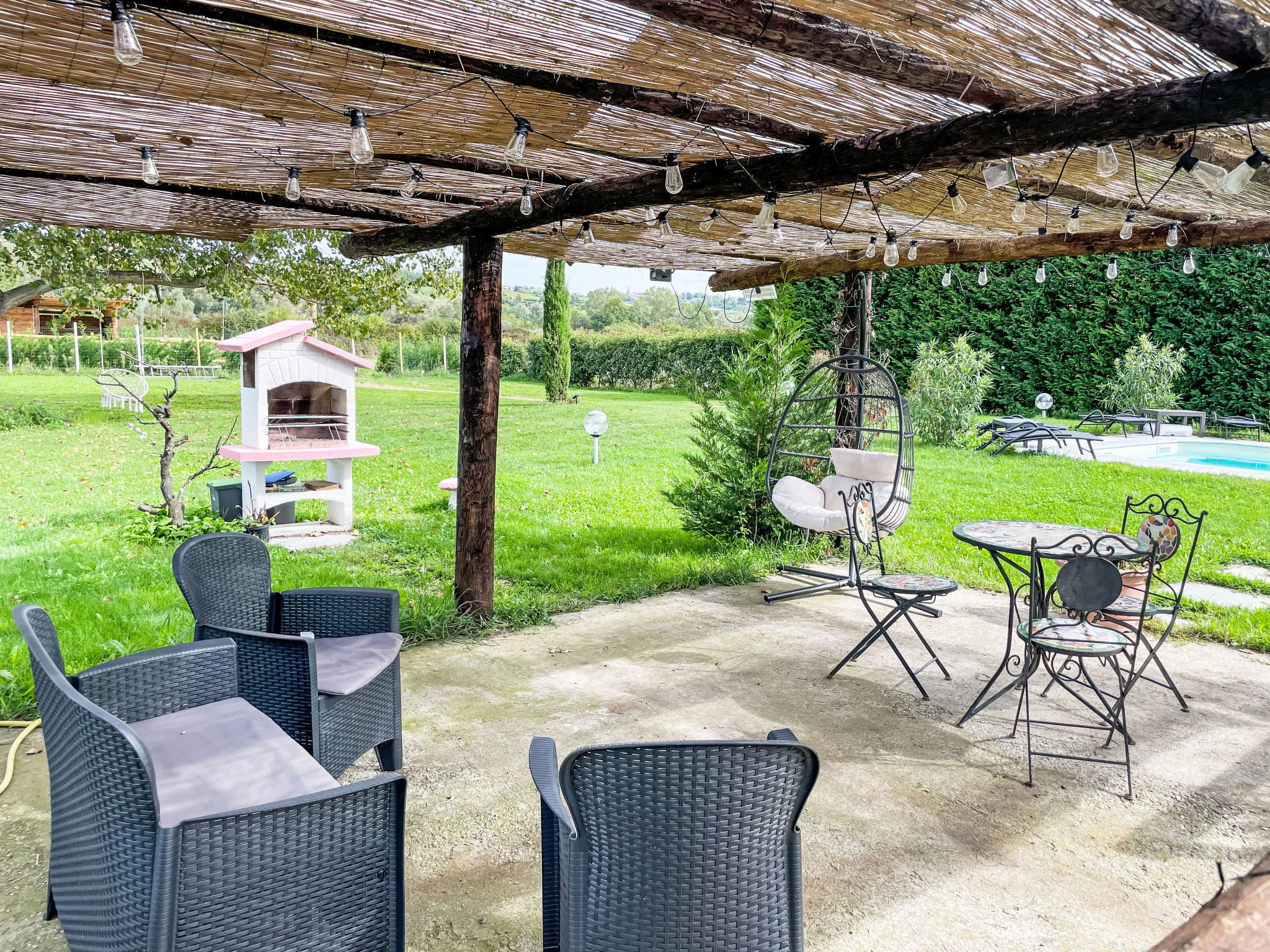 Cosy 3-family house "Tenuta Beatrice", 2 storeys, surrounded by meadows. 200 m from the centre of Castell' Alfero, in a busy position, on a main road. For shared use: property 5'000 m2 with lawn and trees, swimming pool (10 x 4 m, depth 160 cm, seasonal availability: 01.May. - 15.Oct.) with salt water. Outdoor shower, poolhouse with fridge and cooking stove, patio, garden furniture, barbecue, pool maintenance by the owner/gardener. In the house: storage room for bicycles. Parking at the house on the premises. Supermarket 1 km, restaurant 400 m, bus stop 100 m. Nearby attractions: Asti 12 km, Alba 43 km. Please note: car recommended. On the estate animal husbandry. The owner lives in the same residence. The owner has a dog.