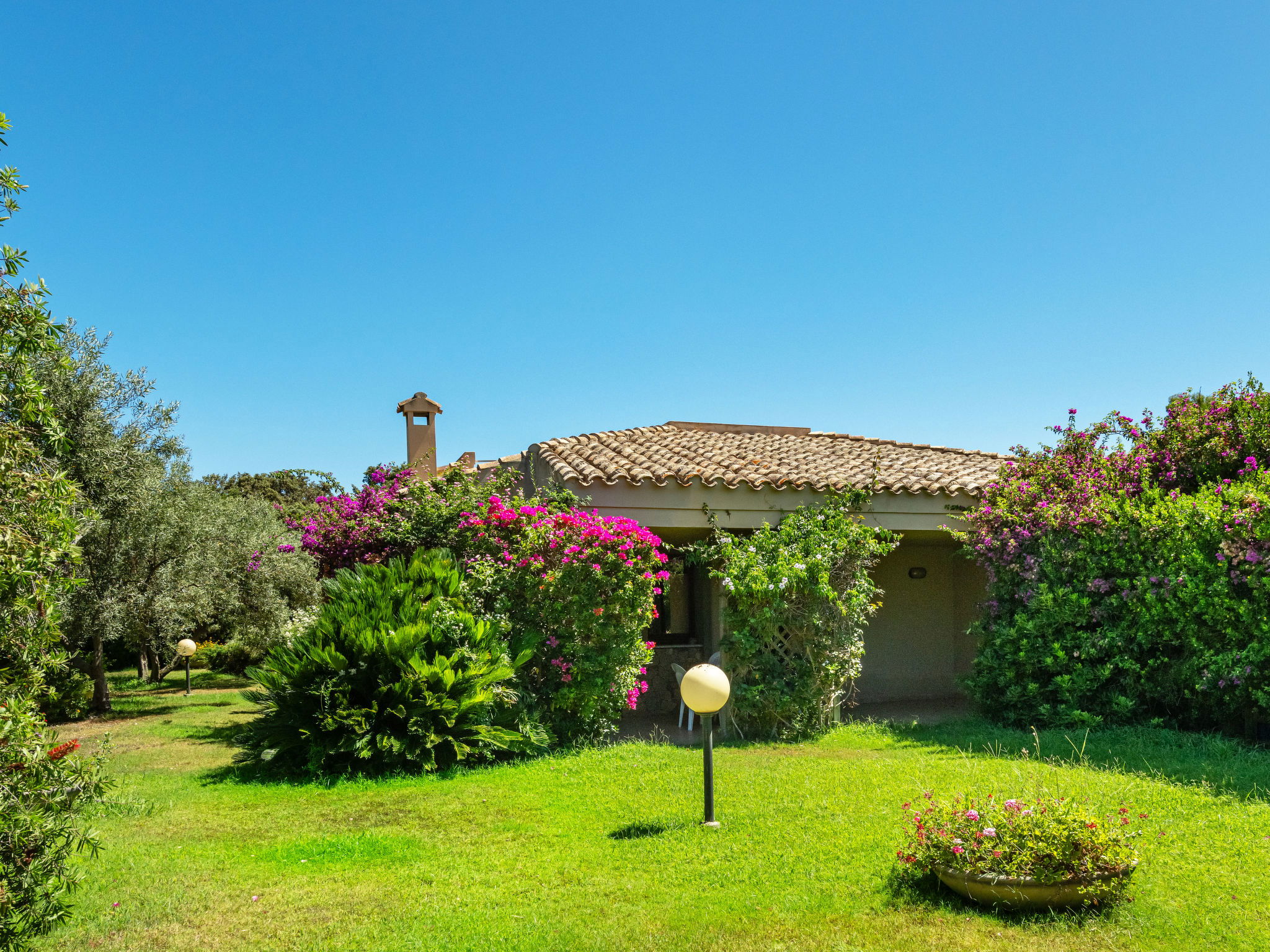 Comfortable residence "Carlo", surrounded by trees and meadows. 2.5 km from the centre of Villasimius, in a sunny position residential area (villas), 400 m from the sea, in the countryside. For shared use: garden 200 m2. Private: outdoor shower. Motor access to the house (300 m via unmade road). Parking on the premises. Supermarket, restaurant, bar 200 m, bus stop "via Roma La Lanterna" 2 km, railway station "Cagliari" 60 km, ferry "Cagliari" 60 km, sandy beach 400 m. Sports harbour 1 km, golf course (18 hole) 1.5 km. Nearby attractions: Cagliari 50 km, Punta Molentis 8 km, Costa rei 15 km. Please note: car recommended. Animals in the neighbourhood. The photograph shows a typical example. The complex consists of 5 independent cottages, close to each other, all with roof terrace accessible via outdoor stairs.