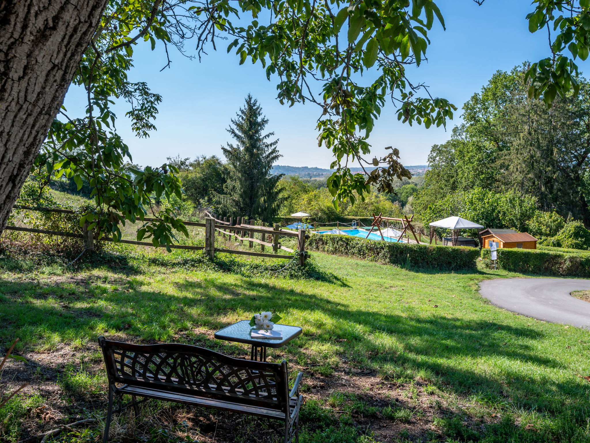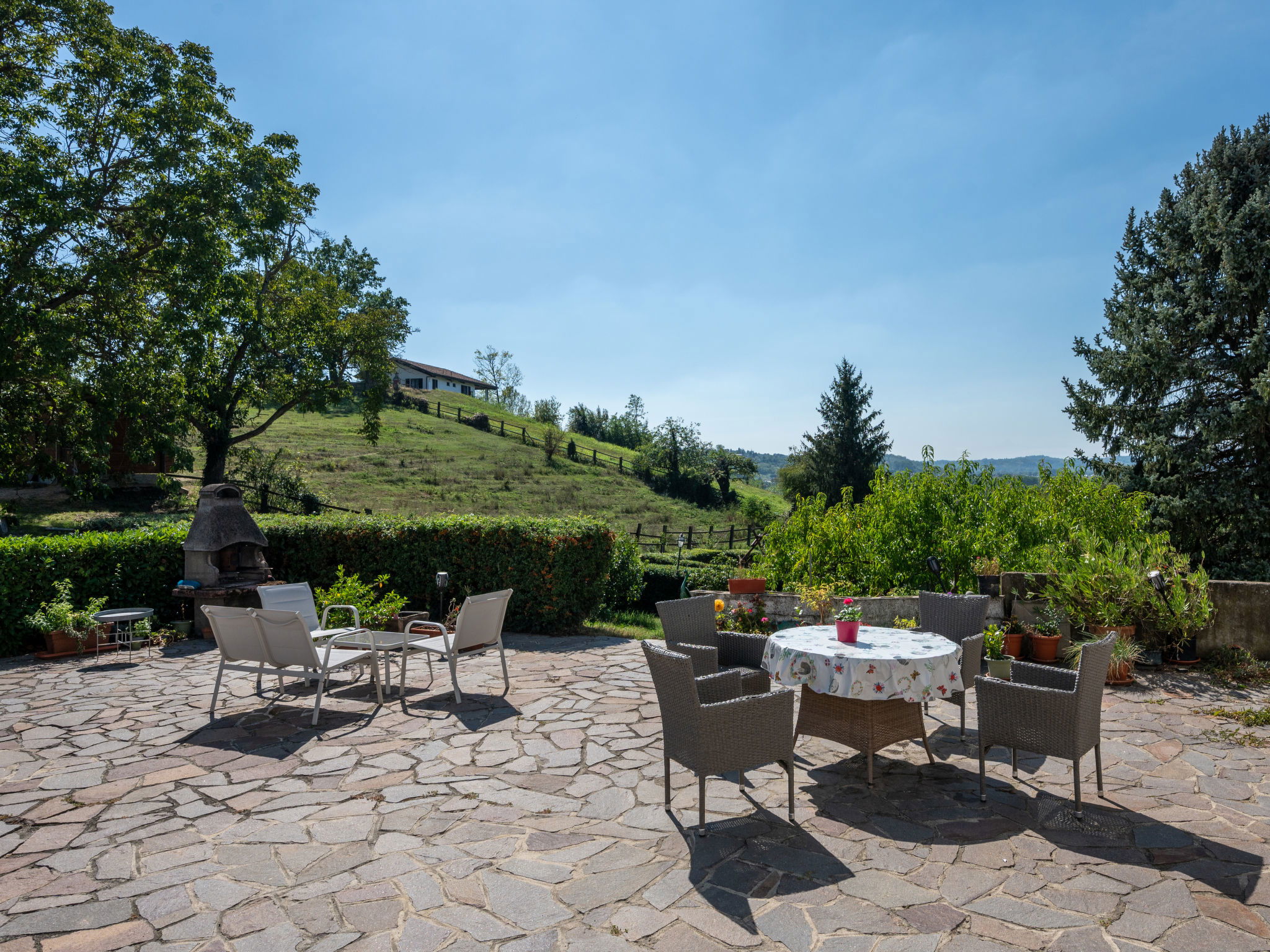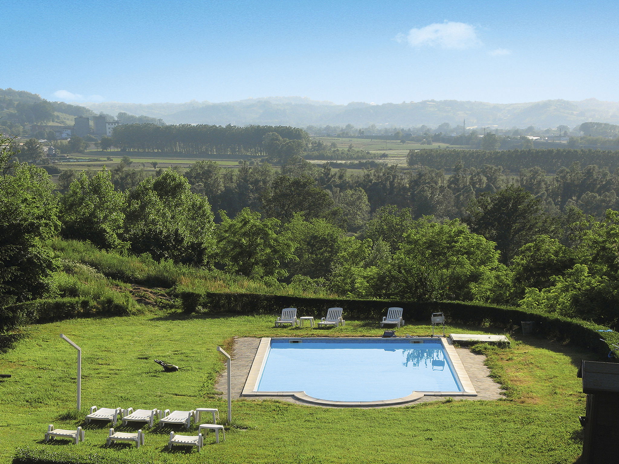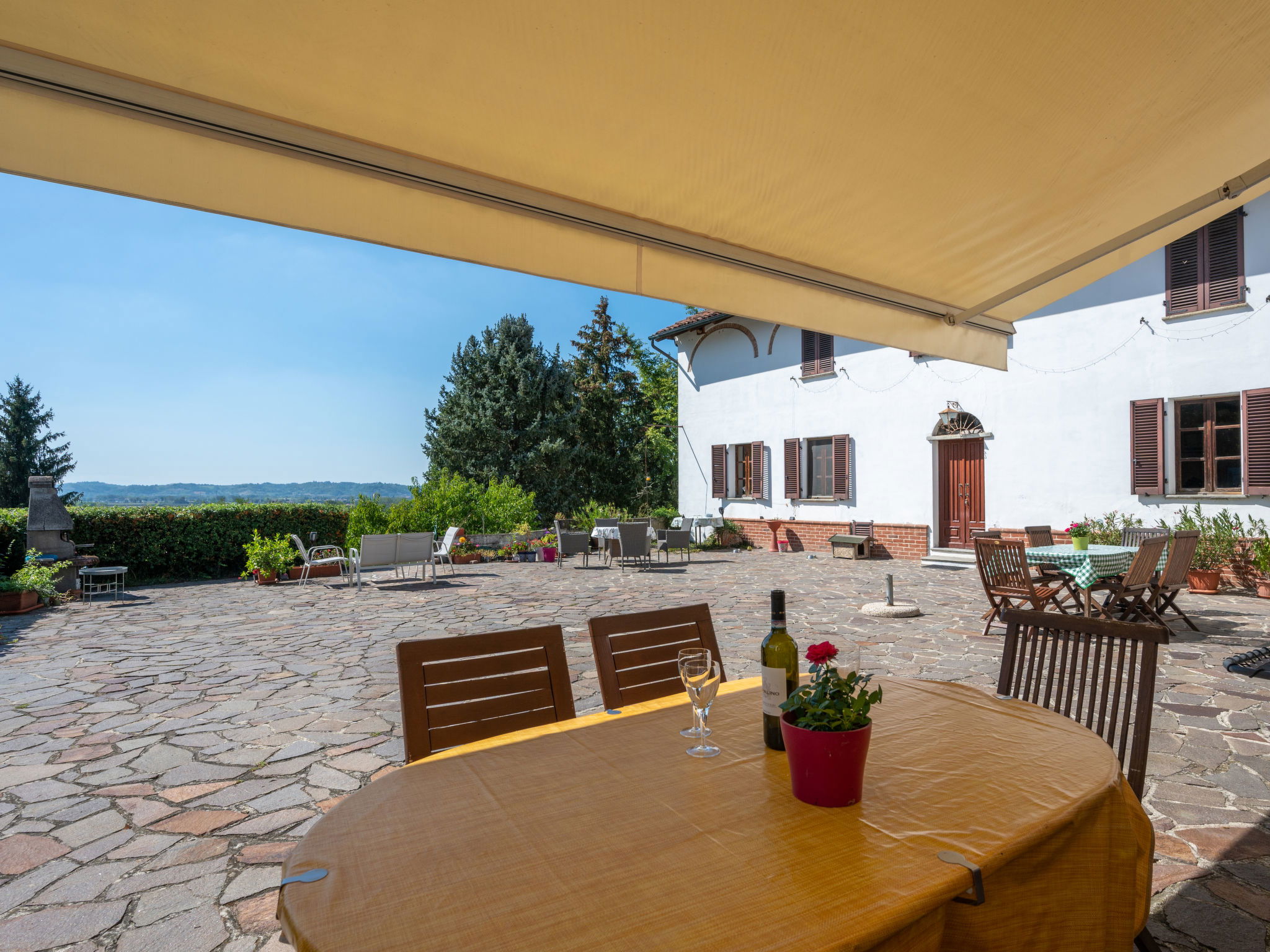 Beautiful country house "Villa Bricchetto", surrounded by meadows and vineyards. 2 apartments in the residence. 4 km from the centre of Asti, 3 km from the centre of Azzano d'Asti, 25 km from the centre of Alba, in a sunny position on a slope. For shared use: property 4'000 m2 (fenced) with trees, natural garden, meadow, lawn for sunbathing, swimming pool (13 x 6 m, depth 80 - 280 cm, seasonal availability: 15.May. - 30.Sep.). Outdoor shower, terrace, garden furniture, pool maintenance by the owner/gardener. In the house: lounge, washing machine (extra) (for shared use). Beverage service (extra). Roofed, parking at the house on the premises. Shop 3 km, supermarket 5 km, bus stop 1 km, railway station "Asti" 5 km. Nearby attractions: Alba 30 km, Neive 25 km, Turin 65 km. Please note: car recommended. On the estate animal husbandry. The owner lives on the same property. The owner has a dog.