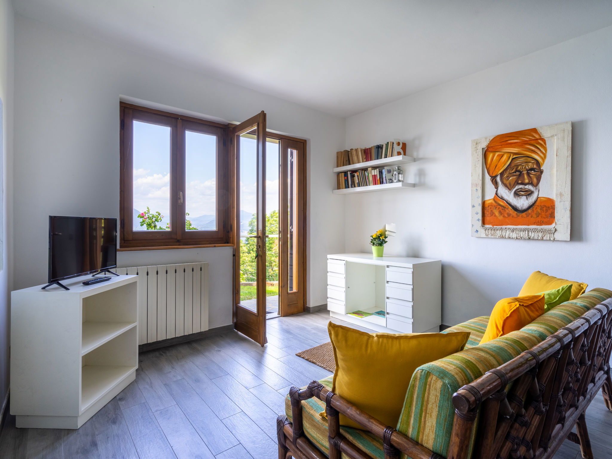 "Tramonto ", 2-room apartment 45 m2, on the ground floor. Bright, practical furnishings: living/dining room with dining table and satellite TV. Exit to the garden. 1 room, window onto the living room with 2 beds and 1 french bed (160 cm). Open kitchen (4 hot plates, oven, freezer). Shower/WC. Gas heating (extra). Patio. Terrace furniture. Panoramic view of the lake. Facilities: washing machine, children's high chair, baby cot for up to 2 year olds. Internet (WiFi, free). Please note: non-smoking house. Maximum 1 pet/ dog allowed. IT103064C28BOCZE3R