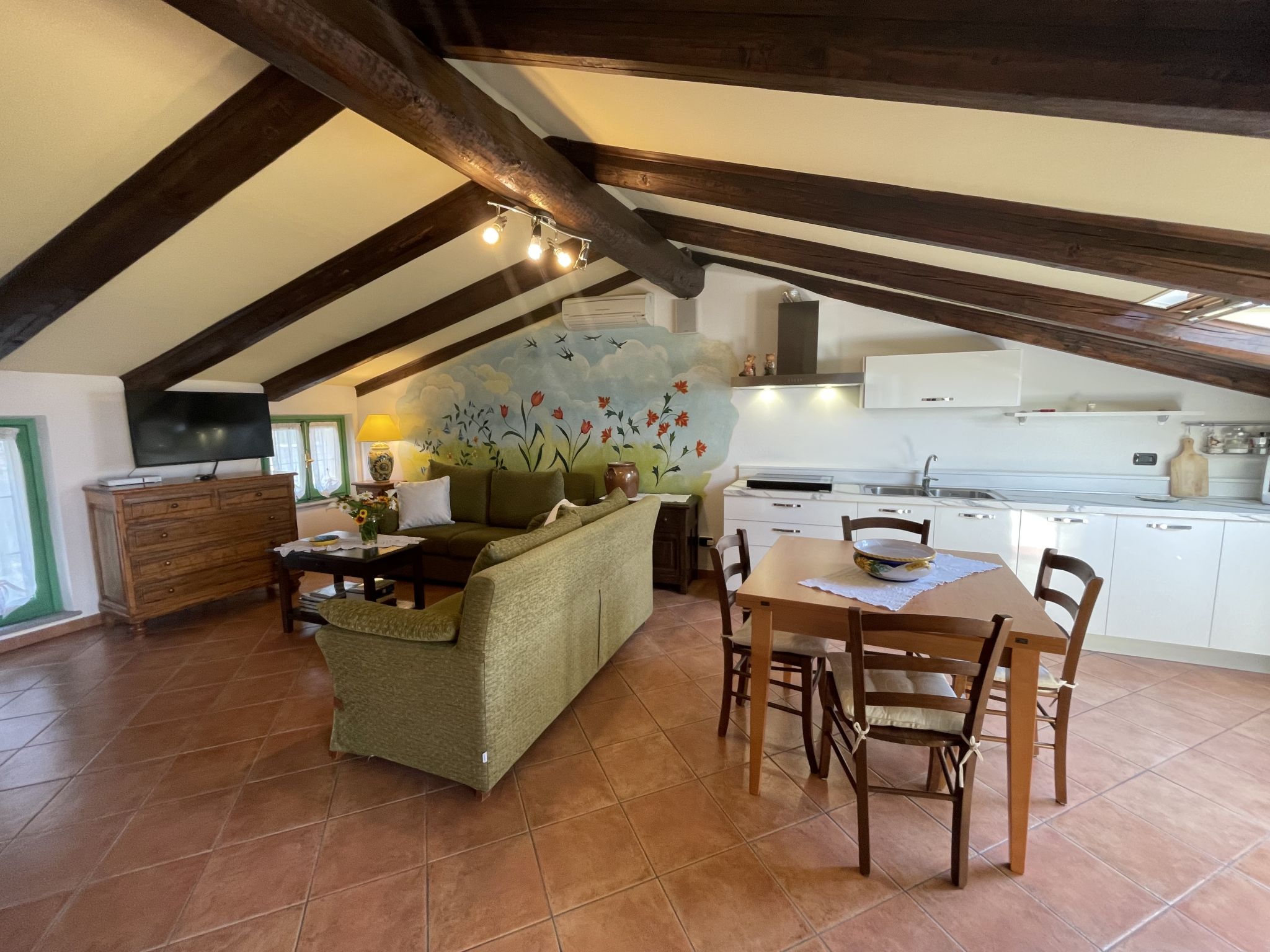 2-room apartment 80 m2, on the top floor. Renovated in 2023, tasteful and cosy furnishings: living room with sloping ceilings with dining table, satellite TV and CD-player. Exit to the terrace. 1 room with sloping ceilings with 1 french bed (160 cm). With sloping ceilings, small, open kitchen (4 gas rings, toaster, microwave, electric coffee machine). Shower/WC. (extra), air-conditioning, underfloor heating. Heating available only from 01.10. to 26.04. Natural stone floors. Terrace, patio. Terrace furniture, barbecue. Panoramic view. Facilities: washing machine. Internet (WiFi, free). Maximum 1 pet/ dog allowed. IT005075C25G7RPYIL