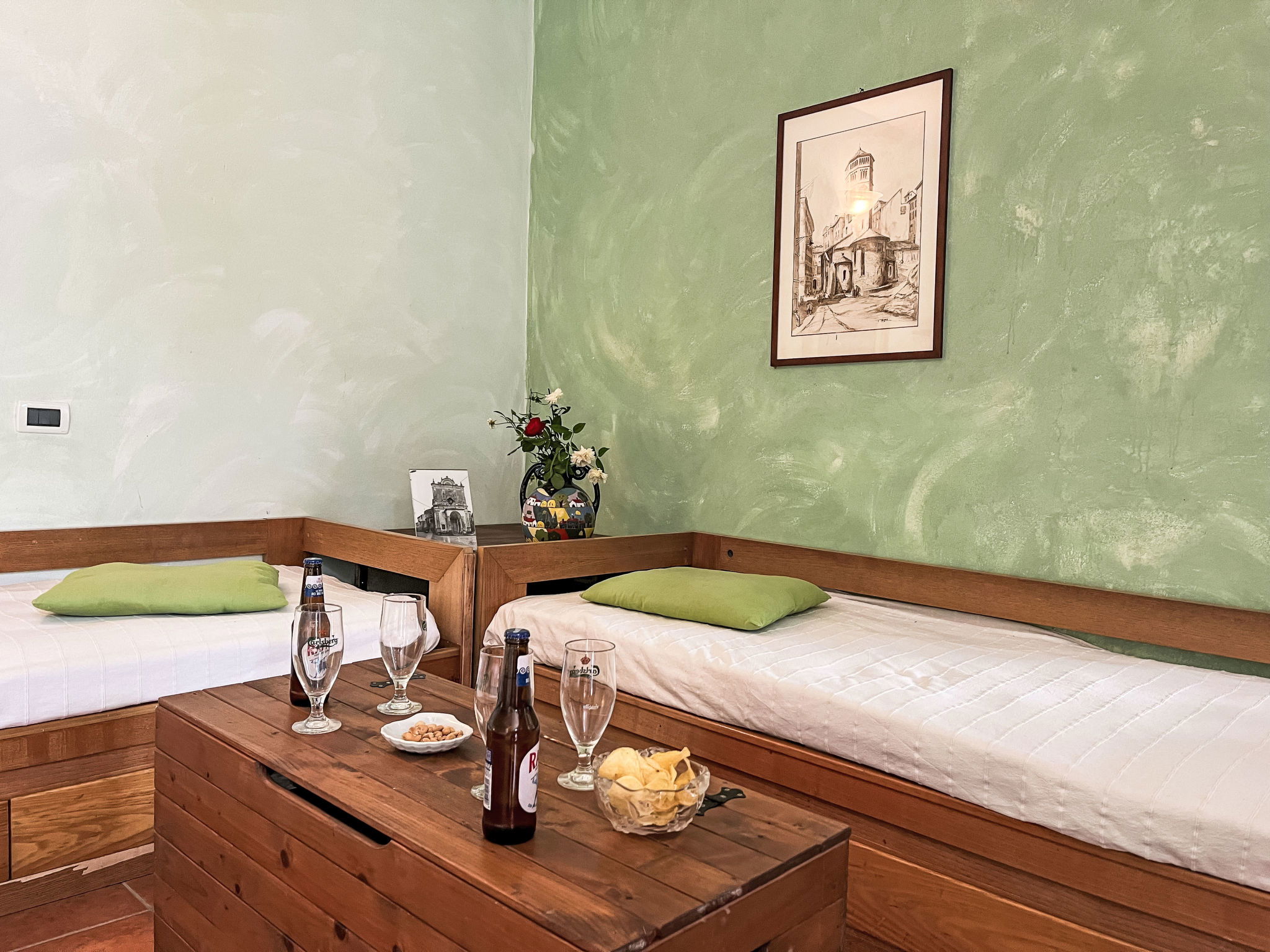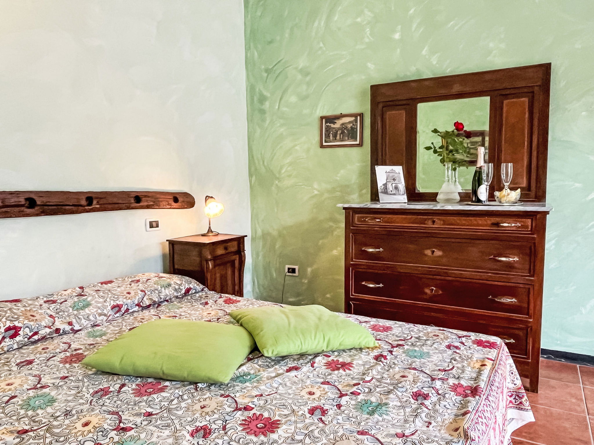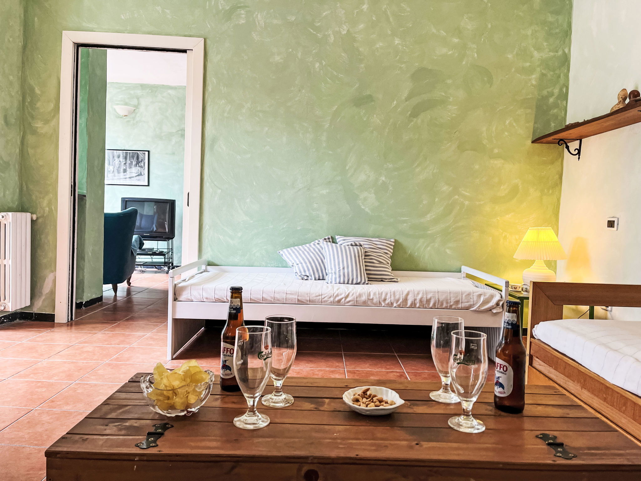3-room apartment 80 m2, on the ground floor. Practical and rustic furnishings: walk-through room with 3 beds (80 cm). Exit to the terrace. Walk-through room with 1 double bed (160 cm). Exit to the terrace. Kitchen-/living room (oven, 4 gas rings, toaster, microwave, electric coffee machine) with dining table. Exit to the terrace. Bath/WC, shower/WC. Gas heating. Terrace. Terrace furniture, barbecue, deck chairs. Facilities: baby cot. Internet (WiFi, free). Please note: maximum 2 pets/ dogs allowed. Private entrance. IT008030C2P5CFAGL8