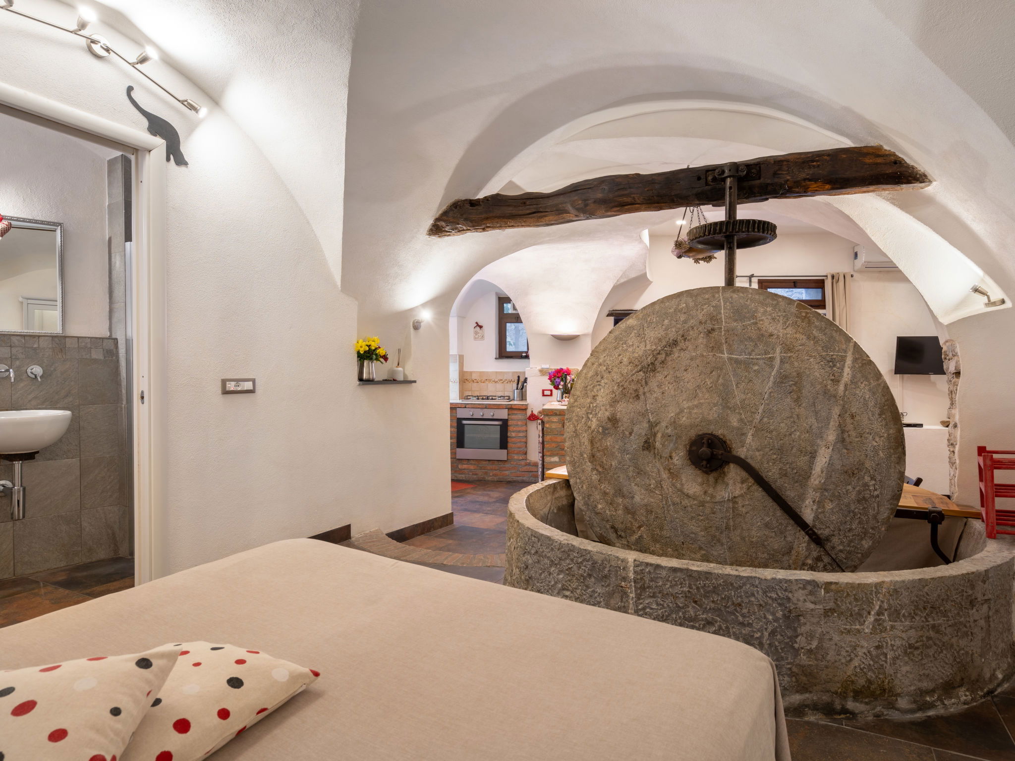 "Mulino Rossi ", 1-room apartment 50 m2, on the ground floor. Rustic and cosy furnishings: living/sleeping room with 1 double sofabed, dining table and satellite TV. Open alcove, on 2 levels with 1 french bed (160 cm). Open kitchen (oven, 4 gas rings, toaster, kettle, electric coffee machine) with bar. Bathroom, shower/WC. Electric heating, air-conditioning. Small terrace. Terrace furniture, deck chairs (2). Facilities: mosquito net, children's high chair, baby cot. Internet (WiFi, free). Please note: maximum 2 pets/ dogs allowed. Private entrance. Instead of an enclosed bedroom, some sleeping areas are located in an open-plan area (gallery, alcove, etc.). IT008041C2P26WZS4H