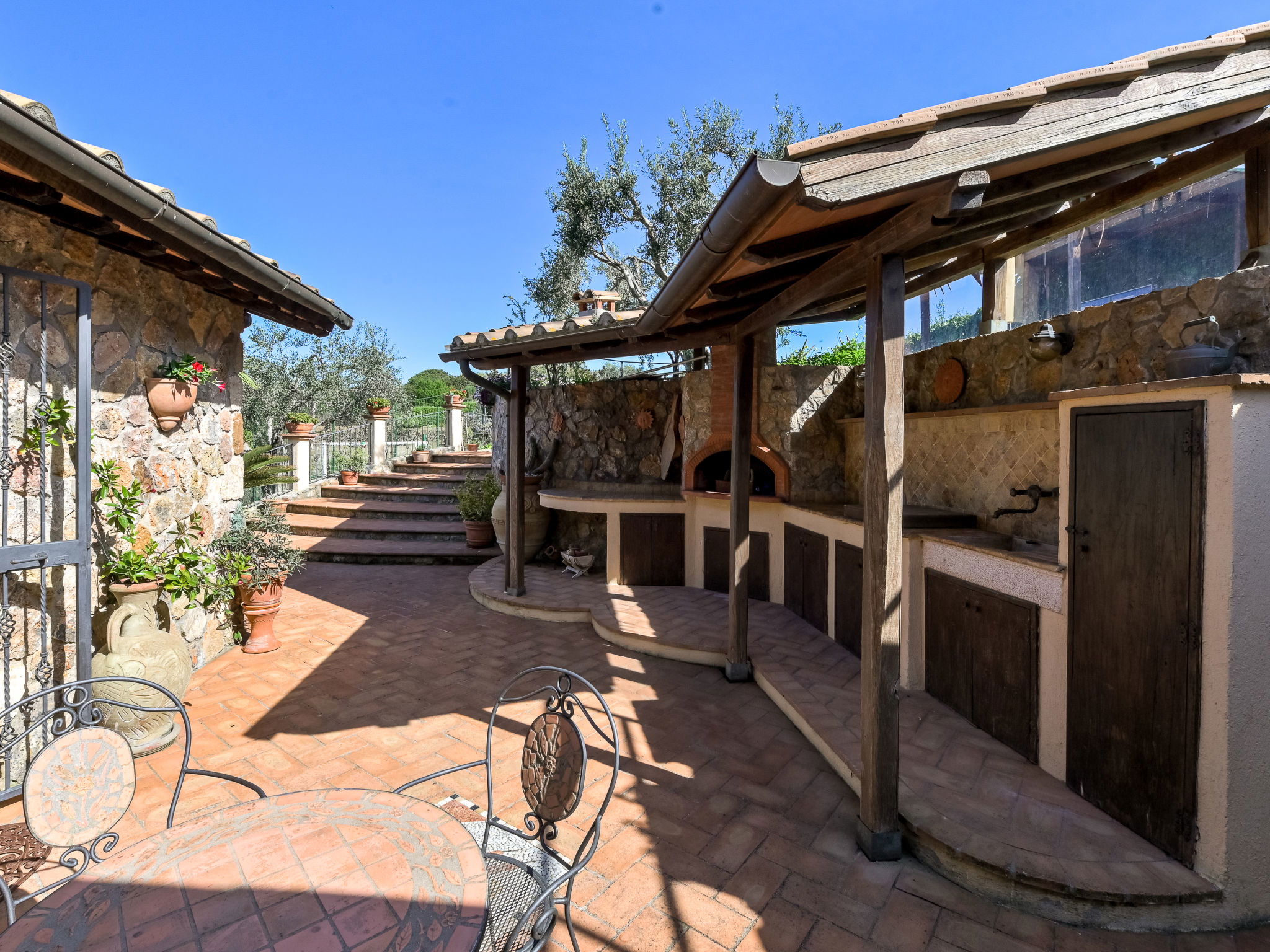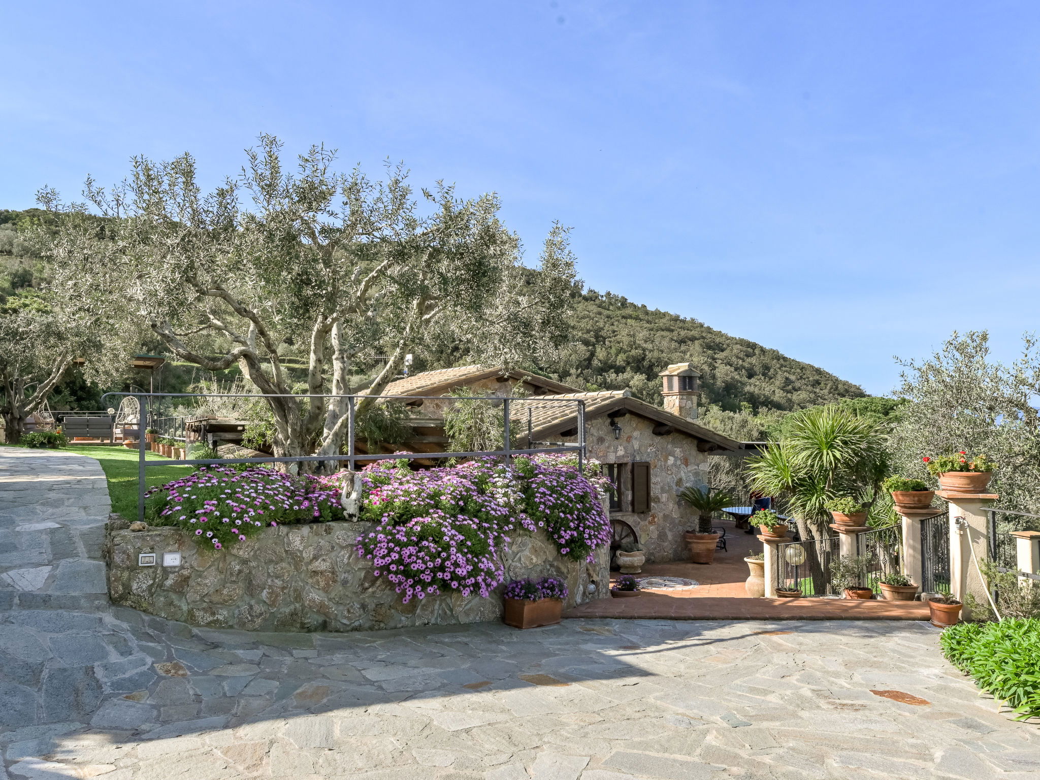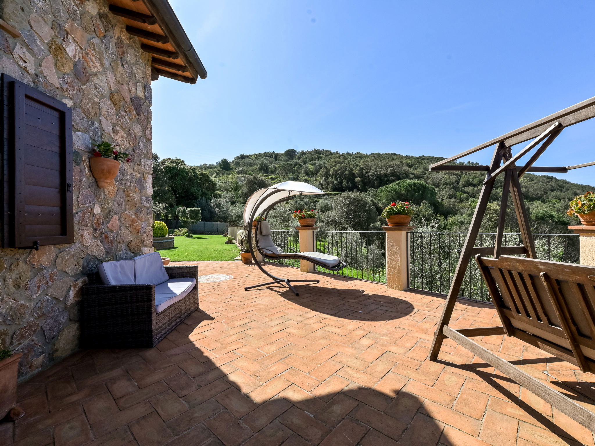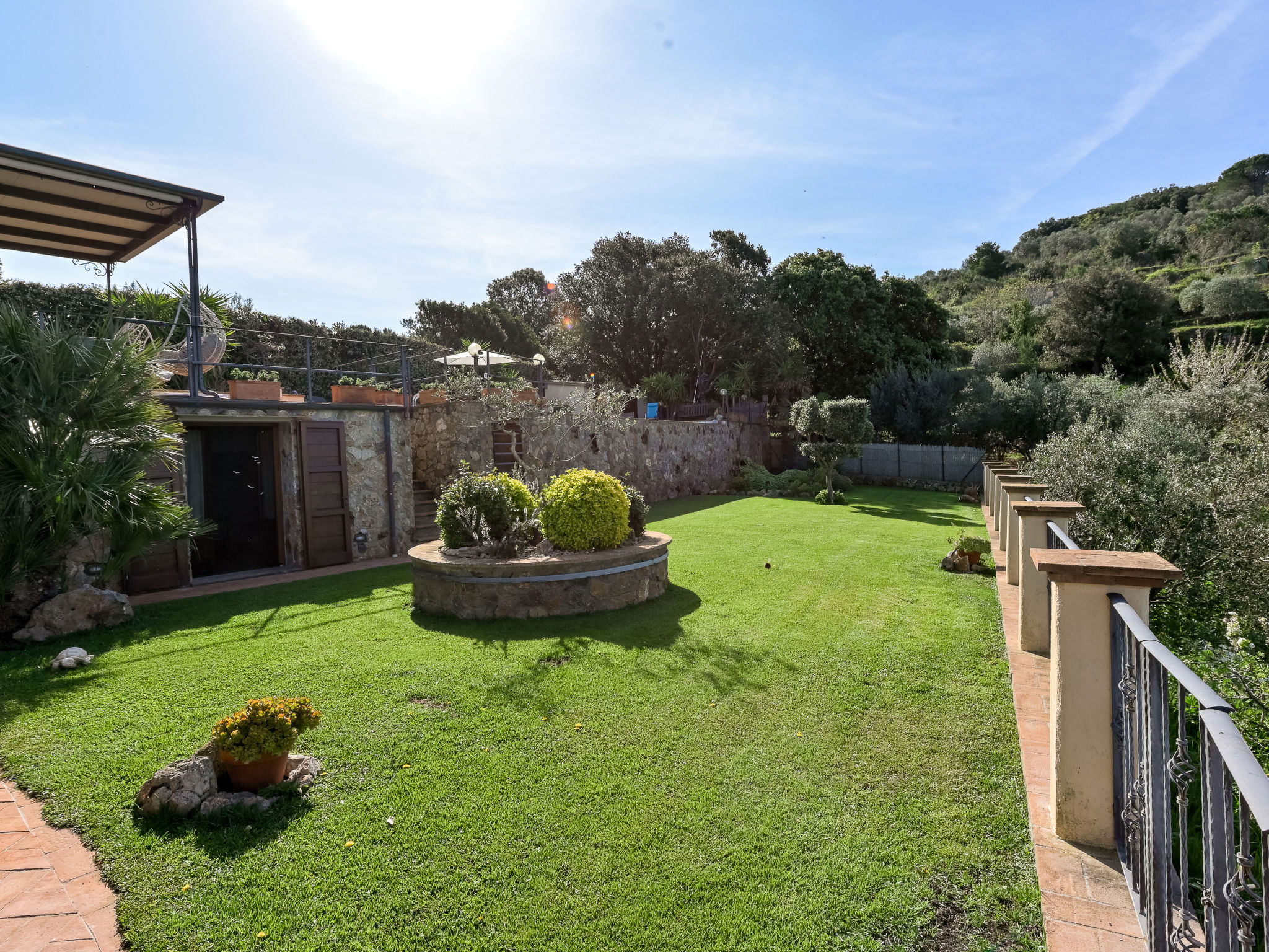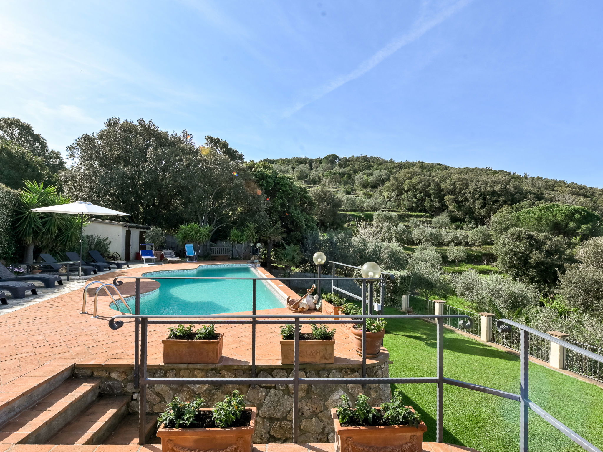 Beautiful, rustic villa "Ricali", surrounded by trees and fields. Property composed of main house and outbuilding 4 km from the centre of Porto Santo Stefano, 15 km from the centre of Orbetello, in a secluded position on a slope, 2.1 km from the sea. Private: property 12'000 m2 (fenced), well-kept terraced garden with lawn and wildlife garden, swimming pool (12 x 4 m, depth 140 - 220 cm, seasonal availability: 15.Apr. - 15.Oct.). Unconventional pool shape. Outdoor shower, arbour, terrace, garden furniture, barbecue house, pool maintenance by the owner/gardener. In the house: table tennis, table football. Narrow motor access. Parking on the premises. Shop 4 km, railway station "Orbetello" 17 km, ferry "Civitavecchia" 85 km, sandy beach "Giannella" 12 km pebble beach "Cala di Gesso" 2.1 km. Golf course (18 hole) 15 km, walking paths from the house 850 m. Nearby attractions: Giardino dei Tarocchi 35 km, Capalbio 37 km, Grosseto 52 km. Hiking paths: Mountain-Bike 2 km.