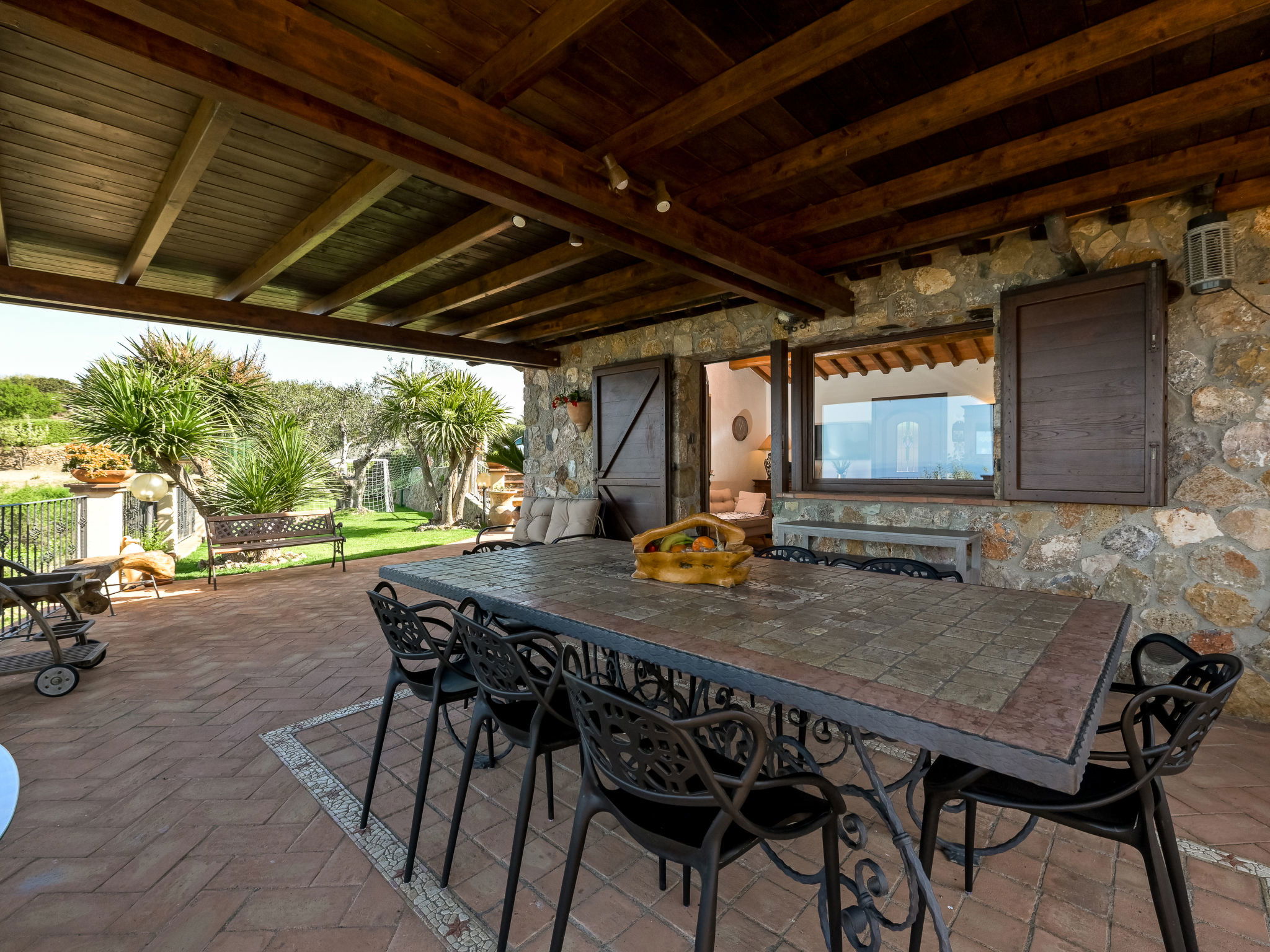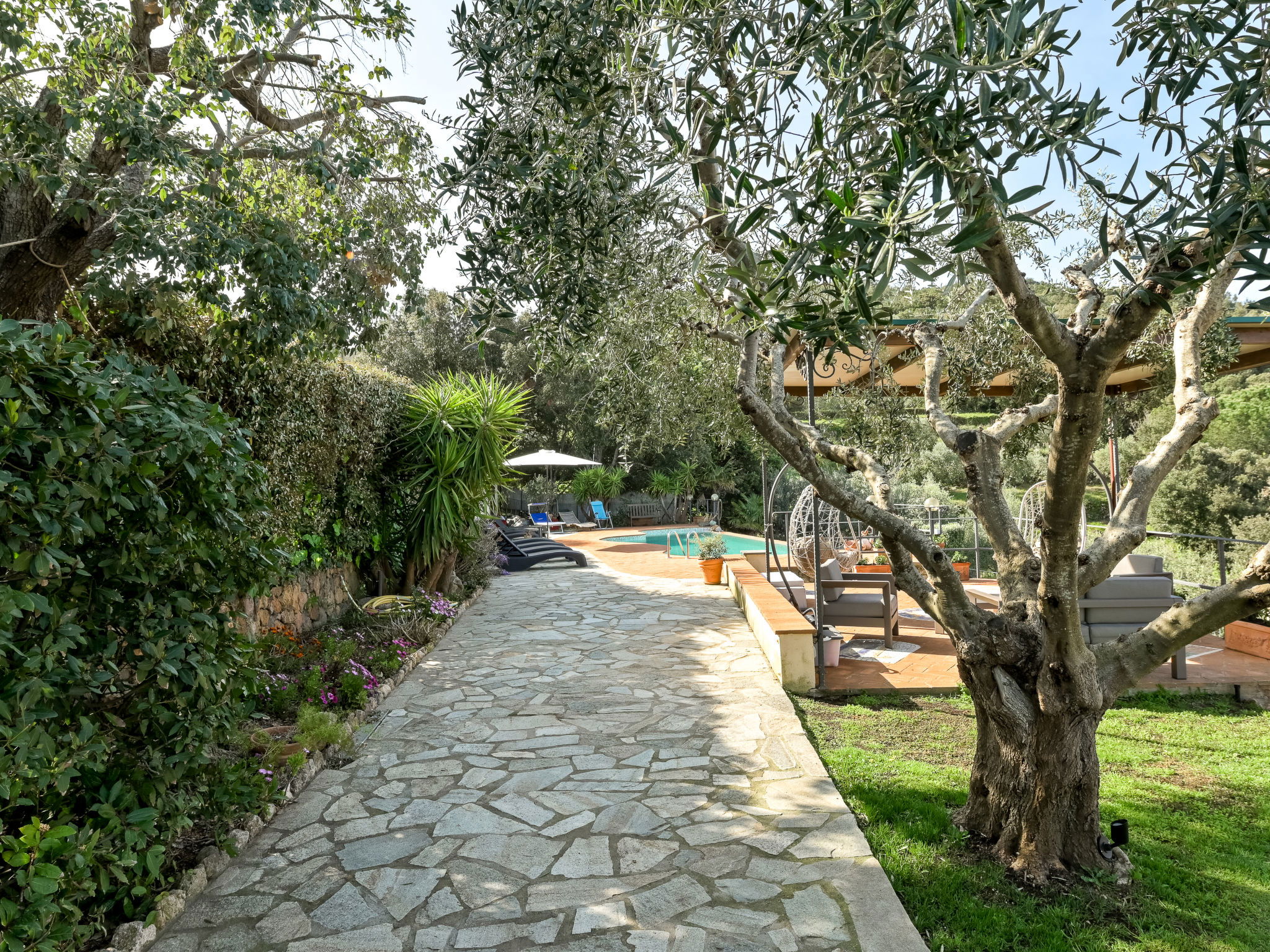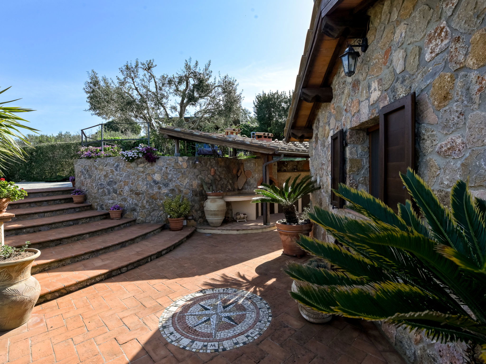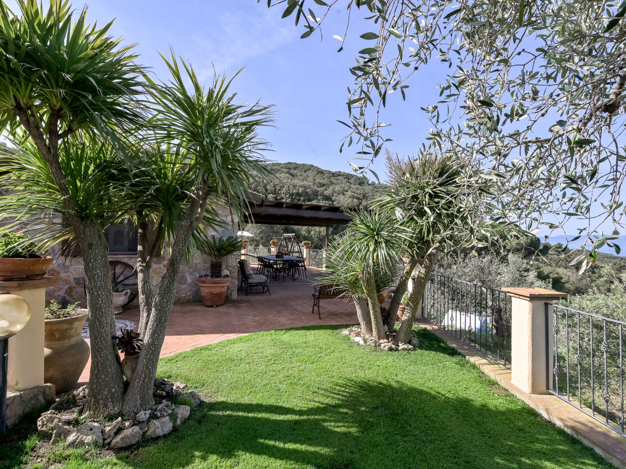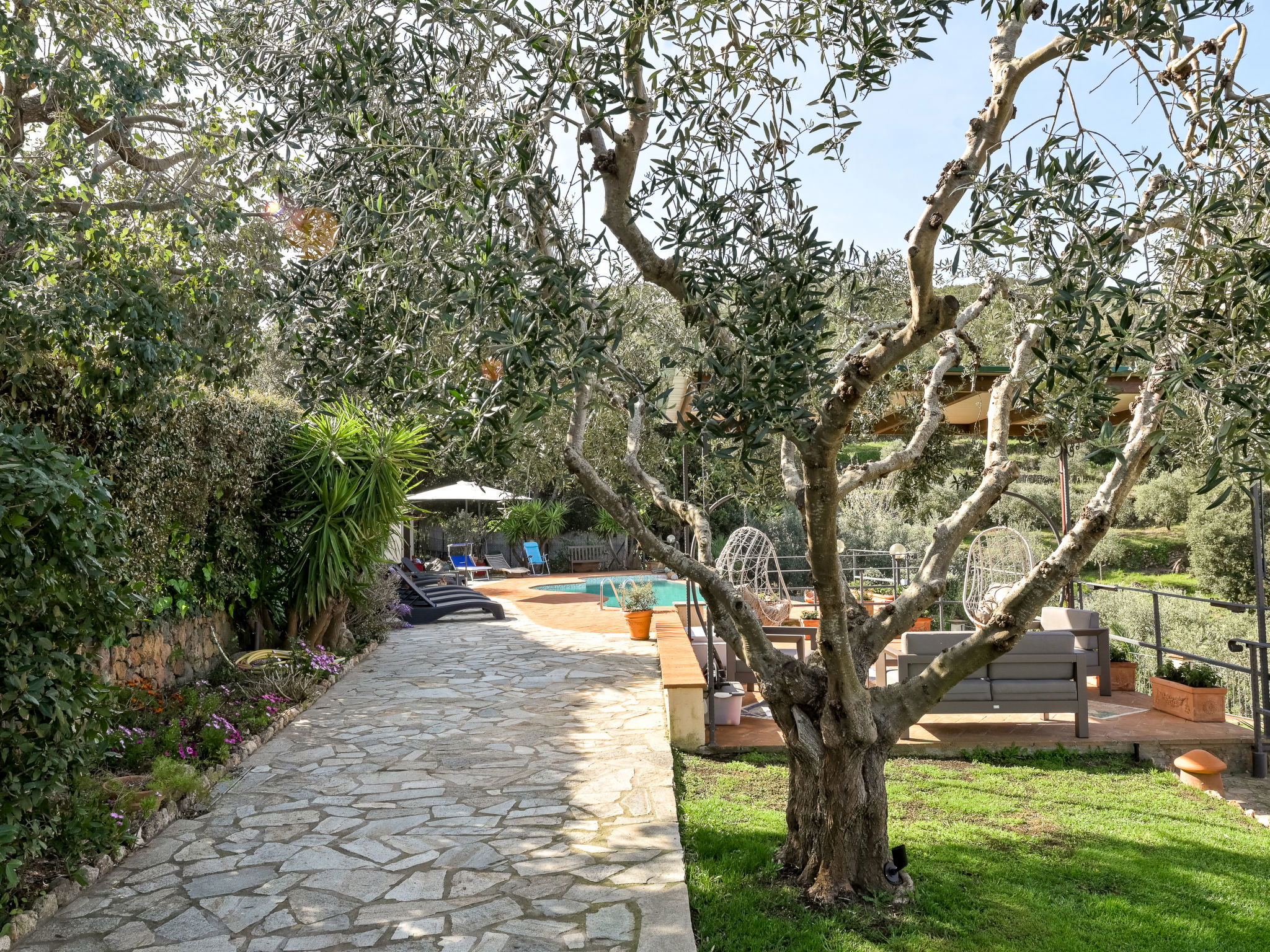 Beautiful, rustic villa "Ricali", surrounded by trees and fields. Property composed of main house and outbuilding 4 km from the centre of Porto Santo Stefano, 15 km from the centre of Orbetello, in a secluded position on a slope, 2.1 km from the sea. Private: property 12'000 m2 (fenced), well-kept terraced garden with lawn and wildlife garden, swimming pool (12 x 4 m, depth 140 - 220 cm, seasonal availability: 15.Apr. - 15.Oct.). Unconventional pool shape. Outdoor shower, arbour, terrace, garden furniture, barbecue house, pool maintenance by the owner/gardener. In the house: table tennis, table football. Narrow motor access. Parking on the premises. Shop 4 km, railway station "Orbetello" 17 km, ferry "Civitavecchia" 85 km, sandy beach "Giannella" 12 km pebble beach "Cala di Gesso" 2.1 km. Golf course (18 hole) 15 km, walking paths from the house 850 m. Nearby attractions: Giardino dei Tarocchi 35 km, Capalbio 37 km, Grosseto 52 km. Hiking paths: Mountain-Bike 2 km.