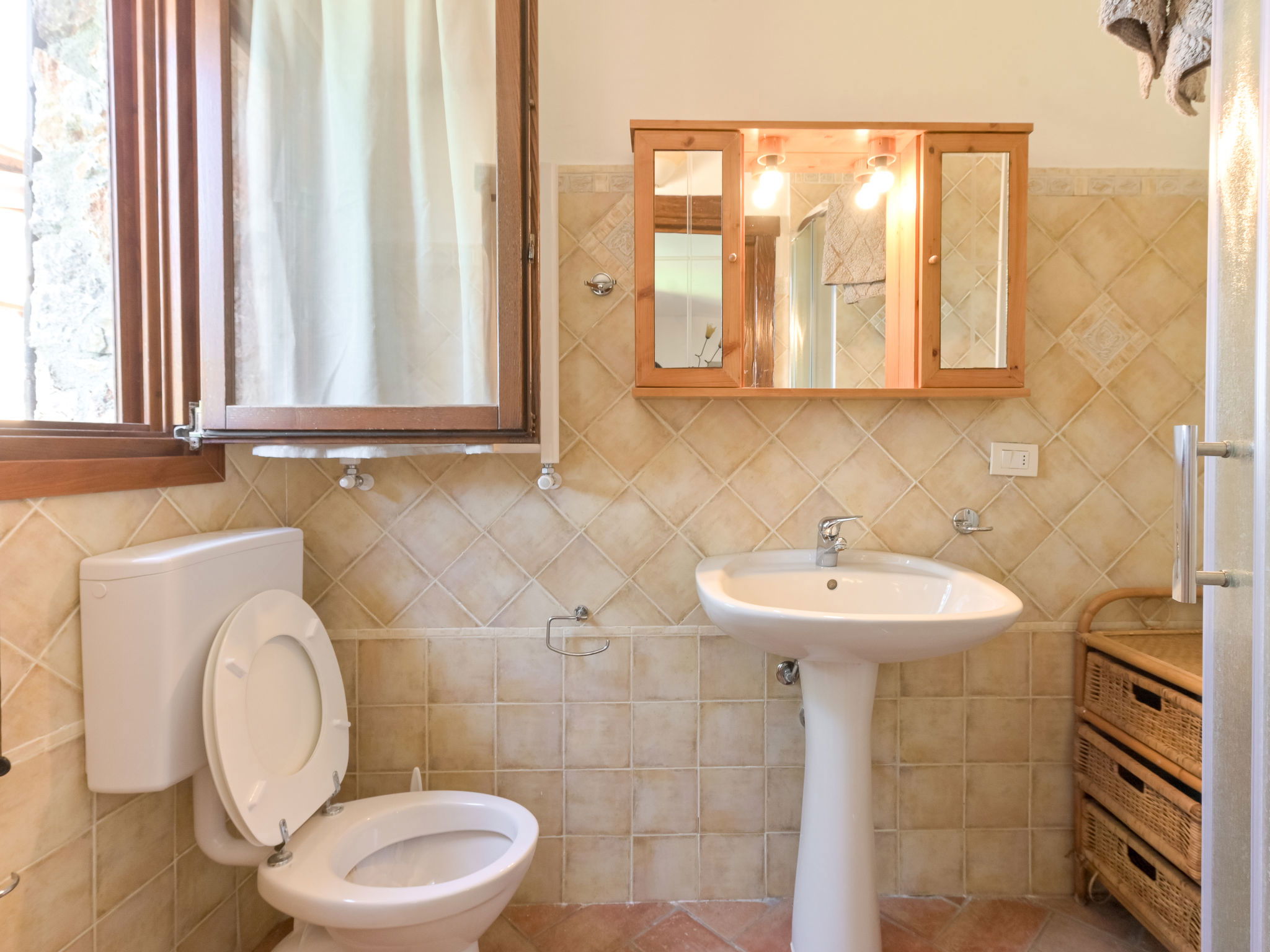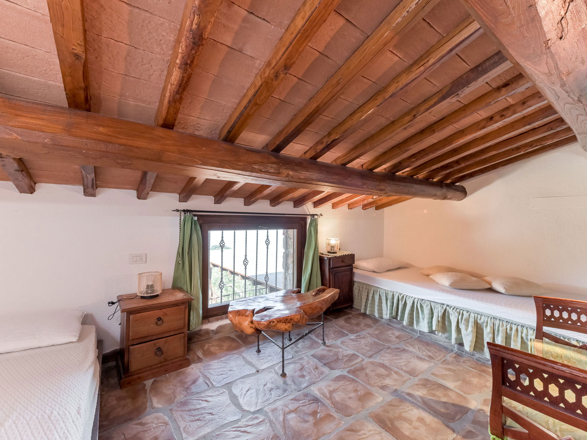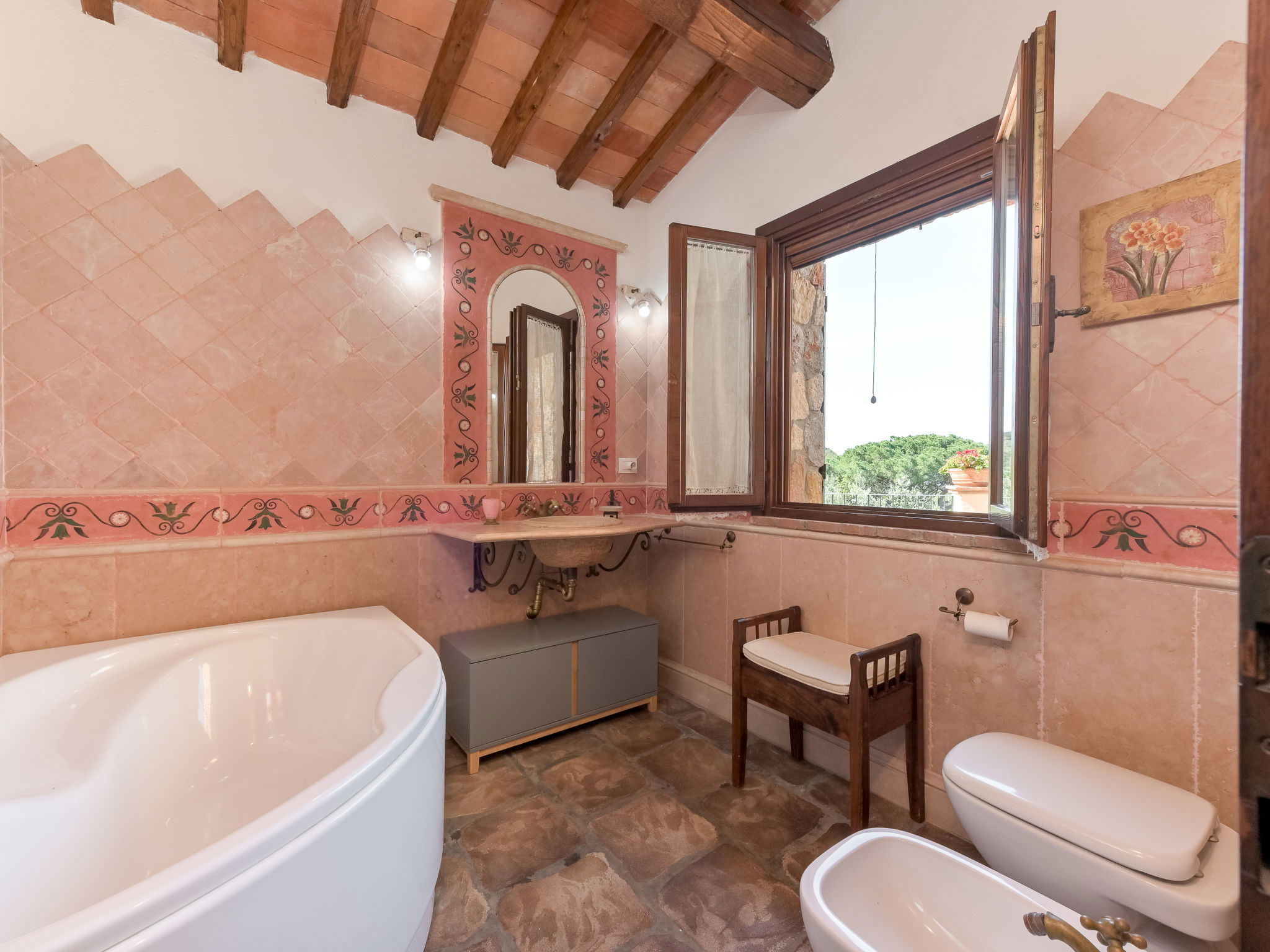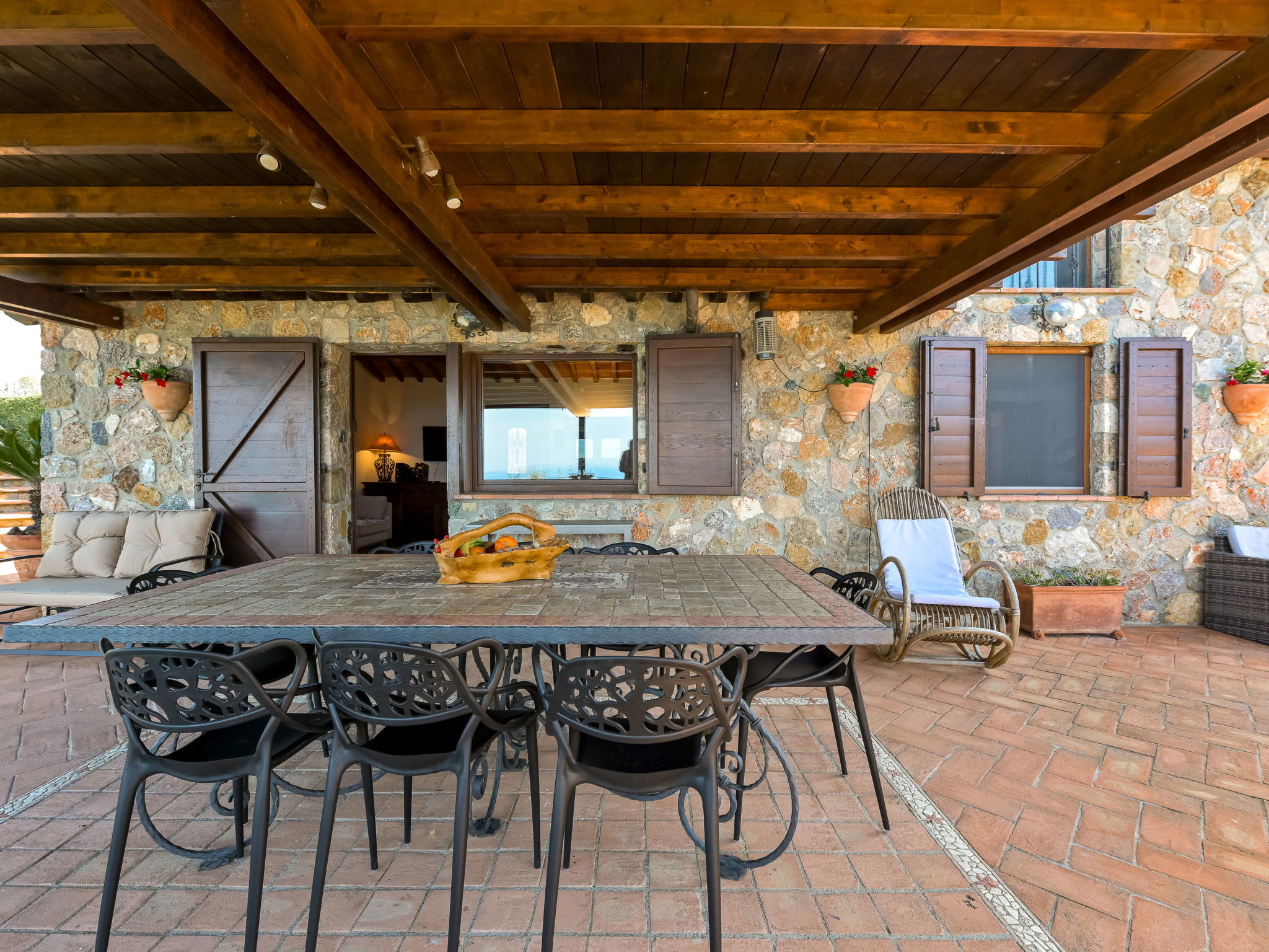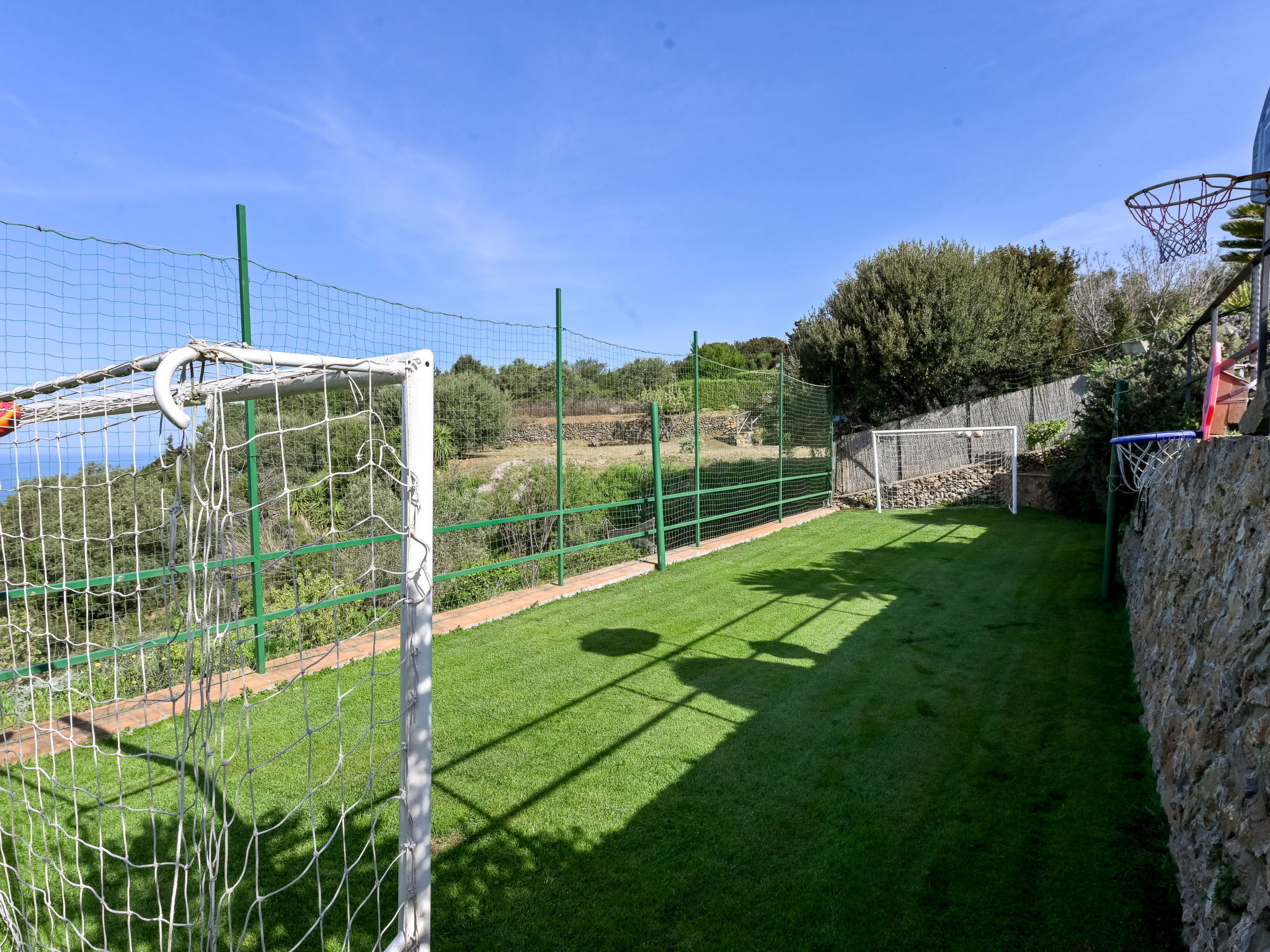 Beautiful, rustic villa "Ricali", surrounded by trees and fields. Property composed of main house and outbuilding 4 km from the centre of Porto Santo Stefano, 15 km from the centre of Orbetello, in a secluded position on a slope, 2.1 km from the sea. Private: property 12'000 m2 (fenced), well-kept terraced garden with lawn and wildlife garden, swimming pool (12 x 4 m, depth 140 - 220 cm, seasonal availability: 15.Apr. - 15.Oct.). Unconventional pool shape. Outdoor shower, arbour, terrace, garden furniture, barbecue house, pool maintenance by the owner/gardener. In the house: table tennis, table football. Narrow motor access. Parking on the premises. Shop 4 km, railway station "Orbetello" 17 km, ferry "Civitavecchia" 85 km, sandy beach "Giannella" 12 km pebble beach "Cala di Gesso" 2.1 km. Golf course (18 hole) 15 km, walking paths from the house 850 m. Nearby attractions: Giardino dei Tarocchi 35 km, Capalbio 37 km, Grosseto 52 km. Hiking paths: Mountain-Bike 2 km.