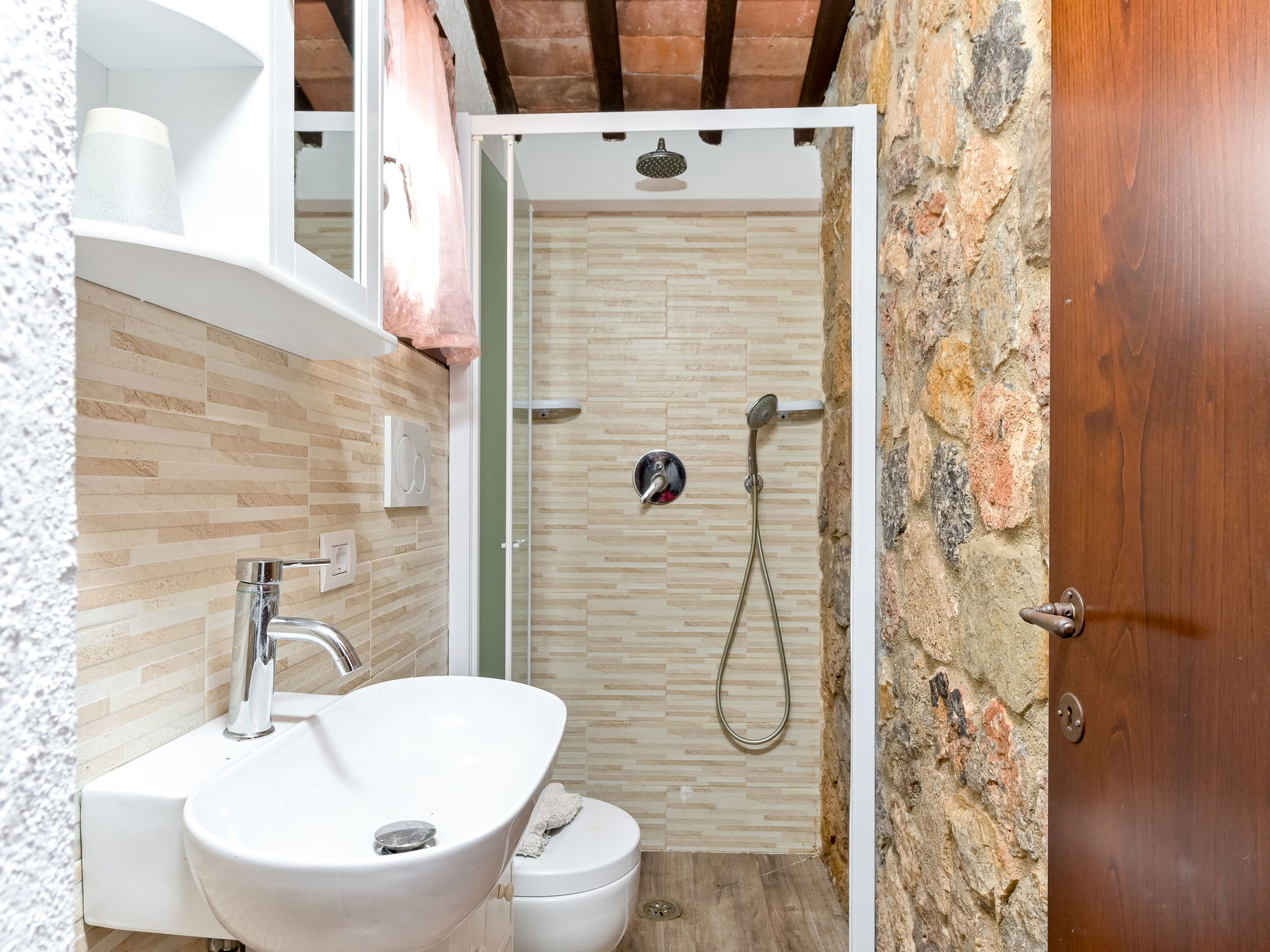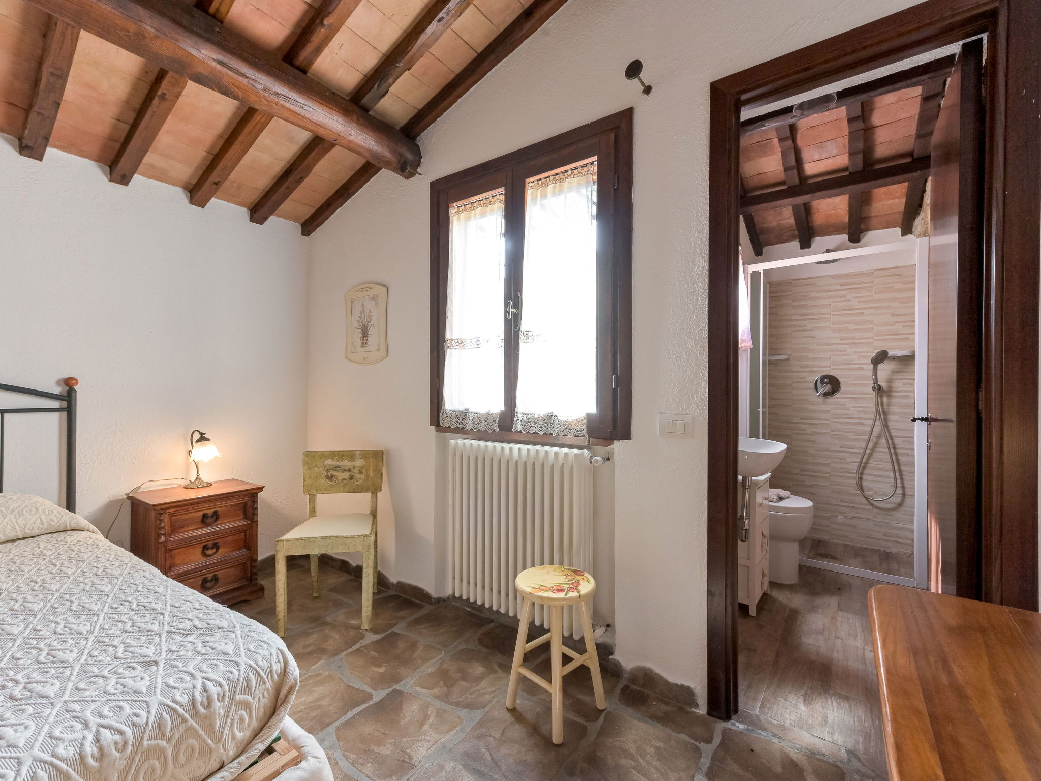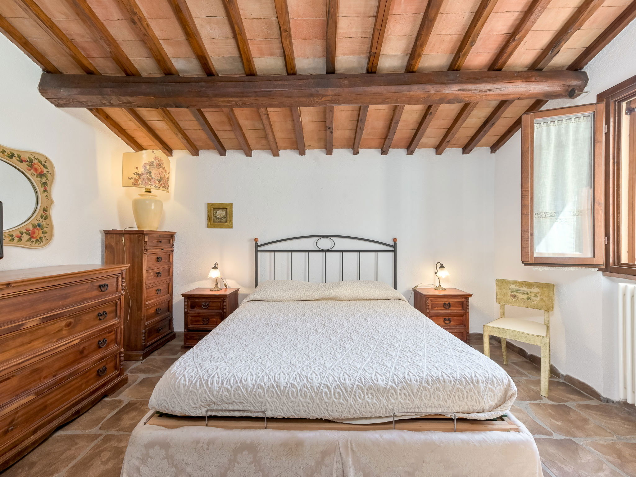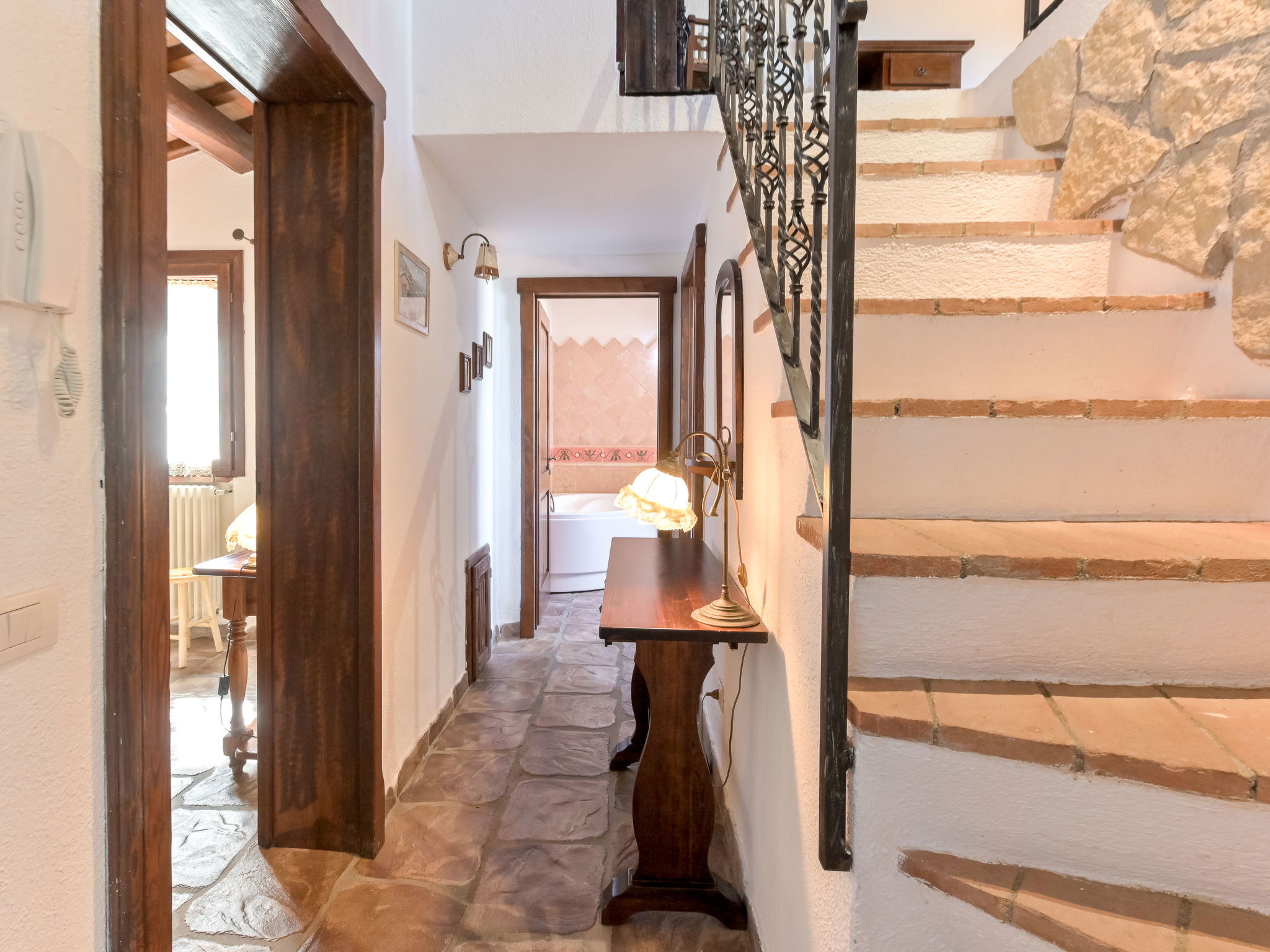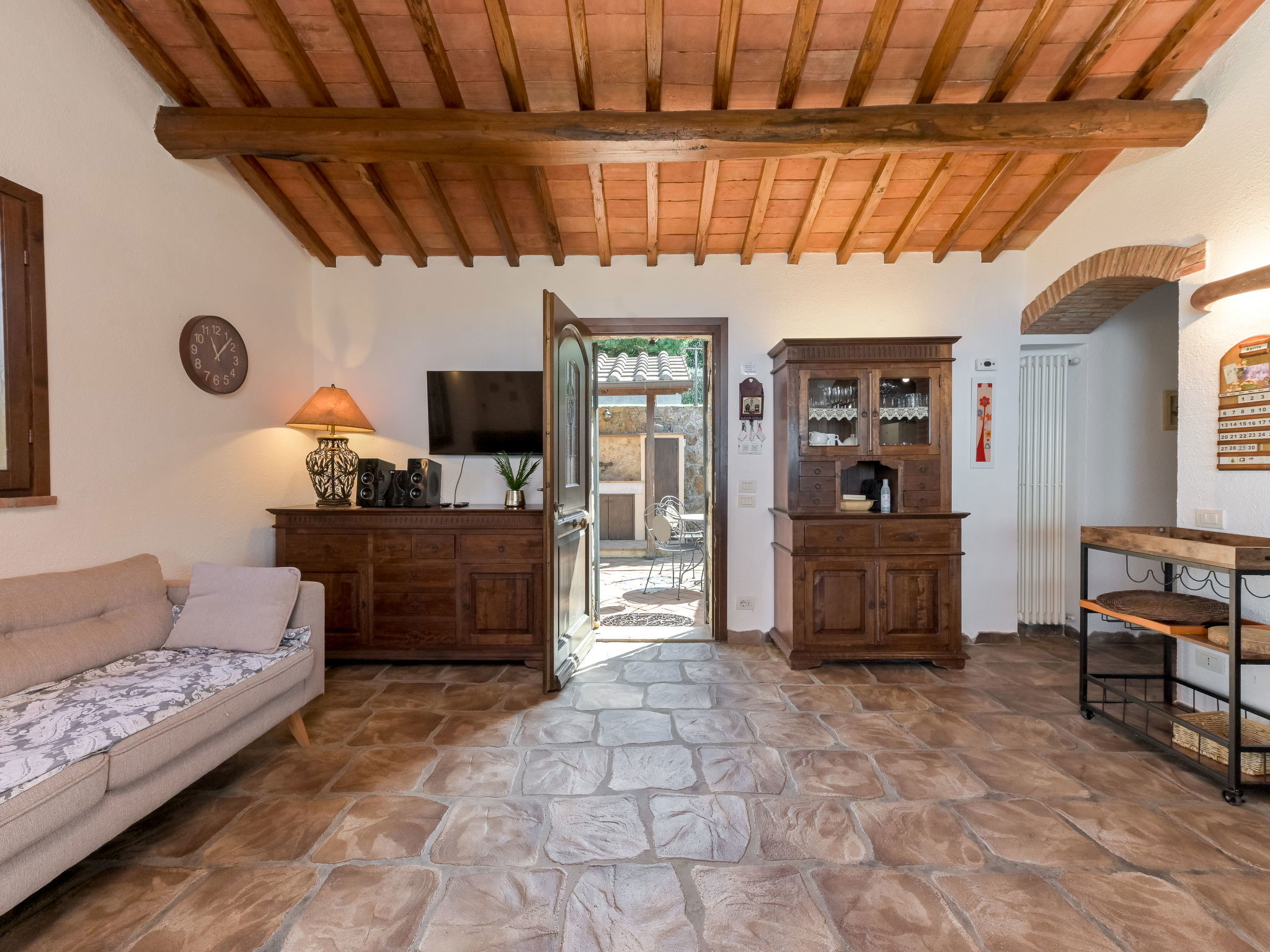 Beautiful, rustic villa "Ricali", surrounded by trees and fields. Property composed of main house and outbuilding 4 km from the centre of Porto Santo Stefano, 15 km from the centre of Orbetello, in a secluded position on a slope, 2.1 km from the sea. Private: property 12'000 m2 (fenced), well-kept terraced garden with lawn and wildlife garden, swimming pool (12 x 4 m, depth 140 - 220 cm, seasonal availability: 15.Apr. - 15.Oct.). Unconventional pool shape. Outdoor shower, arbour, terrace, garden furniture, barbecue house, pool maintenance by the owner/gardener. In the house: table tennis, table football. Narrow motor access. Parking on the premises. Shop 4 km, railway station "Orbetello" 17 km, ferry "Civitavecchia" 85 km, sandy beach "Giannella" 12 km pebble beach "Cala di Gesso" 2.1 km. Golf course (18 hole) 15 km, walking paths from the house 850 m. Nearby attractions: Giardino dei Tarocchi 35 km, Capalbio 37 km, Grosseto 52 km. Hiking paths: Mountain-Bike 2 km.