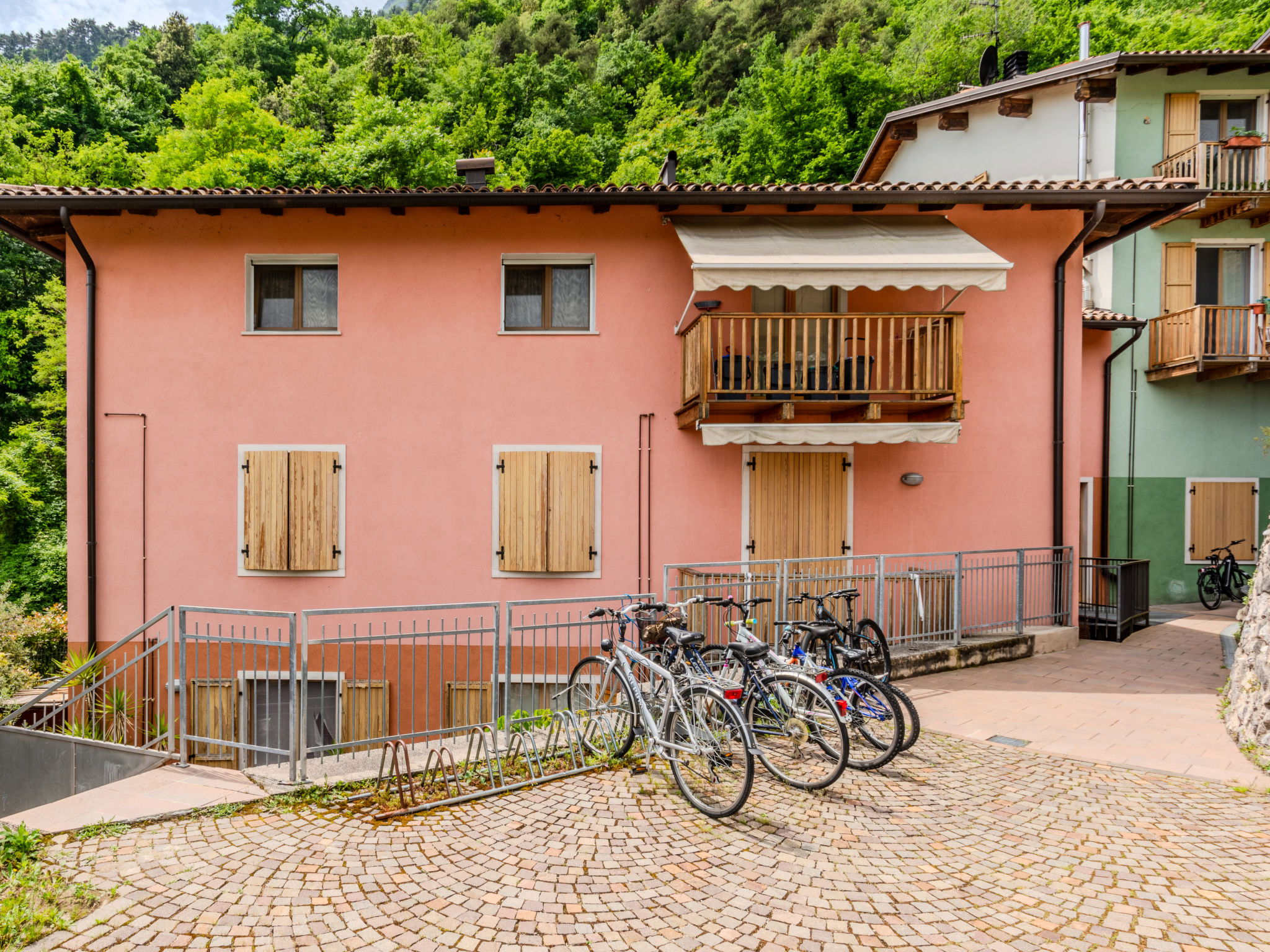 Riva del Garda: Very modern, comfortable semi-detached house "Condominio Aqua", surrounded by trees. In the district of San Giacomo 1 km from the centre of di Riva del Garda, on top of a hill, excellent location: right in the centre but still quiet, 2 km from the lake, 2 km from the beach, 20 m from the stream. In the house: storage room for bicycles, storage room for skis, central heating system. Linen change weekly (suppl. charge extra). Towel change weekly (suppl. charge extra). Room cleaning weekly on request (extra). Parking at the house, public parking 300 m. Grocery, supermarket 500 m, shopping centre 2 km, restaurant, bar 500 m, bakery 200 m, café 500 m, pedestrian zone 1 km, bicycle rental 1 km, 5 minute walk to the centre, bus stop 500 m, railway station "Rovereto" 17 km, ferry "Riva del Garda" 2 km, pebble beach "Sabbioni di Riva del Garda" 2 km, thermal baths "Garda Therme" 5 km, lake di Garda 2 km. Golf course (18 hole) 3 km, surf school 4 km, sailing school 2 km, tennis 2 km, indoor tennis centre 2 km, minigolf 4 km, walking paths from the house 50 m, cycle lane 1 km. Nearby attractions: Castello di Arco 4 km, Garda Therme 4 km, Climbing Stadium Arco 5 km, Gardaland 90 km, Strada della Forra 12 km, Stazione dei Bus Riva del Garda 2 km. Well-known ski regions can easily be reached: Madonna di Campiglio 68 km. Well-known lakes can easily be reached: Lago di Garda 2 km, Lago di Ledro 14 km, Lago di Tenno 14 km. Hiking paths: Cycle Lane Riva del Garda - Sarche 500 m, Ferrata Cima SAT 500 m, Ferrata Colodri 4 km. Neighbourhood highly sensitive to noise. Quietness and good behaviour expected.