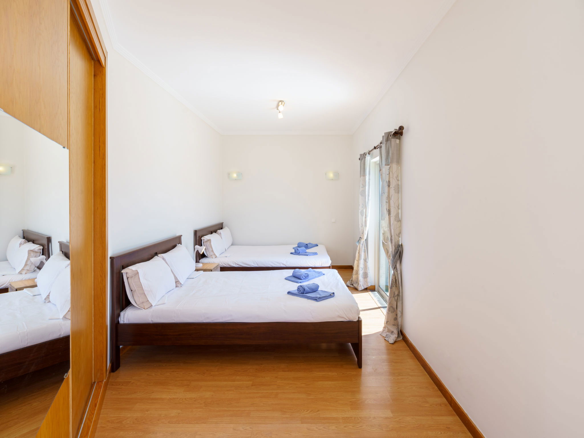 "Baia da Fuseta", 5-room terraced house 206 m2 on 2 levels. Object suitable for 8 adults. Spacious, very comfortable and cosy furnishings: lounge with open-hearth fireplace, dining table, TV, international TV channels, flat screen, air conditioning and forced-air heating. Exit to the terrace. 1 room with 1 french bed (160 cm, length 200 cm), hip bath/WC, air conditioning and forced-air heating. 1 room with 1 french bed (160 cm, length 200 cm), air conditioning and forced-air heating. Kitchen (4 hot plates, oven, dishwasher, toaster, microwave, freezer, electric coffee machine) with dining table. Shower/WC. Upper floor: 1 room with 1 french bed (160 cm, length 200 cm), air conditioning and forced-air heating. 1 room with 2 beds (90 cm, length 180 cm), air conditioning and forced-air heating. Hip bath/WC. Terrace furniture, deck chairs. View of the swimming pool. Facilities: washing machine, children's high chair, baby cot for up to 2 year olds. Parking at the house. Please note: suitable for families. Maximum 1 small pet/ dog allowed. Fire extinguisher. 125771/AL