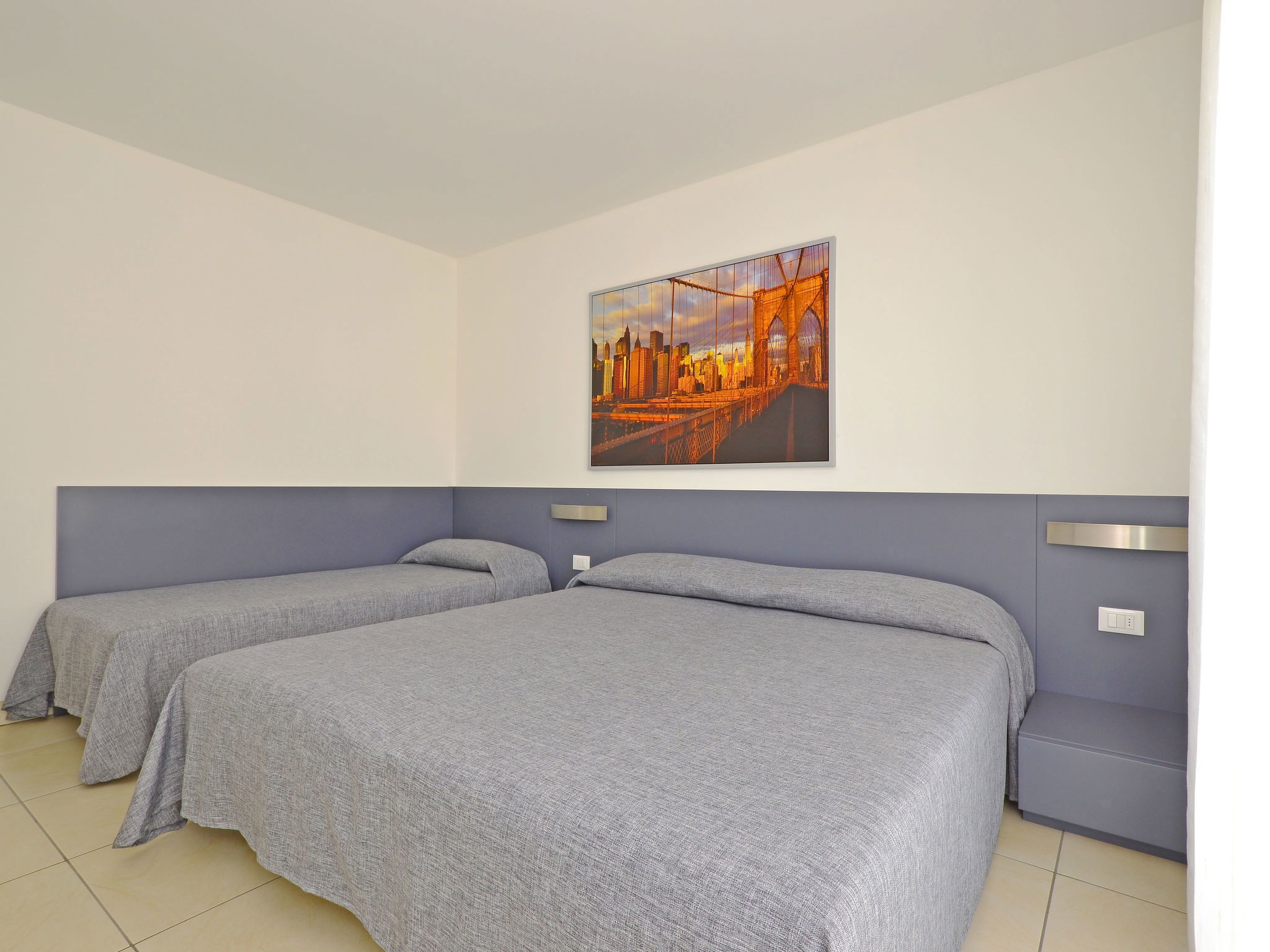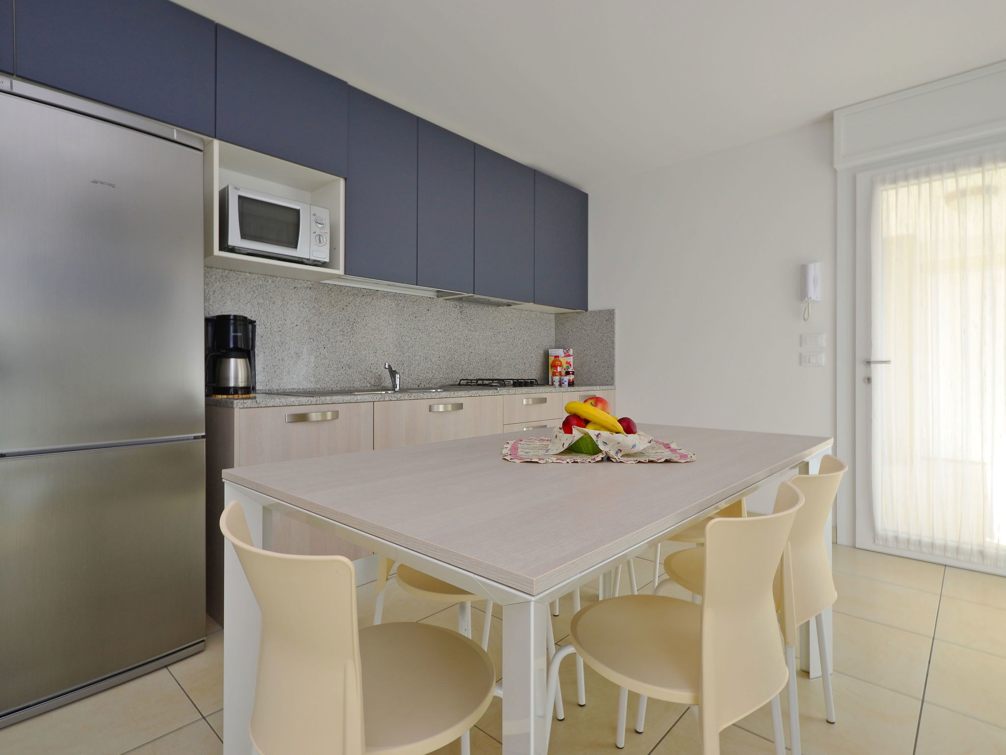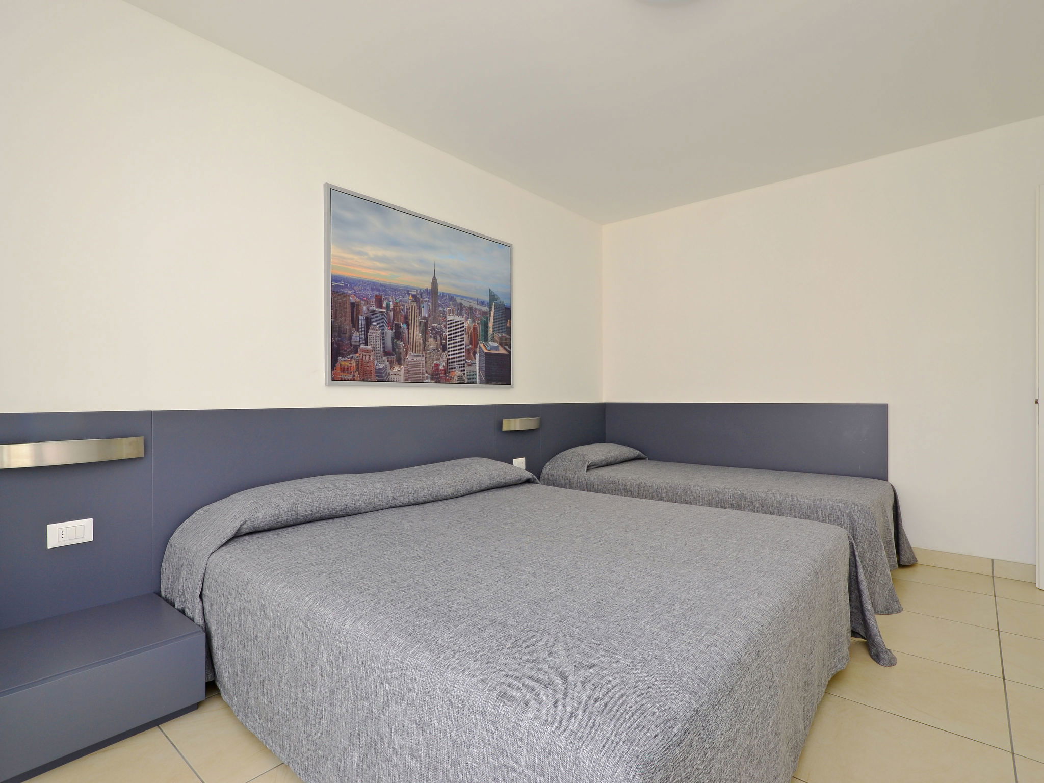 3-room apartment 75 m2, on the upper floor. Bright, practical and modern furnishings: living/sleeping room with 1 double sofabed, dining table and satellite TV. Exit to the balcony. 2 rooms, each room with 1 bed and 1 double bed. Open kitchen (dishwasher, 4 gas rings, kettle, microwave, freezer, electric coffee machine). Shower/bidet/WC, double hand-basin. Heating, air-conditioning, forced-air heating. Balcony. Balcony furniture. Facilities: washing machine, safe, baby cot for up to 2 year olds (extra), hair dryer. Internet (WiFi, free). Parking (1 car) at 100 m. Please note: non-smokers only. 1 small pet/ dog allowed. Plus electric coffee machine for espresso ("Lavazza A Modo Mio"). Bedlinen, final cleaning and all energy costs are included. No mandatory extra charges to be paid on-site except for local tax. IT030049B4EO4QXUU8
