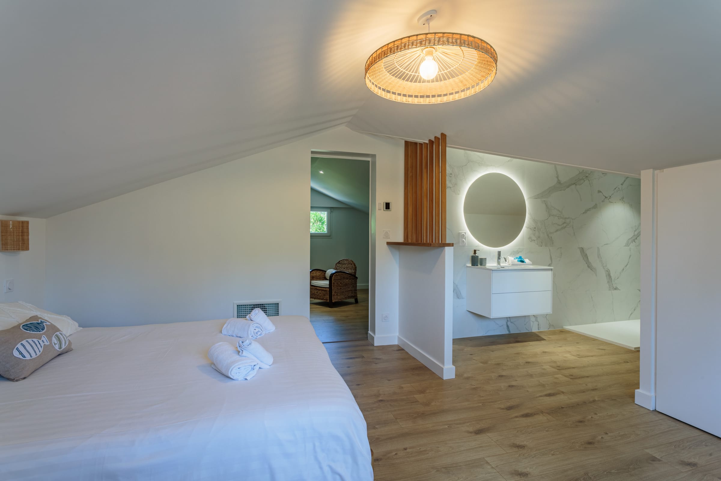 - one bedroom with a queen-size bed (160 cm) and access to the terrace,