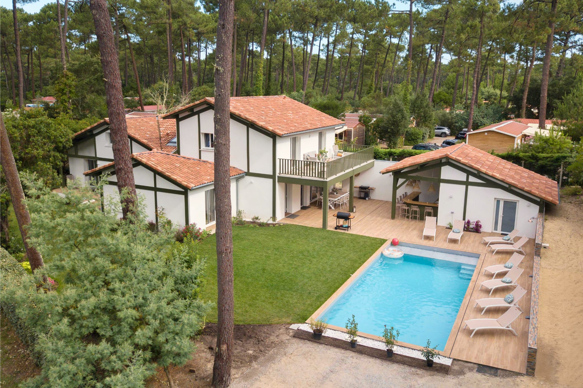 This incredible villa is perfectly situated at the end of the Lac, just 3.5 km from the lively town center of Hossegor and 6 km from the bustling Seignosse Bourg. The neighborhood is quiet, tucked away from the hustle and bustle of traffic, and benefits from proximity to the beaches and golf courses of Seignosse and Hossegor, as well as the sparkling Lac d'Hossegor.