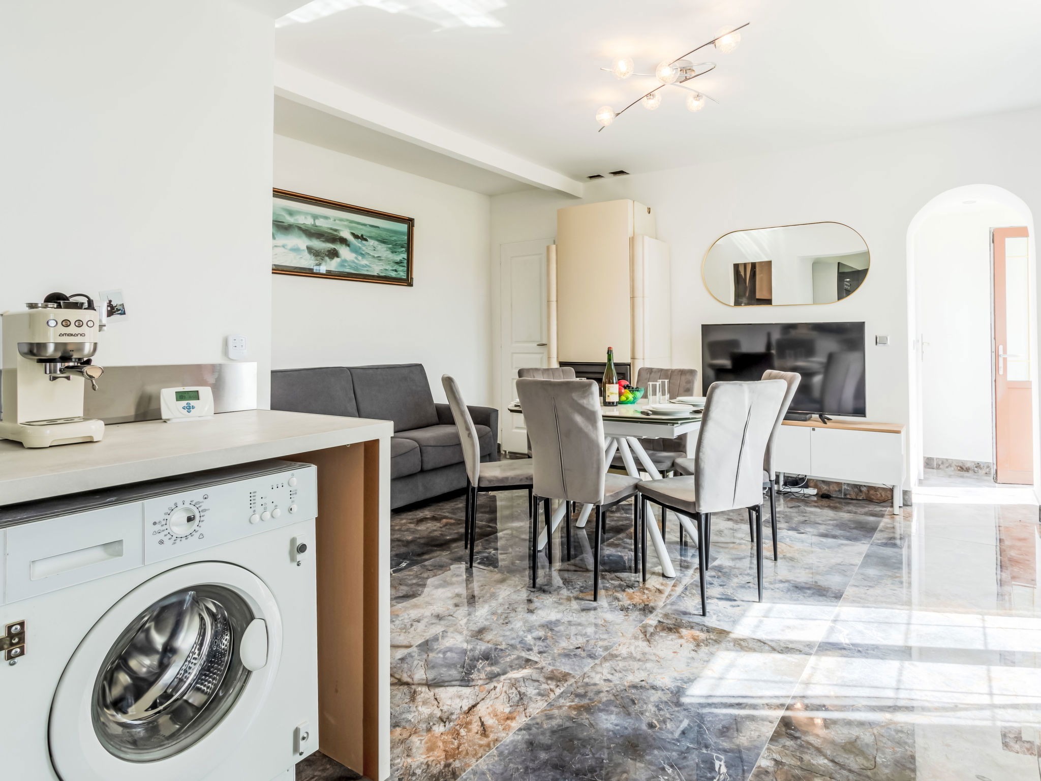 "Marine", 3-room terraced house 67 m2. Living/dining room with 1 double sofabed (140 cm, length 190 cm), separate WC and TV (flat screen). Exit to the garden, south facing position and west facing position. Open kitchen (oven, dishwasher, 4 induction hot plates, toaster, kettle, microwave, freezer, electric coffee machine). Shower, shower/WC. Electric heating. Upper floor: 1 room with 1 french bed (140 cm, length 190 cm), TV (flat screen). 1 room with 1 x 1 bunk beds (90 cm, length 190 cm), 1 sleeping facility (140 cm, length 190 cm), TV (flat screen). Garden 30 m2, south facing position and west facing position. Terrace furniture, barbecue. Facilities: washing machine, iron, hair dryer. Internet (WiFi, free). Please note: smoke alarm. Offer by a private individual according to Art. 155, IV of CGI.