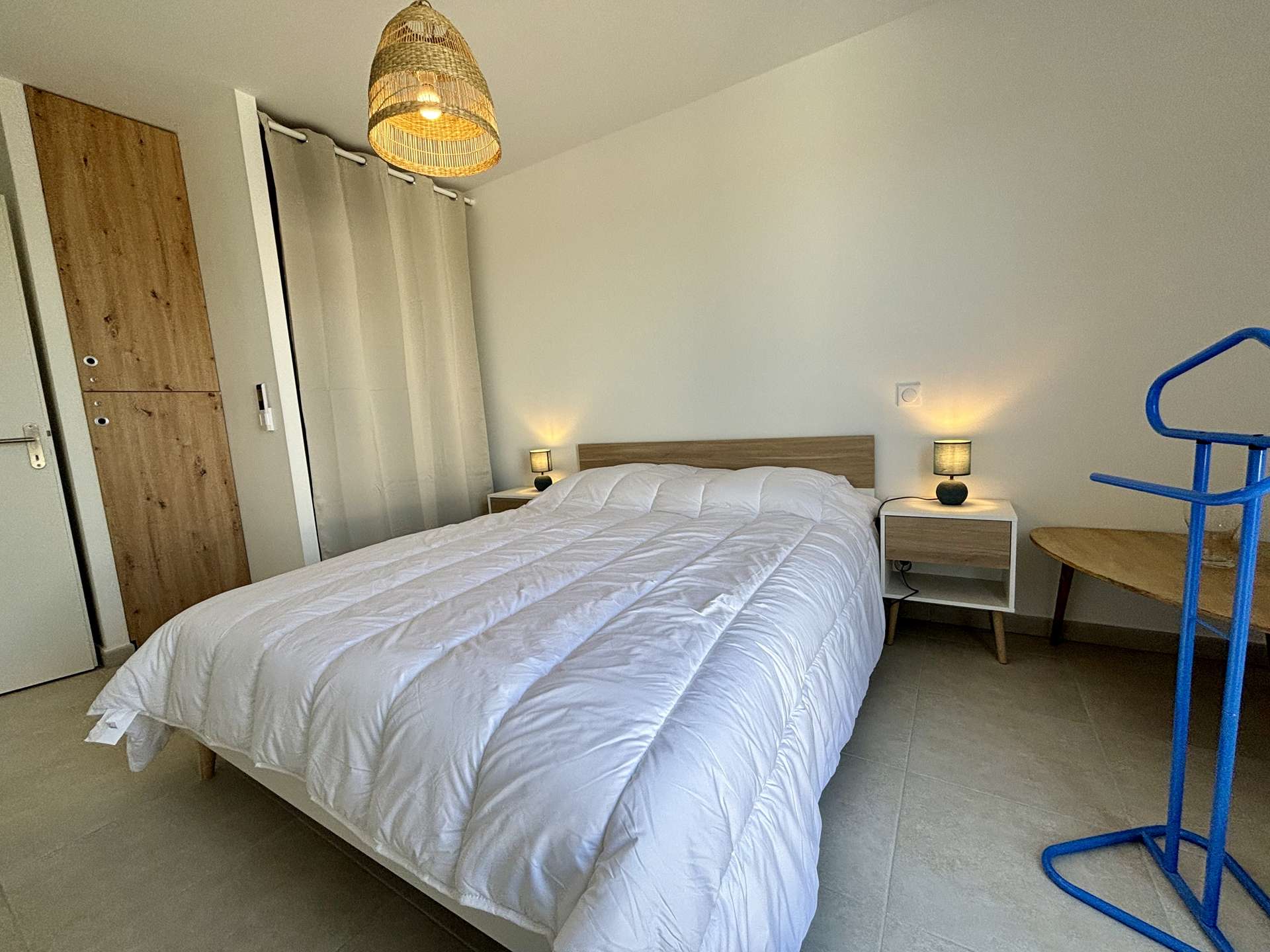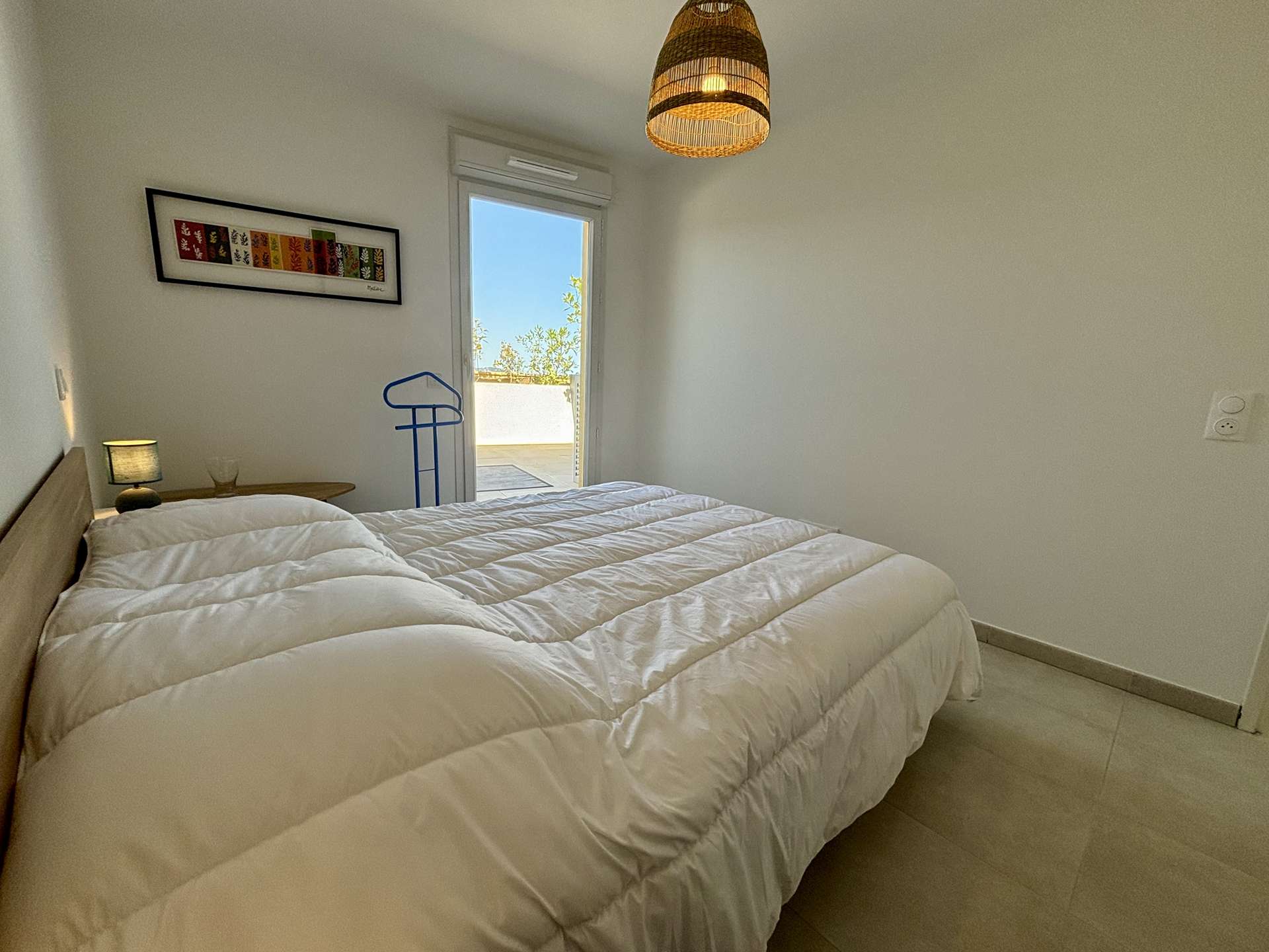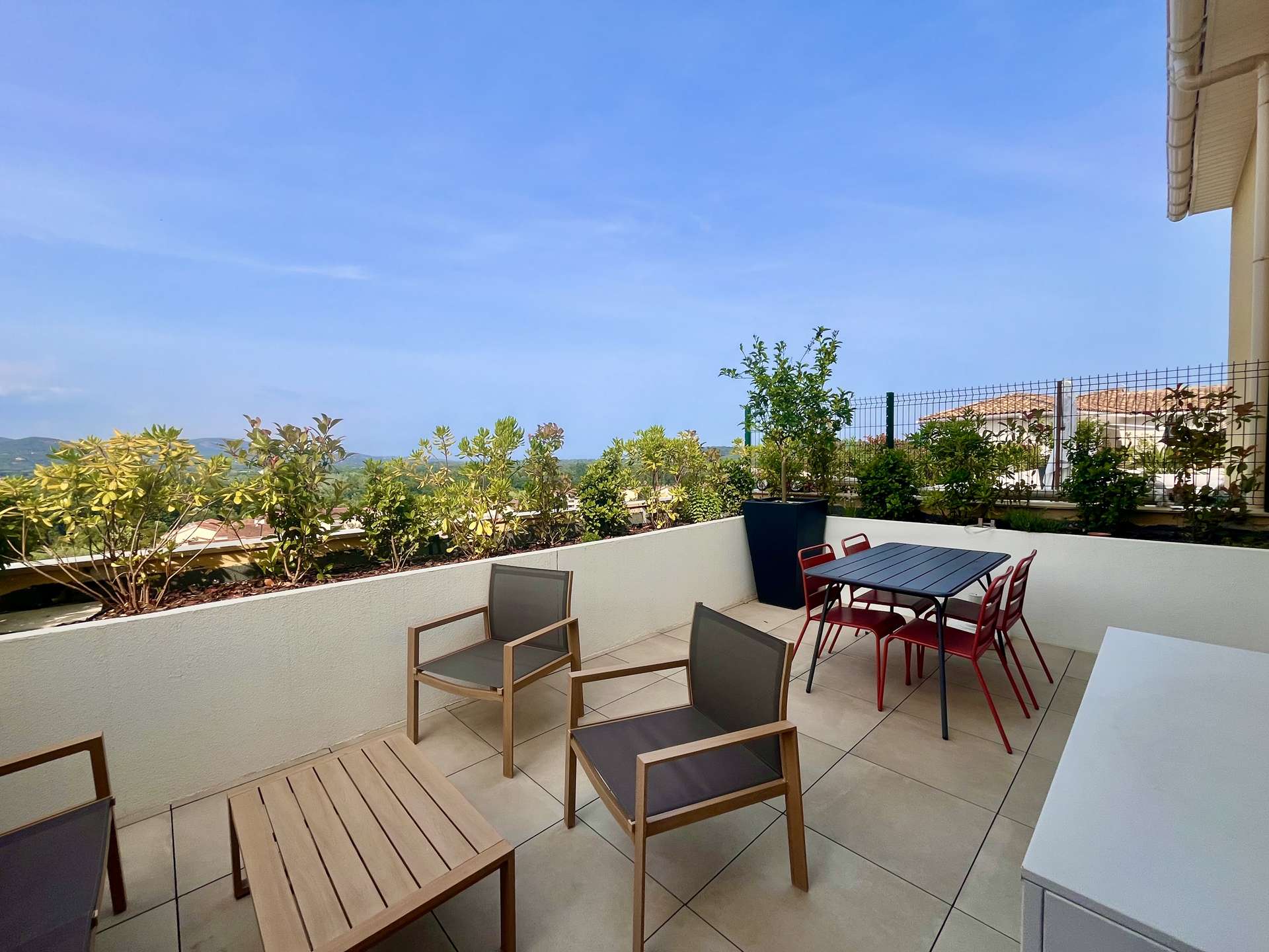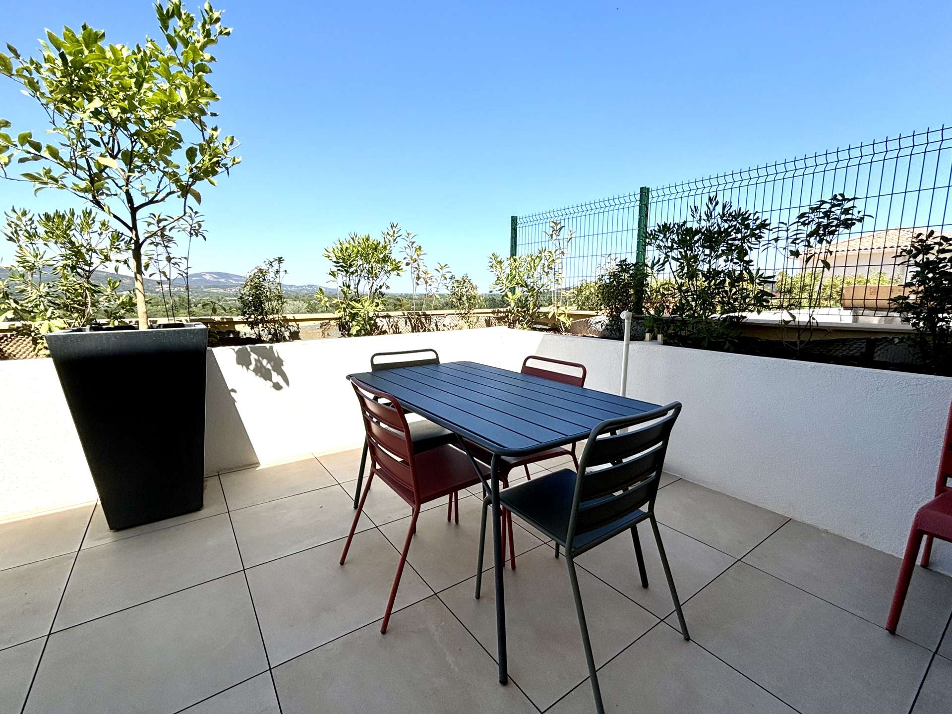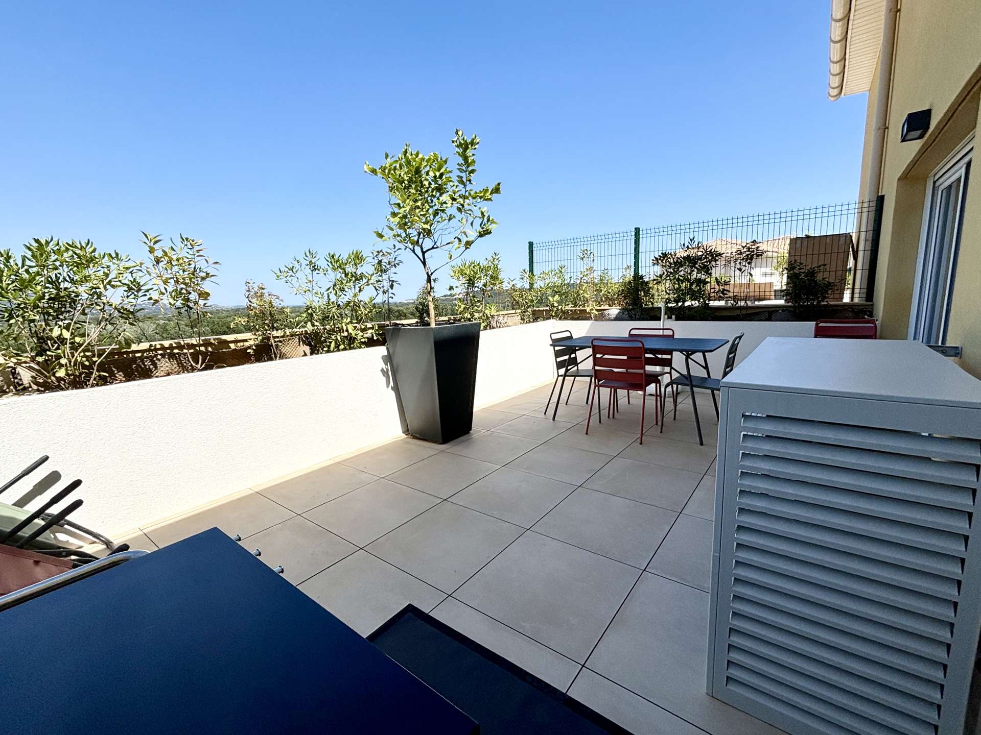 Air-conditioned apartment located in a new residence in Cogolin with a view of Grimaud. The residence is quiet with a superb panorama of the hills.