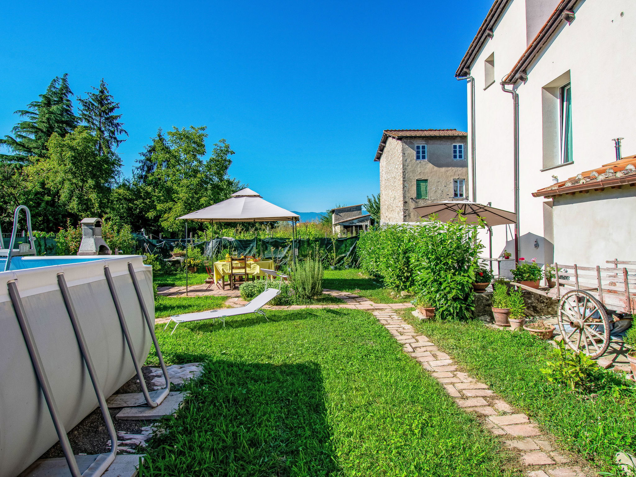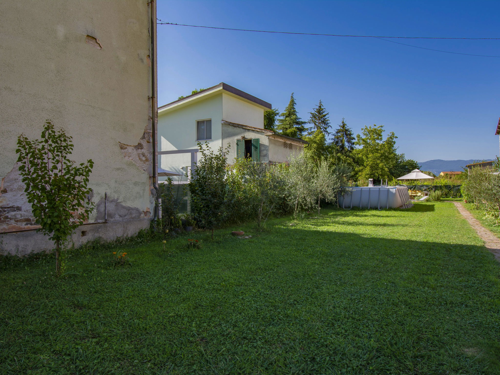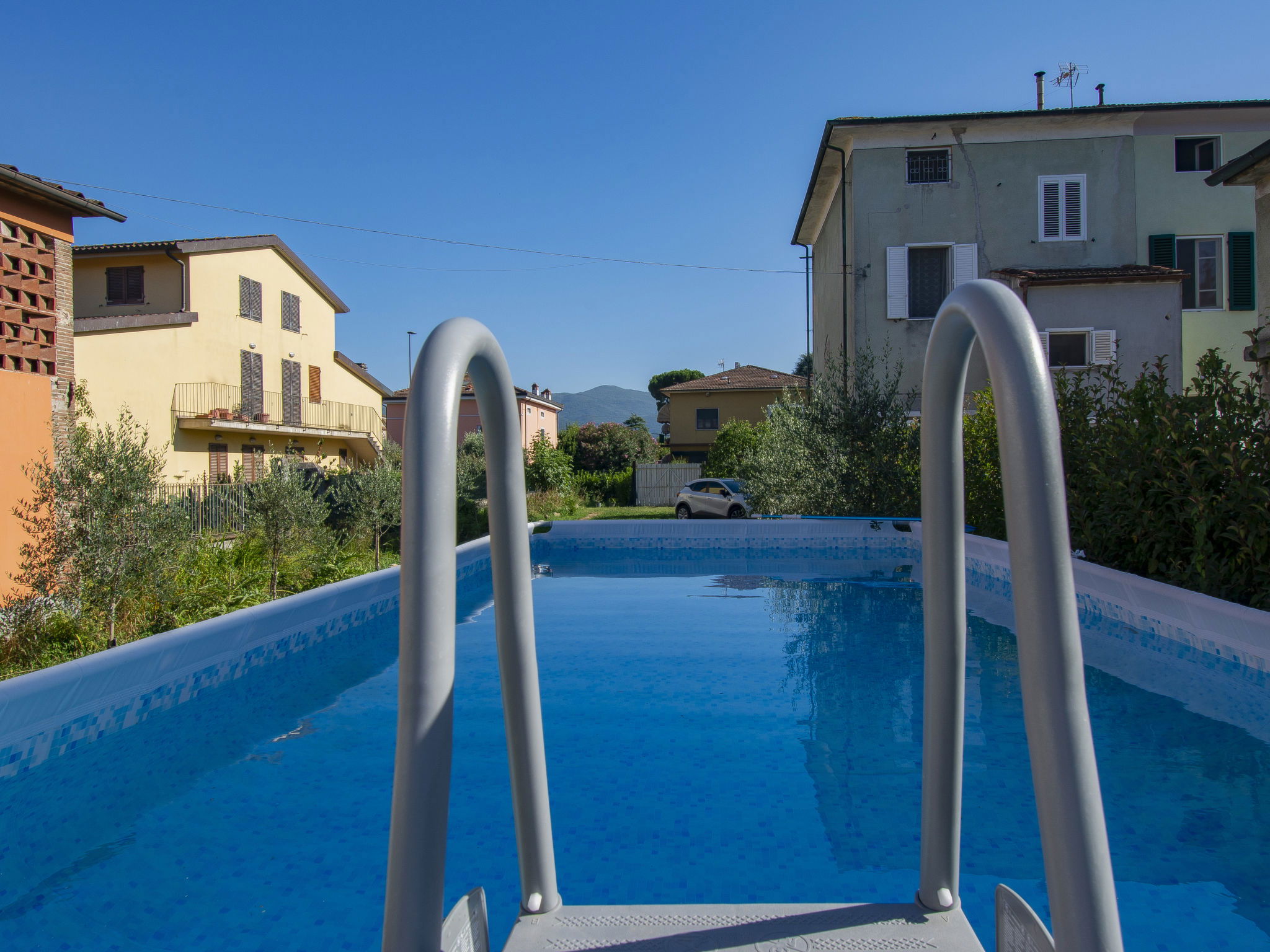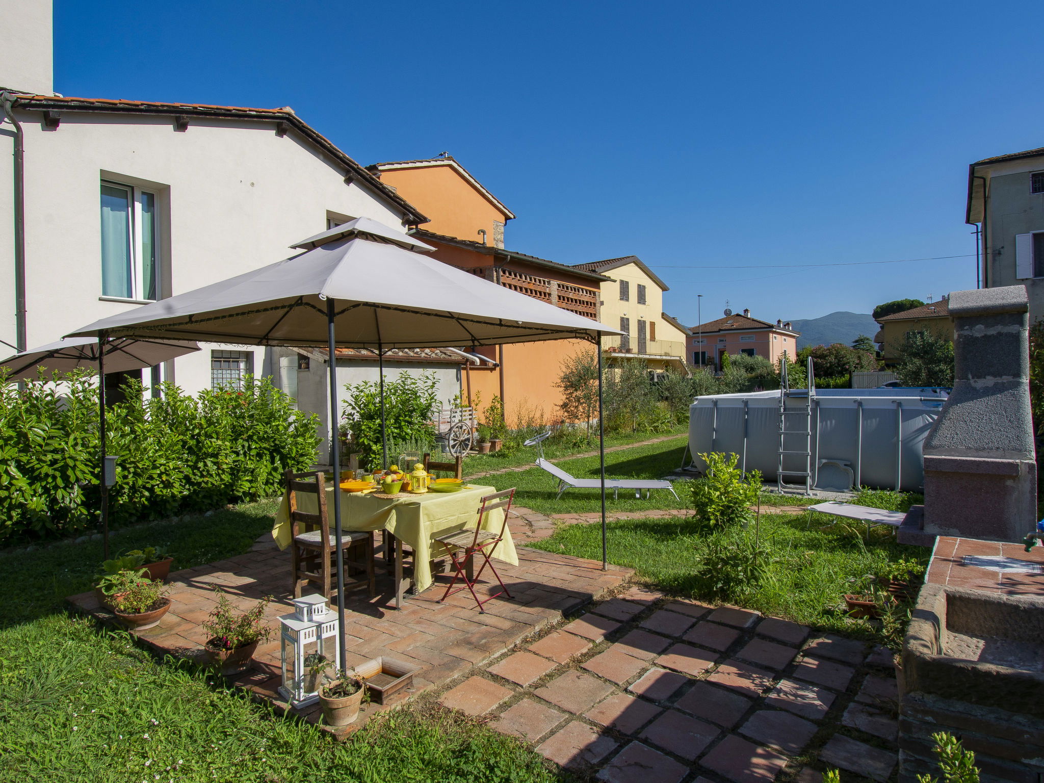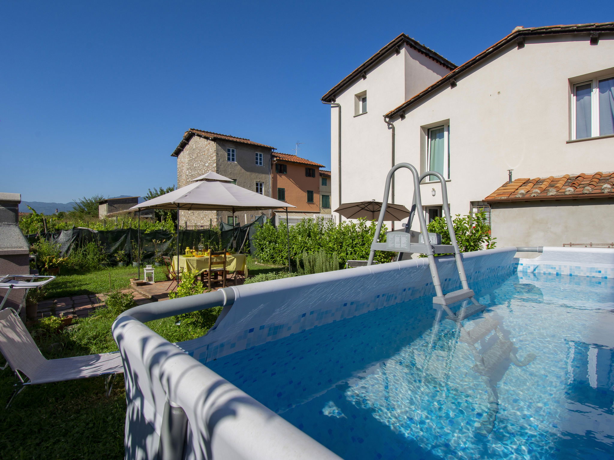 Modern, cosy house detached. In the resort 1.5 km from the centre of Lucca, excellent location: right in the centre but still quiet. Private: large garden 600 m2 (fenced) wildlife garden and flowers, swimming pool (above ground) fenced (7 x 3 m, seasonal availability: 15.May. - 15.Oct.) with internal staircase. Arbour, garden furniture, barbecue. In the house: WiFi, air conditioning, heating available only from 15.Nov. - 15.Apr.. Parking (for 3 cars). Supermarket 50 m, restaurant 100 m, bus stop 150 m, sandy beach "Viareggio" 25 km. Nearby attractions: Lucca 1 km, Pisa 25 km, Firenze 50 km. Please note: baby equipment (included). Owner lives in separate semi-detached house.