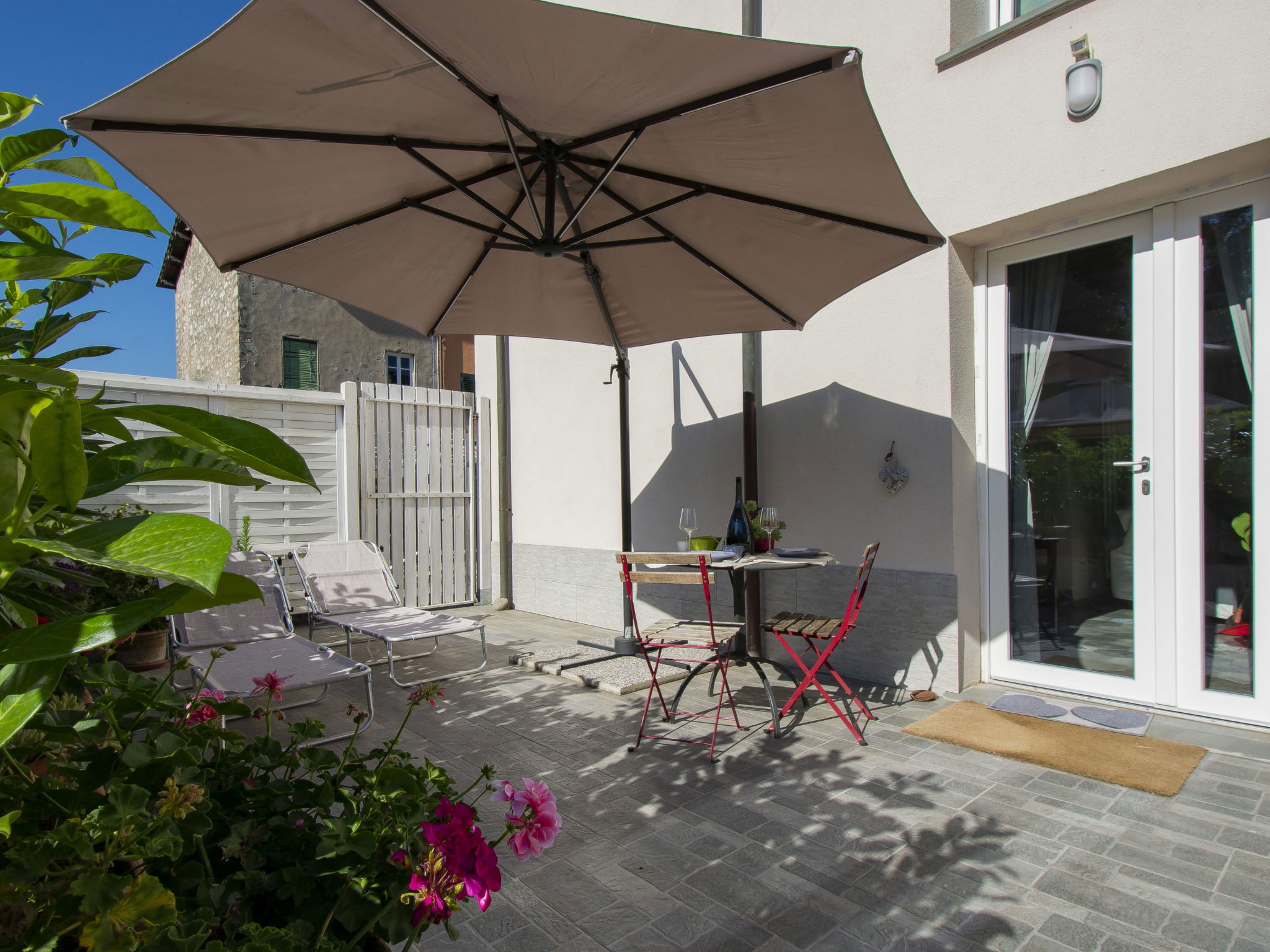 "Pinot", 2-room apartment 50 m2, on the ground floor. Modern and tasteful furnishings: living/dining room with 1 double sofabed and digital TV. Exit to the garden. 1 double bedroom. Kitchen (oven, dishwasher, 5 gas rings, toaster, kettle, microwave, electric coffee machine). Shower/bidet/WC. Gas heating. Porch. Terrace furniture, barbecue, deck chairs. Facilities: washing machine, iron, children's high chair, hair dryer. Internet (WiFi, free). Maximum 1 pet/ dog allowed. IT046017C23SPXJ5BU