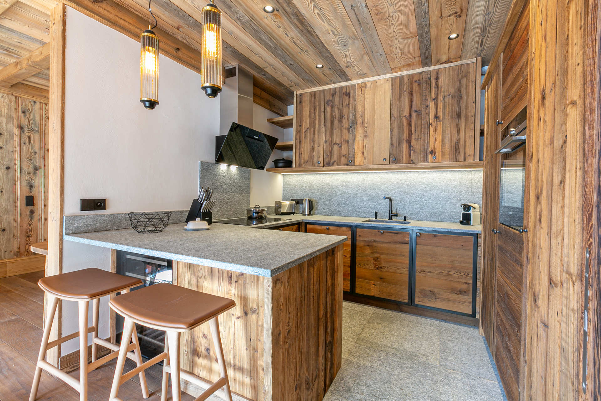 Fully equipped kitchen with dishwasher, microwave/oven, wine cooler, fridge, freezer, ceramic hob, electric hood