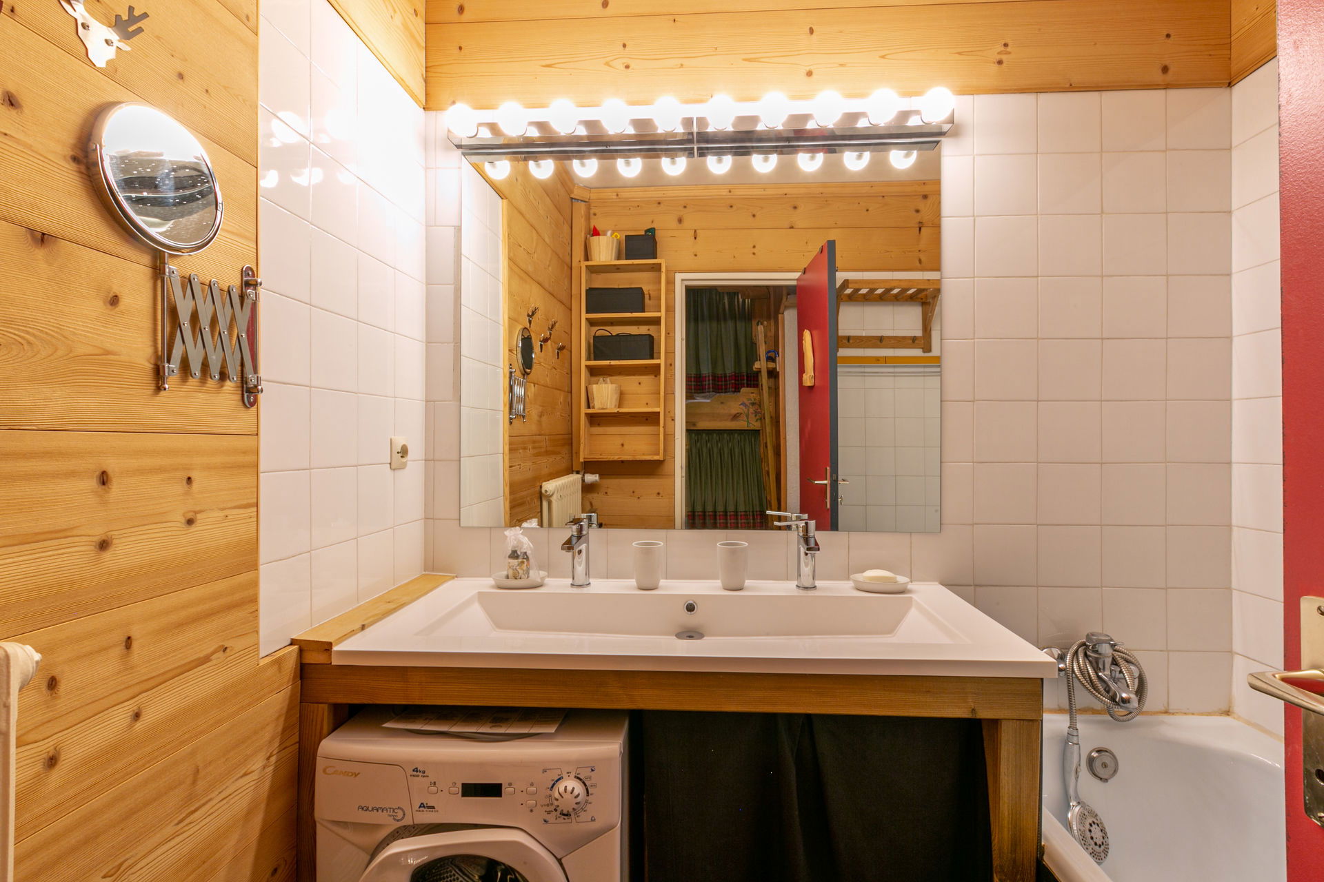 Bathroom with double sink and washing machine