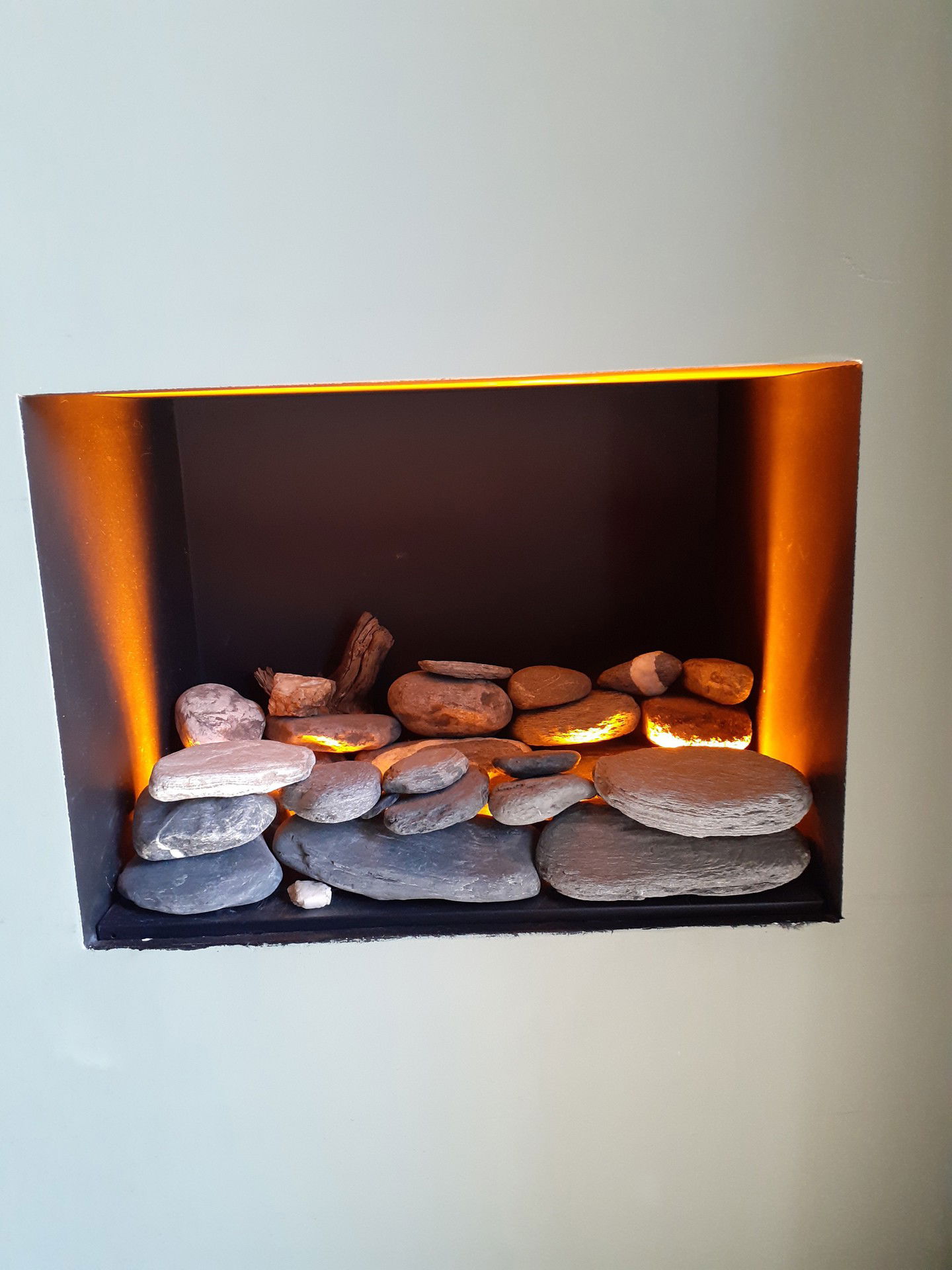 Imitation fire place with orange light mist giving the impression of flames and a warm atmosphere