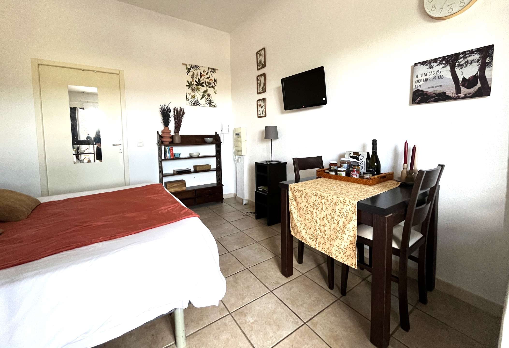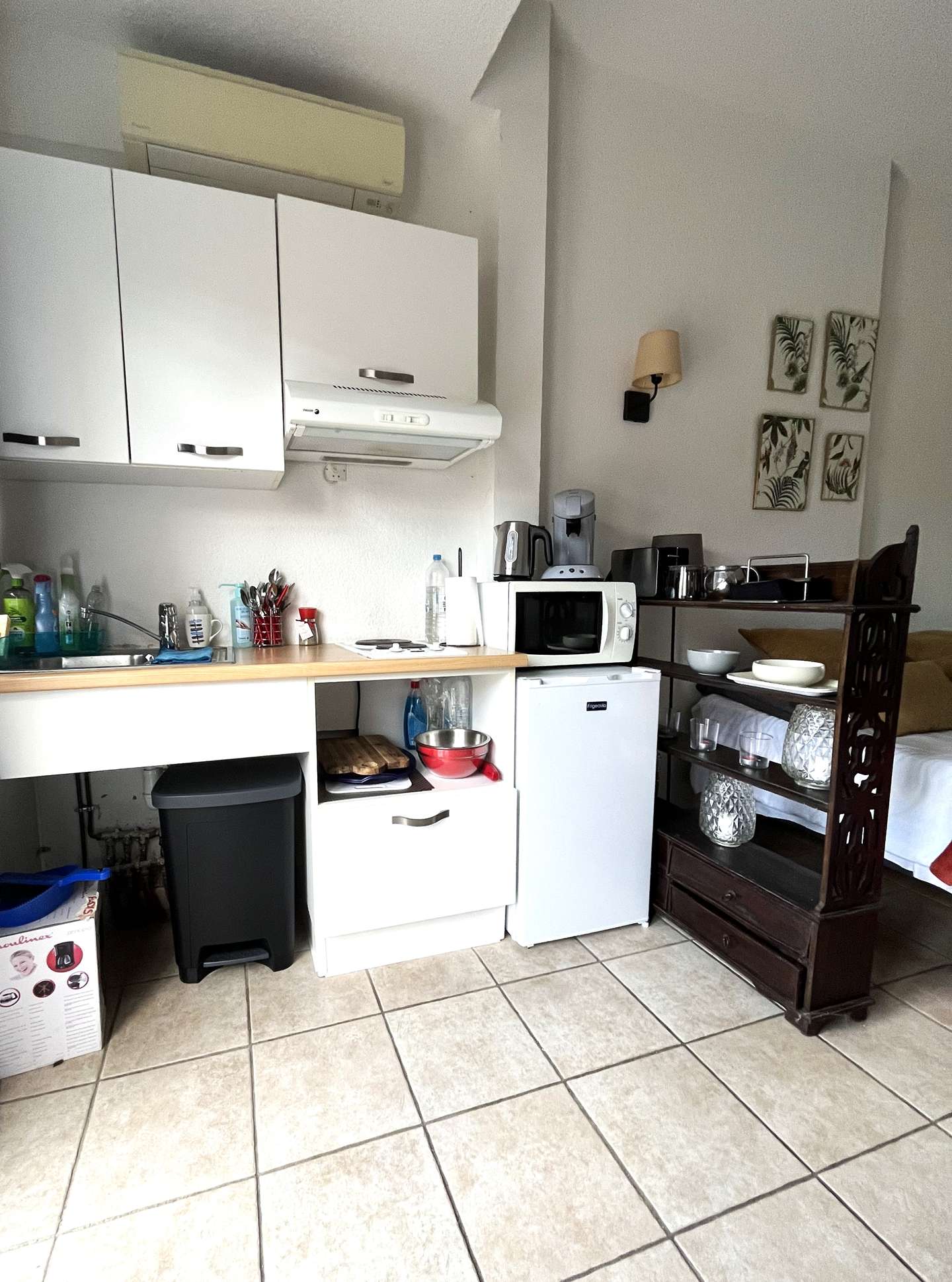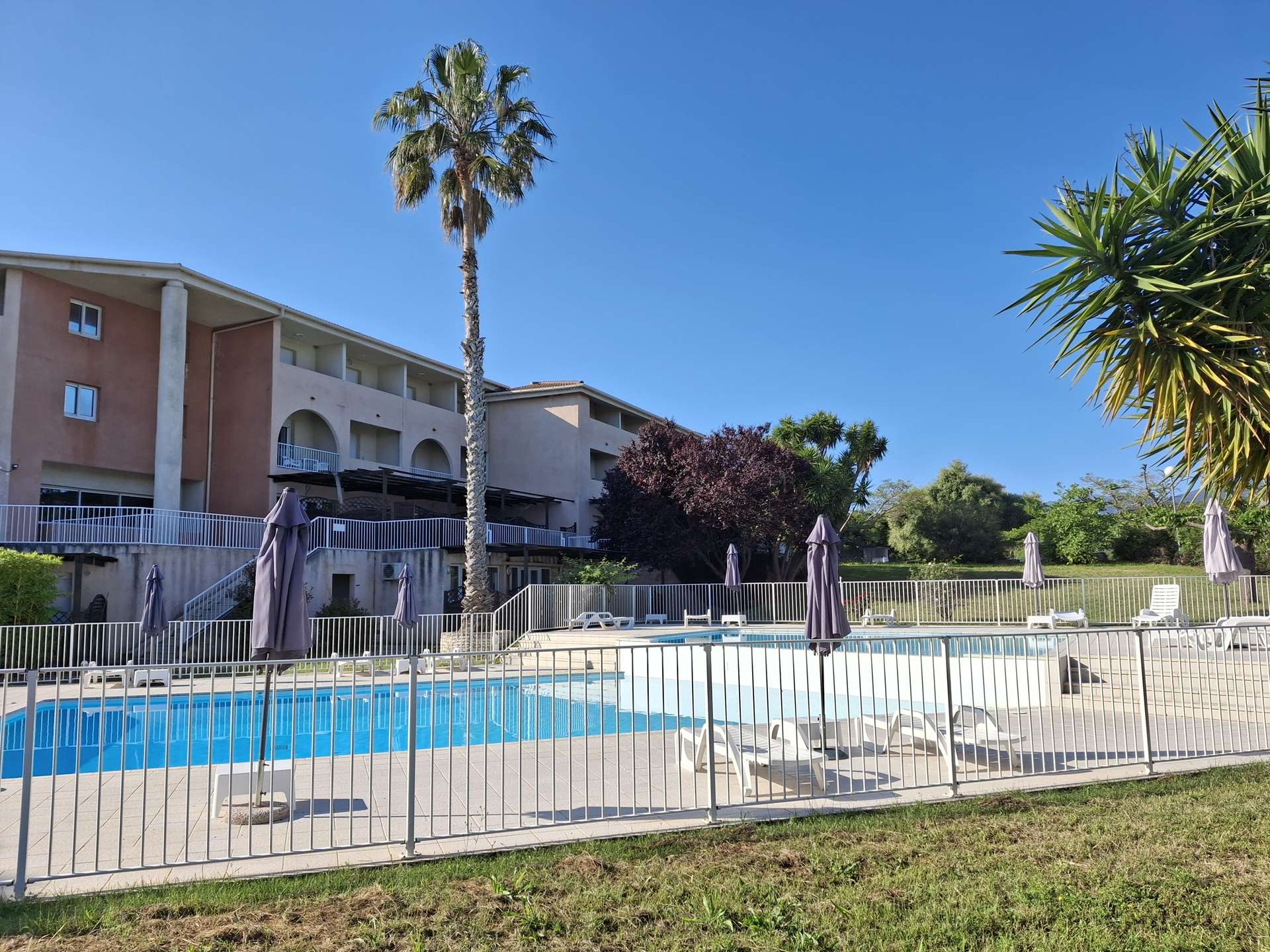 Studio located on the ground floor of a secure residence including a main room with kitchen and dining area, a sleeping area, flat screen TV, reversible air conditioning; a bathroom with shower and WC, a terrace equipped with outdoor furniture overlooking the residence's swimming pool, west facing.