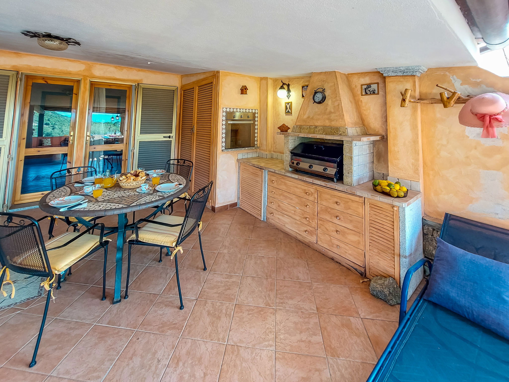 "Fusco", 4-room house 110 m2, on the upper ground floor. Comfortable and cosy furnishings: living/dining room with 1 sofabed and TV. Exit to the terrace. 1 double bedroom with TV. 2 rooms, each room with 1 double sofabed. Exit to the veranda. Open kitchen (oven, 4 gas rings, toaster, kettle, microwave). Exit to the veranda. 2 showers/bidet/WC. Air-conditioning, forced-air heating (extra). Large terrace roofed, terrace partly roofed. Terrace furniture, barbecue, sitting area. Panoramic view of the sea and the countryside. Facilities: washing machine, iron, children's high chair, baby cot (extra), hair dryer. Parking (roofed). Maximum 1 pet/ dog allowed. IT090047C2000R9827