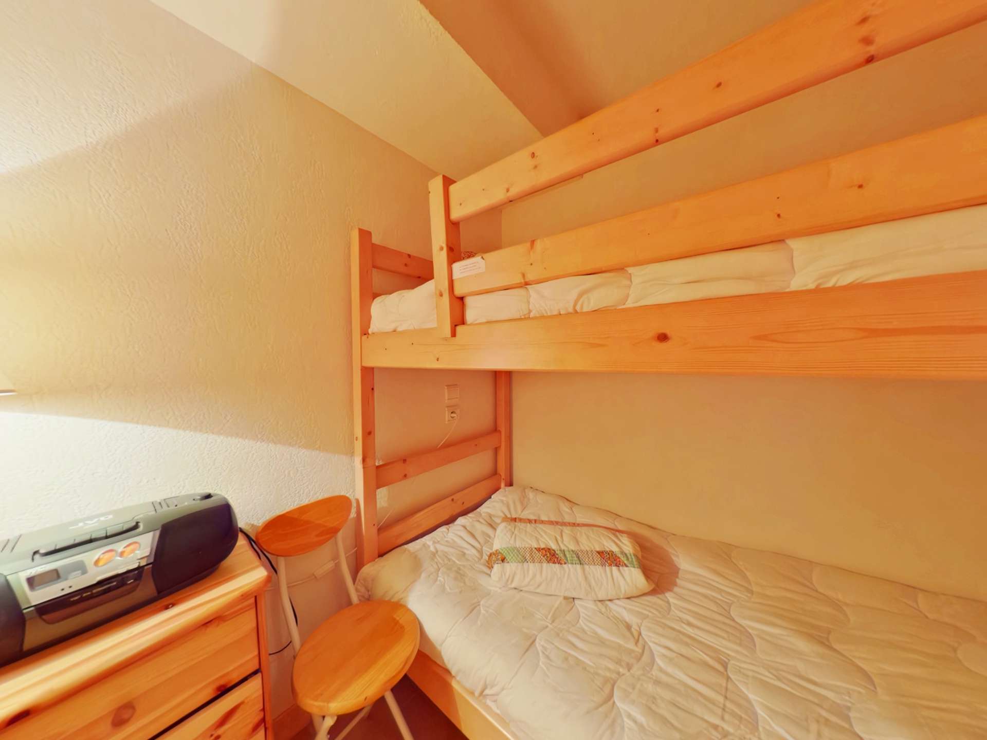 The apartment has a living room with a 140cm sofa bed, a bedroom with a 140cm bed, a cabin with 2x90cm bunk beds (NB: the top bunk bed is not suitable for children under 6), and a shower room with non-separate WC. The kitchen opens onto the living room.